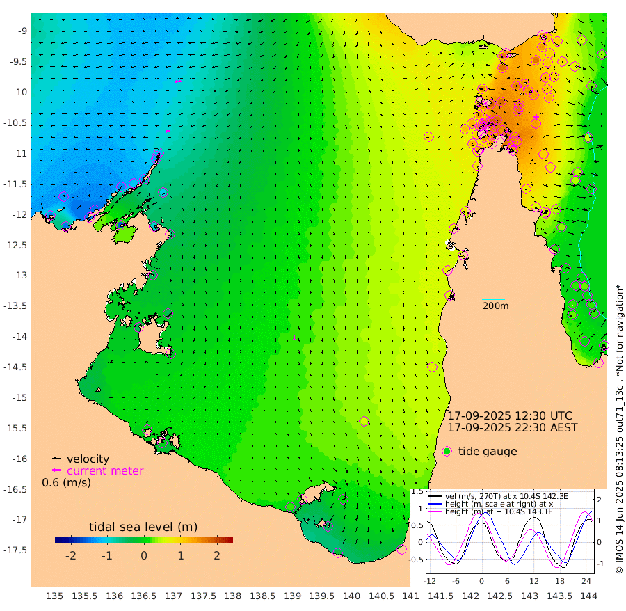 32cm/s -97T +3cm/s rms + 7cm/s -42T. ARA-GOC87 57m 32cm/s 176T +3cm/s rms + 2cm/s -2T. ARA-GOC87 60m 42cm/s -100T +2cm/s rms + 3cm/s 61T. ARA-GOC87 47m 136cm Daru 114cm Bobo Island 30cm Meer Island Barge 59cm Bramble Cay 104cm Unnamed Cay 108cm Pearce Cay 90cm Stephens Island 100cm Merrie England Shoals 136cm Mutacomal Reef 73cm Darnley Island Barge 37cm East Cay 101cm Yorke Island Barge 123cm Rennel Island 112cm Aureed Island 145cm Dungeness Reef 147cm Zagai Island 162cm Yam Island 160cm Dauan Island 139cm Saibai Island 169cm Phipi Reef 166cm Warrior Reef - West 146cm Mabuiag Island Barge 122cm Half Way Island 141cm Coconut Island 142cm Dugong Islet 158cm Poll Island 163cm Kirkcaldie Reef 180cm Suarji Island 148cm Sue Islet 142cm Hawkesbury Island 182cm Alert Patches 176cm Twin Island 143cm Badu Island 185cm St Pauls (Moa Island) 149cm Kubin (Moa Island) 169cm Ince Point 164cm Thursday Island 165cm Nardana Patches 156cm Turtle Head 130cm Round Island 133cm Goods Island 119cm Booby Island 124cm White Rocks Area 83cm Carpentaria 154cm Papou Point 106cm Bampfield Head 98cm Crab Island 125cm Red Wallis Island 148cm Packe Island 156cm Harrington Reef 128cm Herald Camp 56cm Sharp Point 136cm Red Island Point 147cm Possession Island 155cm Alpha Rock 166cm Frederick Point 137cm Wyborn Reef Light 145cm Tetley Island 48cm Triangle Reef 141cm Turtle Head Island 44cm Maclennan Cay 11cm Raine Island 99cm Mcsweeny Reef 80cm Collette Reef 39cm Shadwell Reef 81cm Hannibal Island 64cm Round Point 89cm Vrilya Point 56cm Cape Grenville 46cm Hicks Island 44cm Sir Charles Hardy Island 18cm Harvey Island 32cm Kay Reef 20cm Rocky Island 8cm Chapman Island 8cm Ham Reef 17cm Jubilee Reef 24cm Night Island 13cm Unnamed Reef No. 3 20cm Morris Island 18cm 1st 3 Mile Opening 20cm Creech Reef 23cm Fife Island 3cm Eden Reef 18cm Stanley Island 17cm Normanby River -138cm Yabooma Island -150cm Hutchison River -144cm Elcho Island -131cm North West Crocodile Island -117cm Cape Wessel -139cm Stevens Island -105cm Guluwuru Island -139cm Hopeful Bay -120cm Auster Point -124cm Two Island Bay -144cm Cadell Strait -158cm Mallison Island -94cm Melville Bay (Gove Harbour) -101cm Truant Island -66cm Cape Arnhem -48cm Cape Grey -40cm Hawk Island -43cm Milner Bay (Groote Eylandt) -21cm Cape Beatrice 4cm West Island -4cm Centre Island 18cm Mornington Island 20cm West Wellesley Islands 9cm Bountiful Island -26cm Albert River Mouth -47cm Sweers Island -6cm Karumba 53cm Nassau River Offshore 72cm Christmas Creek 63cm Archer River 70cm Boyd Point 69cm Weipa (Humbug Point) 68cm Pennefather River 79cm Cullen Point