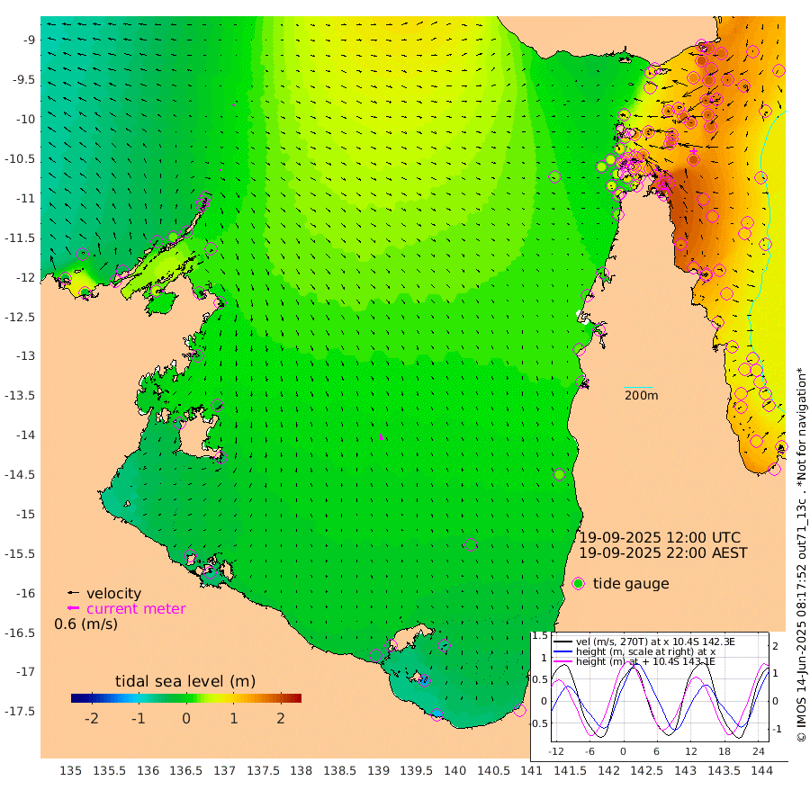 6cm/s 165T +3cm/s rms + 7cm/s -42T. ARA-GOC87 57m 34cm/s 169T +3cm/s rms + 2cm/s -2T. ARA-GOC87 60m 9cm/s -113T +2cm/s rms + 3cm/s 61T. ARA-GOC87 47m 184cm Daru 182cm Bobo Island 104cm Meer Island Barge 141cm Bramble Cay 172cm Unnamed Cay 185cm Pearce Cay 168cm Stephens Island 173cm Merrie England Shoals 188cm Mutacomal Reef 150cm Darnley Island Barge 119cm East Cay 164cm Yorke Island Barge 180cm Rennel Island 173cm Aureed Island 175cm Dungeness Reef 140cm Zagai Island 151cm Yam Island 95cm Dauan Island 85cm Saibai Island 105cm Phipi Reef 151cm Warrior Reef - West 85cm Mabuiag Island Barge 179cm Half Way Island 177cm Coconut Island 189cm Dugong Islet 169cm Poll Island 175cm Kirkcaldie Reef 152cm Suarji Island 156cm Sue Islet 85cm Hawkesbury Island 150cm Alert Patches 157cm Twin Island 71cm Badu Island 150cm St Pauls (Moa Island) 100cm Kubin (Moa Island) 126cm Ince Point 112cm Thursday Island 114cm Nardana Patches 98cm Turtle Head 75cm Round Island 69cm Goods Island 44cm Booby Island 58cm White Rocks Area 23cm Carpentaria 132cm Papou Point 45cm Bampfield Head 29cm Crab Island 57cm Red Wallis Island 95cm Packe Island 204cm Harrington Reef 66cm Herald Camp 38cm Sharp Point 89cm Red Island Point 113cm Possession Island 147cm Alpha Rock 176cm Frederick Point 187cm Wyborn Reef Light 185cm Tetley Island 105cm Triangle Reef 200cm Turtle Head Island 110cm Maclennan Cay 73cm Raine Island 165cm Mcsweeny Reef 147cm Collette Reef 100cm Shadwell Reef 158cm Hannibal Island 149cm Round Point 23cm Vrilya Point 131cm Cape Grenville 121cm Hicks Island 121cm Sir Charles Hardy Island 41cm Harvey Island 111cm Kay Reef 90cm Rocky Island 80cm Chapman Island 77cm Ham Reef 86cm Jubilee Reef 87cm Night Island 83cm Unnamed Reef No. 3 95cm Morris Island 78cm 1st 3 Mile Opening 89cm Creech Reef 102cm Fife Island 94cm Eden Reef 94cm Stanley Island 111cm Normanby River -26cm Yabooma Island -17cm Hutchison River -35cm Elcho Island -31cm North West Crocodile Island 5cm Cape Wessel -16cm Stevens Island 23cm Guluwuru Island -26cm Hopeful Bay -7cm Auster Point -1cm Two Island Bay 12cm Cadell Strait 47cm Mallison Island 14cm Melville Bay (Gove Harbour) 18cm Truant Island 9cm Cape Arnhem -9cm Cape Grey -15cm Hawk Island -54cm Milner Bay (Groote Eylandt) -42cm Cape Beatrice -54cm West Island -65cm Centre Island -44cm Mornington Island -42cm West Wellesley Islands -62cm Bountiful Island -115cm Albert River Mouth -128cm Sweers Island -95cm Karumba -4cm Nassau River Offshore 23cm Christmas Creek 20cm Archer River 30cm Boyd Point 22cm Weipa (Humbug Point) 19cm Pennefather River 21cm Cullen Point