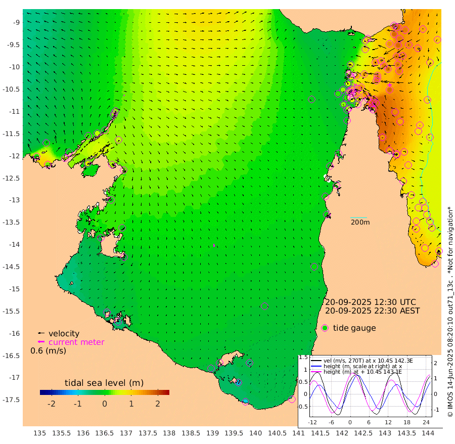 7cm/s 121T +3cm/s rms + 7cm/s -42T. ARA-GOC87 57m 29cm/s 170T +3cm/s rms + 2cm/s -2T. ARA-GOC87 60m 2cm/s -95T +2cm/s rms + 3cm/s 61T. ARA-GOC87 47m 173cm Daru 174cm Bobo Island 94cm Meer Island Barge 130cm Bramble Cay 158cm Unnamed Cay 173cm Pearce Cay 155cm Stephens Island 158cm Merrie England Shoals 176cm Mutacomal Reef 138cm Darnley Island Barge 109cm East Cay 153cm Yorke Island Barge 167cm Rennel Island 163cm Aureed Island 163cm Dungeness Reef 136cm Zagai Island 143cm Yam Island 94cm Dauan Island 85cm Saibai Island 99cm Phipi Reef 147cm Warrior Reef - West 76cm Mabuiag Island Barge 165cm Half Way Island 166cm Coconut Island 173cm Dugong Islet 159cm Poll Island 159cm Kirkcaldie Reef 142cm Suarji Island 145cm Sue Islet 62cm Hawkesbury Island 133cm Alert Patches 143cm Twin Island 51cm Badu Island 138cm St Pauls (Moa Island) 83cm Kubin (Moa Island) 111cm Ince Point 94cm Thursday Island 97cm Nardana Patches 77cm Turtle Head 58cm Round Island 44cm Goods Island 15cm Booby Island 30cm White Rocks Area -4cm Carpentaria 121cm Papou Point 21cm Bampfield Head 3cm Crab Island 30cm Red Wallis Island 74cm Packe Island 189cm Harrington Reef 44cm Herald Camp 35cm Sharp Point 69cm Red Island Point 99cm Possession Island 137cm Alpha Rock 163cm Frederick Point 177cm Wyborn Reef Light 176cm Tetley Island 97cm Triangle Reef 184cm Turtle Head Island 99cm Maclennan Cay 62cm Raine Island 152cm Mcsweeny Reef 134cm Collette Reef 89cm Shadwell Reef 145cm Hannibal Island 138cm Round Point -6cm Vrilya Point 118cm Cape Grenville 110cm Hicks Island 109cm Sir Charles Hardy Island 37cm Harvey Island 98cm Kay Reef 80cm Rocky Island 71cm Chapman Island 68cm Ham Reef 75cm Jubilee Reef 77cm Night Island 72cm Unnamed Reef No. 3 83cm Morris Island 65cm 1st 3 Mile Opening 77cm Creech Reef 93cm Fife Island 83cm Eden Reef 81cm Stanley Island 98cm Normanby River 7cm Yabooma Island 24cm Hutchison River 1cm Elcho Island 3cm North West Crocodile Island 35cm Cape Wessel 19cm Stevens Island 52cm Guluwuru Island 7cm Hopeful Bay 22cm Auster Point 31cm Two Island Bay 50cm Cadell Strait 83cm Mallison Island 42cm Melville Bay (Gove Harbour) 47cm Truant Island 29cm Cape Arnhem 4cm Cape Grey -1cm Hawk Island -45cm Milner Bay (Groote Eylandt) -37cm Cape Beatrice -56cm West Island -67cm Centre Island -44cm Mornington Island -44cm West Wellesley Islands -59cm Bountiful Island -102cm Albert River Mouth -113cm Sweers Island -87cm Karumba -12cm Nassau River Offshore 8cm Christmas Creek 2cm Archer River 11cm Boyd Point 2cm Weipa (Humbug Point) -4cm Pennefather River -1cm Cullen Point