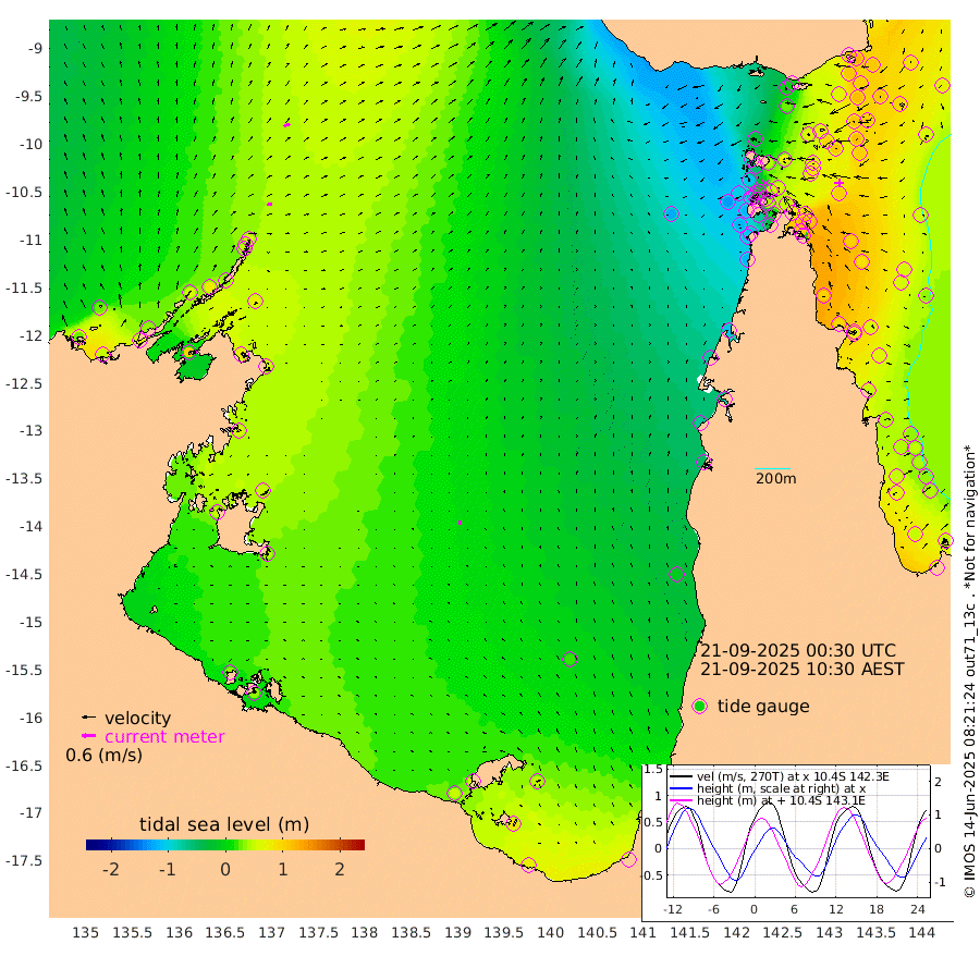 25cm/s 75T +3cm/s rms + 7cm/s -42T. ARA-GOC87 57m 17cm/s -4T +3cm/s rms + 2cm/s -2T. ARA-GOC87 60m 30cm/s 68T +2cm/s rms + 3cm/s 61T. ARA-GOC87 47m 113cm Daru 125cm Bobo Island 59cm Meer Island Barge 87cm Bramble Cay 103cm Unnamed Cay 117cm Pearce Cay 105cm Stephens Island 107cm Merrie England Shoals 110cm Mutacomal Reef 92cm Darnley Island Barge 71cm East Cay 99cm Yorke Island Barge 106cm Rennel Island 113cm Aureed Island 97cm Dungeness Reef 74cm Zagai Island 61cm Yam Island -4cm Dauan Island -3cm Saibai Island 26cm Phipi Reef 67cm Warrior Reef - West -19cm Mabuiag Island Barge 102cm Half Way Island 110cm Coconut Island 99cm Dugong Islet 86cm Poll Island 83cm Kirkcaldie Reef 73cm Suarji Island 71cm Sue Islet -109cm Hawkesbury Island 42cm Alert Patches 53cm Twin Island -77cm Badu Island 45cm St Pauls (Moa Island) -55cm Kubin (Moa Island) 7cm Ince Point -17cm Thursday Island -12cm Nardana Patches -44cm Turtle Head -67cm Round Island -94cm Goods Island -129cm Booby Island -103cm White Rocks Area -121cm Carpentaria 39cm Papou Point -113cm Bampfield Head -107cm Crab Island -115cm Red Wallis Island -69cm Packe Island 122cm Harrington Reef -115cm Herald Camp 14cm Sharp Point -37cm Red Island Point 9cm Possession Island 52cm Alpha Rock 82cm Frederick Point 111cm Wyborn Reef Light 104cm Tetley Island 53cm Triangle Reef 111cm Turtle Head Island 55cm Maclennan Cay 37cm Raine Island 100cm Mcsweeny Reef 90cm Collette Reef 54cm Shadwell Reef 101cm Hannibal Island 91cm Round Point -113cm Vrilya Point 74cm Cape Grenville 70cm Hicks Island 55cm Sir Charles Hardy Island 24cm Harvey Island 60cm Kay Reef 46cm Rocky Island 39cm Chapman Island 33cm Ham Reef 42cm Jubilee Reef 46cm Night Island 39cm Unnamed Reef No. 3 51cm Morris Island 37cm 1st 3 Mile Opening 44cm Creech Reef 61cm Fife Island 50cm Eden Reef 46cm Stanley Island 62cm Normanby River 23cm Yabooma Island 51cm Hutchison River 34cm Elcho Island 27cm North West Crocodile Island 53cm Cape Wessel 53cm Stevens Island 76cm Guluwuru Island 37cm Hopeful Bay 48cm Auster Point 37cm Two Island Bay 67cm Cadell Strait 99cm Mallison Island 69cm Melville Bay (Gove Harbour) 72cm Truant Island 56cm Cape Arnhem 53cm Cape Grey 48cm Hawk Island 47cm Milner Bay (Groote Eylandt) 41cm Cape Beatrice 34cm West Island 35cm Centre Island 53cm Mornington Island 50cm West Wellesley Islands 52cm Bountiful Island 69cm Albert River Mouth 87cm Sweers Island 62cm Karumba 17cm Nassau River Offshore -15cm Christmas Creek -52cm Archer River -68cm Boyd Point -78cm Weipa (Humbug Point) -70cm Pennefather River -108cm Cullen Point