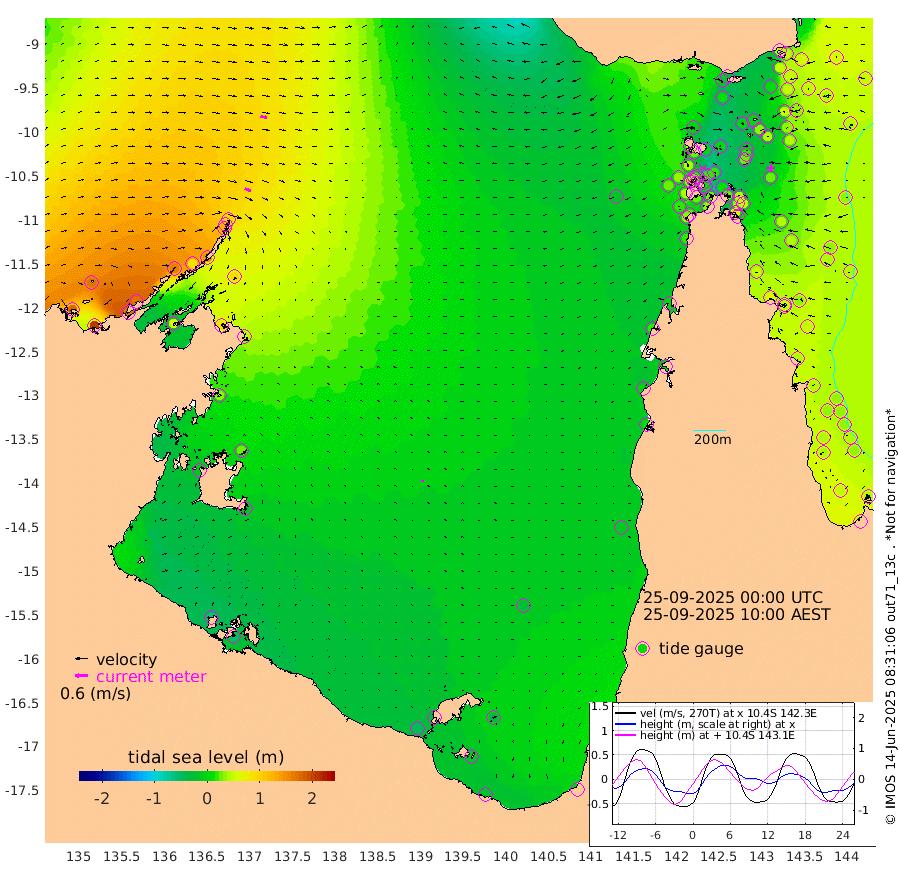 30cm/s 115T +3cm/s rms + 7cm/s -42T. ARA-GOC87 57m 10cm/s -21T +3cm/s rms + 2cm/s -2T. ARA-GOC87 60m 31cm/s 104T +2cm/s rms + 3cm/s 61T. ARA-GOC87 47m 43cm Daru 45cm Bobo Island 38cm Meer Island Barge 54cm Bramble Cay 51cm Unnamed Cay 52cm Pearce Cay 48cm Stephens Island 58cm Merrie England Shoals 46cm Mutacomal Reef 38cm Darnley Island Barge 47cm East Cay 33cm Yorke Island Barge 45cm Rennel Island 31cm Aureed Island 32cm Dungeness Reef 6cm Zagai Island 7cm Yam Island -13cm Dauan Island -23cm Saibai Island 14cm Phipi Reef 3cm Warrior Reef - West -1cm Mabuiag Island Barge 38cm Half Way Island 39cm Coconut Island 28cm Dugong Islet 22cm Poll Island 26cm Kirkcaldie Reef 6cm Suarji Island 11cm Sue Islet 43cm Hawkesbury Island 19cm Alert Patches 16cm Twin Island 40cm Badu Island 6cm St Pauls (Moa Island) 27cm Kubin (Moa Island) 13cm Ince Point 14cm Thursday Island 13cm Nardana Patches 25cm Turtle Head 40cm Round Island 35cm Goods Island 27cm Booby Island 33cm White Rocks Area -19cm Carpentaria 14cm Papou Point 42cm Bampfield Head 31cm Crab Island 21cm Red Wallis Island 28cm Packe Island 37cm Harrington Reef 25cm Herald Camp -8cm Sharp Point 32cm Red Island Point 28cm Possession Island 9cm Alpha Rock 26cm Frederick Point 48cm Wyborn Reef Light 42cm Tetley Island 32cm Triangle Reef 60cm Turtle Head Island 32cm Maclennan Cay 41cm Raine Island 44cm Mcsweeny Reef 45cm Collette Reef 39cm Shadwell Reef 52cm Hannibal Island 62cm Round Point 17cm Vrilya Point 45cm Cape Grenville 47cm Hicks Island 32cm Sir Charles Hardy Island 13cm Harvey Island 47cm Kay Reef 40cm Rocky Island 41cm Chapman Island 34cm Ham Reef 37cm Jubilee Reef 34cm Night Island 36cm Unnamed Reef No. 3 44cm Morris Island 38cm 1st 3 Mile Opening 36cm Creech Reef 42cm Fife Island 48cm Eden Reef 42cm Stanley Island 49cm Normanby River 177cm Yabooma Island 205cm Hutchison River 172cm Elcho Island 165cm North West Crocodile Island 96cm Cape Wessel 164cm Stevens Island 84cm Guluwuru Island 148cm Hopeful Bay 125cm Auster Point 118cm Two Island Bay 169cm Cadell Strait 57cm Mallison Island 87cm Melville Bay (Gove Harbour) 90cm Truant Island 51cm Cape Arnhem 31cm Cape Grey 23cm Hawk Island -8cm Milner Bay (Groote Eylandt) -18cm Cape Beatrice -62cm West Island -59cm Centre Island -36cm Mornington Island -47cm West Wellesley Islands -33cm Bountiful Island -19cm Albert River Mouth -11cm Sweers Island -9cm Karumba -23cm Nassau River Offshore -15cm Christmas Creek 9cm Archer River -3cm Boyd Point 8cm Weipa (Humbug Point) 19cm Pennefather River 3cm Cullen Point