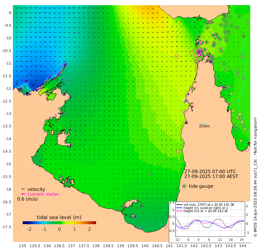 12cm/s -91T +3cm/s rms + 7cm/s -42T. ARA-GOC87 57m 21cm/s 153T +3cm/s rms + 2cm/s -2T. ARA-GOC87 60m 19cm/s -99T +2cm/s rms + 3cm/s 61T. ARA-GOC87 47m 2cm Daru 5cm Bobo Island 20cm Meer Island Barge 11cm Bramble Cay 7cm Unnamed Cay 8cm Pearce Cay 10cm Stephens Island 8cm Merrie England Shoals 4cm Mutacomal Reef 20cm Darnley Island Barge 20cm East Cay 16cm Yorke Island Barge 5cm Rennel Island 17cm Aureed Island 6cm Dungeness Reef 5cm Zagai Island 2cm Yam Island 6cm Dauan Island 22cm Saibai Island 3cm Phipi Reef 6cm Warrior Reef - West 15cm Mabuiag Island Barge 7cm Half Way Island 8cm Coconut Island 9cm Dugong Islet 5cm Poll Island 6cm Kirkcaldie Reef 14cm Suarji Island 17cm Sue Islet 23cm Hawkesbury Island 18cm Alert Patches 14cm Twin Island 15cm Badu Island 10cm St Pauls (Moa Island) 12cm Kubin (Moa Island) 15cm Ince Point 20cm Thursday Island 18cm Nardana Patches 20cm Turtle Head 16cm Round Island 25cm Goods Island 39cm Booby Island 28cm White Rocks Area 69cm Carpentaria 5cm Papou Point 44cm Bampfield Head 29cm Crab Island 37cm Red Wallis Island 24cm Packe Island 9cm Harrington Reef 36cm Herald Camp 5cm Sharp Point 21cm Red Island Point 16cm Possession Island 12cm Alpha Rock 11cm Frederick Point 2cm Wyborn Reef Light 2cm Tetley Island 21cm Triangle Reef 0cm Turtle Head Island 22cm Maclennan Cay 19cm Raine Island 13cm Mcsweeny Reef 17cm Collette Reef 21cm Shadwell Reef 15cm Hannibal Island 12cm Round Point 44cm Vrilya Point 21cm Cape Grenville 15cm Hicks Island 28cm Sir Charles Hardy Island 6cm Harvey Island 25cm Kay Reef 23cm Rocky Island 30cm Chapman Island 30cm Ham Reef 24cm Jubilee Reef 21cm Night Island 30cm Unnamed Reef No. 3 21cm Morris Island 22cm 1st 3 Mile Opening 27cm Creech Reef 20cm Fife Island 26cm Eden Reef 26cm Stanley Island 21cm Normanby River -174cm Yabooma Island -203cm Hutchison River -178cm Elcho Island -176cm North West Crocodile Island -92cm Cape Wessel -156cm Stevens Island -78cm Guluwuru Island -132cm Hopeful Bay -113cm Auster Point -120cm Two Island Bay -160cm Cadell Strait 12cm Mallison Island -79cm Melville Bay (Gove Harbour) -79cm Truant Island -47cm Cape Arnhem -37cm Cape Grey -33cm Hawk Island -27cm Milner Bay (Groote Eylandt) -24cm Cape Beatrice 4cm West Island 9cm Centre Island -6cm Mornington Island 0cm West Wellesley Islands -15cm Bountiful Island -74cm Albert River Mouth -62cm Sweers Island -60cm Karumba 14cm Nassau River Offshore 35cm Christmas Creek 42cm Archer River 47cm Boyd Point 41cm Weipa (Humbug Point) 38cm Pennefather River 47cm Cullen Point