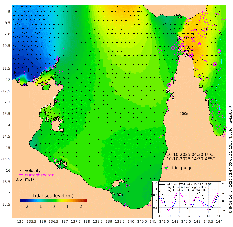 8cm/s 88T +3cm/s rms + 7cm/s -42T. ARA-GOC87 57m 21cm/s 149T +3cm/s rms + 2cm/s -2T. ARA-GOC87 60m 3cm/s -26T +2cm/s rms + 3cm/s 61T. ARA-GOC87 47m 92cm Daru 82cm Bobo Island 34cm Meer Island Barge 42cm Bramble Cay 72cm Unnamed Cay 65cm Pearce Cay 62cm Stephens Island 65cm Merrie England Shoals 85cm Mutacomal Reef 67cm Darnley Island Barge 27cm East Cay 83cm Yorke Island Barge 72cm Rennel Island 83cm Aureed Island 91cm Dungeness Reef 113cm Zagai Island 102cm Yam Island 105cm Dauan Island 108cm Saibai Island 107cm Phipi Reef 115cm Warrior Reef - West 73cm Mabuiag Island Barge 76cm Half Way Island 93cm Coconut Island 86cm Dugong Islet 95cm Poll Island 95cm Kirkcaldie Reef 105cm Suarji Island 105cm Sue Islet -1cm Hawkesbury Island 93cm Alert Patches 93cm Twin Island 23cm Badu Island 103cm St Pauls (Moa Island) 32cm Kubin (Moa Island) 74cm Ince Point 62cm Thursday Island 66cm Nardana Patches 41cm Turtle Head 25cm Round Island 4cm Goods Island -7cm Booby Island -15cm White Rocks Area 20cm Carpentaria 79cm Papou Point 10cm Bampfield Head -5cm Crab Island -6cm Red Wallis Island 22cm Packe Island 91cm Harrington Reef 14cm Herald Camp 39cm Sharp Point 24cm Red Island Point 66cm Possession Island 90cm Alpha Rock 92cm Frederick Point 89cm Wyborn Reef Light 92cm Tetley Island 38cm Triangle Reef 84cm Turtle Head Island 32cm Maclennan Cay 12cm Raine Island 68cm Mcsweeny Reef 62cm Collette Reef 39cm Shadwell Reef 64cm Hannibal Island 37cm Round Point 2cm Vrilya Point 40cm Cape Grenville 33cm Hicks Island 40cm Sir Charles Hardy Island 13cm Harvey Island 25cm Kay Reef 18cm Rocky Island 11cm Chapman Island 13cm Ham Reef 20cm Jubilee Reef 22cm Night Island 13cm Unnamed Reef No. 3 16cm Morris Island 22cm 1st 3 Mile Opening 21cm Creech Reef 14cm Fife Island 12cm Eden Reef 19cm Stanley Island 9cm Normanby River -195cm Yabooma Island -204cm Hutchison River -191cm Elcho Island -194cm North West Crocodile Island -84cm Cape Wessel -149cm Stevens Island -20cm Guluwuru Island -143cm Hopeful Bay -107cm Auster Point -111cm Two Island Bay -134cm Cadell Strait 128cm Mallison Island -36cm Melville Bay (Gove Harbour) -33cm Truant Island -7cm Cape Arnhem -8cm Cape Grey -9cm Hawk Island -11cm Milner Bay (Groote Eylandt) -14cm Cape Beatrice 3cm West Island 8cm Centre Island 8cm Mornington Island 8cm West Wellesley Islands -16cm Bountiful Island -54cm Albert River Mouth -52cm Sweers Island -50cm Karumba 11cm Nassau River Offshore 27cm Christmas Creek 11cm Archer River 20cm Boyd Point 5cm Weipa (Humbug Point) 14cm Pennefather River 7cm Cullen Point