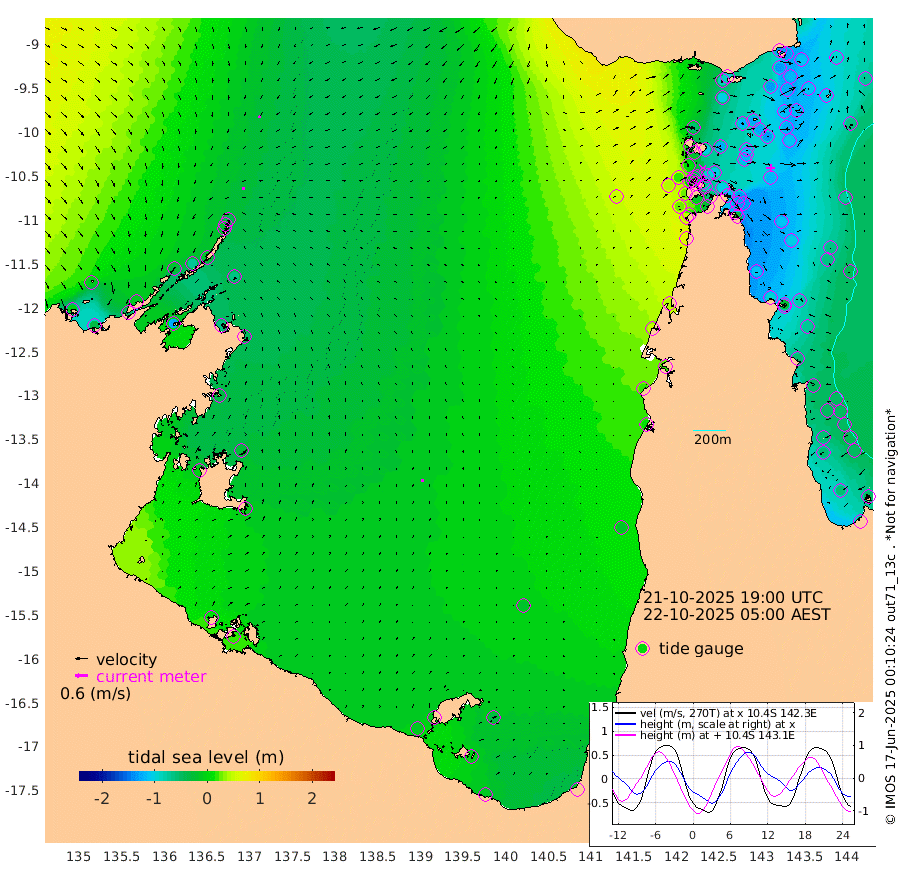 11cm/s -93T +3cm/s rms + 7cm/s -42T. ARA-GOC87 57m 12cm/s -6T +3cm/s rms + 2cm/s -2T. ARA-GOC87 60m 9cm/s -114T +2cm/s rms + 3cm/s 61T. ARA-GOC87 47m -130cm Daru -134cm Bobo Island -65cm Meer Island Barge -93cm Bramble Cay -116cm Unnamed Cay -123cm Pearce Cay -108cm Stephens Island -112cm Merrie England Shoals -131cm Mutacomal Reef -99cm Darnley Island Barge -74cm East Cay -113cm Yorke Island Barge -117cm Rennel Island -126cm Aureed Island -121cm Dungeness Reef -123cm Zagai Island -117cm Yam Island -90cm Dauan Island -92cm Saibai Island -100cm Phipi Reef -130cm Warrior Reef - West -59cm Mabuiag Island Barge -111cm Half Way Island -130cm Coconut Island -119cm Dugong Islet -120cm Poll Island -113cm Kirkcaldie Reef -123cm Suarji Island -112cm Sue Islet 12cm Hawkesbury Island -92cm Alert Patches -102cm Twin Island -15cm Badu Island -101cm St Pauls (Moa Island) -27cm Kubin (Moa Island) -70cm Ince Point -50cm Thursday Island -56cm Nardana Patches -32cm Turtle Head -10cm Round Island 7cm Goods Island 40cm Booby Island 21cm White Rocks Area 48cm Carpentaria -86cm Papou Point 27cm Bampfield Head 46cm Crab Island 28cm Red Wallis Island -17cm Packe Island -132cm Harrington Reef 18cm Herald Camp -29cm Sharp Point -24cm Red Island Point -57cm Possession Island -100cm Alpha Rock -116cm Frederick Point -132cm Wyborn Reef Light -130cm Tetley Island -70cm Triangle Reef -116cm Turtle Head Island -67cm Maclennan Cay -42cm Raine Island -109cm Mcsweeny Reef -98cm Collette Reef -63cm Shadwell Reef -106cm Hannibal Island -94cm Round Point 63cm Vrilya Point -80cm Cape Grenville -75cm Hicks Island -82cm Sir Charles Hardy Island -24cm Harvey Island -68cm Kay Reef -56cm Rocky Island -52cm Chapman Island -45cm Ham Reef -51cm Jubilee Reef -50cm Night Island -49cm Unnamed Reef No. 3 -56cm Morris Island -44cm 1st 3 Mile Opening -50cm Creech Reef -57cm Fife Island -56cm Eden Reef -50cm Stanley Island -61cm Normanby River -7cm Yabooma Island -35cm Hutchison River -13cm Elcho Island -9cm North West Crocodile Island -43cm Cape Wessel -28cm Stevens Island -74cm Guluwuru Island -17cm Hopeful Bay -26cm Auster Point -19cm Two Island Bay -45cm Cadell Strait -125cm Mallison Island -61cm Melville Bay (Gove Harbour) -64cm Truant Island -48cm Cape Arnhem -33cm Cape Grey -24cm Hawk Island -2cm Milner Bay (Groote Eylandt) -1cm Cape Beatrice 13cm West Island 18cm Centre Island -14cm Mornington Island -13cm West Wellesley Islands -32cm Bountiful Island -10cm Albert River Mouth -2cm Sweers Island -4cm Karumba -19cm Nassau River Offshore -17cm Christmas Creek 12cm Archer River 15cm Boyd Point 18cm Weipa (Humbug Point) 46cm Pennefather River 45cm Cullen Point