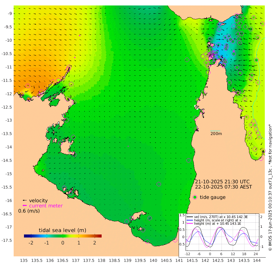 17cm/s 124T +3cm/s rms + 7cm/s -42T. ARA-GOC87 57m 12cm/s -20T +3cm/s rms + 2cm/s -2T. ARA-GOC87 60m 20cm/s 114T +2cm/s rms + 3cm/s 61T. ARA-GOC87 47m -26cm Daru -21cm Bobo Island 25cm Meer Island Barge 25cm Bramble Cay 1cm Unnamed Cay -6cm Pearce Cay 5cm Stephens Island 14cm Merrie England Shoals -19cm Mutacomal Reef 2cm Darnley Island Barge 32cm East Cay -18cm Yorke Island Barge -10cm Rennel Island -29cm Aureed Island -37cm Dungeness Reef -77cm Zagai Island -73cm Yam Island -91cm Dauan Island -94cm Saibai Island -72cm Phipi Reef -85cm Warrior Reef - West -56cm Mabuiag Island Barge -16cm Half Way Island -32cm Coconut Island -32cm Dugong Islet -54cm Poll Island -43cm Kirkcaldie Reef -76cm Suarji Island -57cm Sue Islet 29cm Hawkesbury Island -48cm Alert Patches -56cm Twin Island 9cm Badu Island -72cm St Pauls (Moa Island) -8cm Kubin (Moa Island) -44cm Ince Point -32cm Thursday Island -37cm Nardana Patches -9cm Turtle Head 13cm Round Island 26cm Goods Island 38cm Booby Island 35cm White Rocks Area 10cm Carpentaria -52cm Papou Point 47cm Bampfield Head 43cm Crab Island 26cm Red Wallis Island 3cm Packe Island -32cm Harrington Reef 17cm Herald Camp -32cm Sharp Point 3cm Red Island Point -23cm Possession Island -55cm Alpha Rock -46cm Frederick Point -22cm Wyborn Reef Light -31cm Tetley Island 10cm Triangle Reef -5cm Turtle Head Island 18cm Maclennan Cay 42cm Raine Island -2cm Mcsweeny Reef 8cm Collette Reef 26cm Shadwell Reef 13cm Hannibal Island 32cm Round Point 41cm Vrilya Point 26cm Cape Grenville 28cm Hicks Island 16cm Sir Charles Hardy Island 6cm Harvey Island 40cm Kay Reef 37cm Rocky Island 42cm Chapman Island 38cm Ham Reef 36cm Jubilee Reef 29cm Night Island 39cm Unnamed Reef No. 3 41cm Morris Island 39cm 1st 3 Mile Opening 36cm Creech Reef 39cm Fife Island 51cm Eden Reef 45cm Stanley Island 47cm Normanby River 147cm Yabooma Island 160cm Hutchison River 143cm Elcho Island 136cm North West Crocodile Island 66cm Cape Wessel 126cm Stevens Island 43cm Guluwuru Island 121cm Hopeful Bay 95cm Auster Point 88cm Two Island Bay 118cm Cadell Strait 16cm Mallison Island 48cm Melville Bay (Gove Harbour) 50cm Truant Island 22cm Cape Arnhem 13cm Cape Grey 6cm Hawk Island -12cm Milner Bay (Groote Eylandt) -17cm Cape Beatrice -50cm West Island -46cm Centre Island -38cm Mornington Island -44cm West Wellesley Islands -42cm Bountiful Island -25cm Albert River Mouth -18cm Sweers Island -17cm Karumba -28cm Nassau River Offshore -17cm Christmas Creek 21cm Archer River 11cm Boyd Point 22cm Weipa (Humbug Point) 38cm Pennefather River 22cm Cullen Point