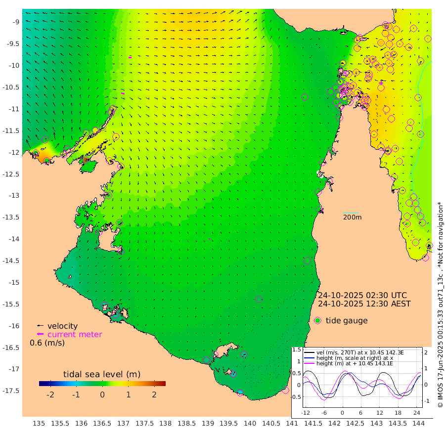32cm/s 106T +3cm/s rms + 7cm/s -42T. ARA-GOC87 57m 14cm/s 148T +3cm/s rms + 2cm/s -2T. ARA-GOC87 60m 26cm/s 95T +2cm/s rms + 3cm/s 61T. ARA-GOC87 47m 98cm Daru 102cm Bobo Island 49cm Meer Island Barge 67cm Bramble Cay 84cm Unnamed Cay 91cm Pearce Cay 75cm Stephens Island 79cm Merrie England Shoals 95cm Mutacomal Reef 76cm Darnley Island Barge 53cm East Cay 87cm Yorke Island Barge 83cm Rennel Island 94cm Aureed Island 91cm Dungeness Reef 109cm Zagai Island 94cm Yam Island 95cm Dauan Island 101cm Saibai Island 103cm Phipi Reef 110cm Warrior Reef - West 73cm Mabuiag Island Barge 76cm Half Way Island 104cm Coconut Island 81cm Dugong Islet 94cm Poll Island 87cm Kirkcaldie Reef 98cm Suarji Island 96cm Sue Islet 36cm Hawkesbury Island 88cm Alert Patches 90cm Twin Island 54cm Badu Island 91cm St Pauls (Moa Island) 48cm Kubin (Moa Island) 71cm Ince Point 61cm Thursday Island 64cm Nardana Patches 50cm Turtle Head 49cm Round Island 28cm Goods Island 10cm Booby Island 11cm White Rocks Area 6cm Carpentaria 81cm Papou Point 40cm Bampfield Head 9cm Crab Island 12cm Red Wallis Island 39cm Packe Island 94cm Harrington Reef 29cm Herald Camp 26cm Sharp Point 47cm Red Island Point 74cm Possession Island 84cm Alpha Rock 95cm Frederick Point 104cm Wyborn Reef Light 106cm Tetley Island 58cm Triangle Reef 97cm Turtle Head Island 46cm Maclennan Cay 34cm Raine Island 79cm Mcsweeny Reef 76cm Collette Reef 53cm Shadwell Reef 80cm Hannibal Island 68cm Round Point 0cm Vrilya Point 56cm Cape Grenville 54cm Hicks Island 57cm Sir Charles Hardy Island 17cm Harvey Island 48cm Kay Reef 41cm Rocky Island 43cm Chapman Island 38cm Ham Reef 39cm Jubilee Reef 36cm Night Island 38cm Unnamed Reef No. 3 39cm Morris Island 34cm 1st 3 Mile Opening 37cm Creech Reef 37cm Fife Island 41cm Eden Reef 36cm Stanley Island 37cm Normanby River -10cm Yabooma Island 15cm Hutchison River -4cm Elcho Island -13cm North West Crocodile Island 42cm Cape Wessel 23cm Stevens Island 80cm Guluwuru Island 17cm Hopeful Bay 30cm Auster Point 22cm Two Island Bay 47cm Cadell Strait 194cm Mallison Island 62cm Melville Bay (Gove Harbour) 71cm Truant Island 52cm Cape Arnhem 22cm Cape Grey 13cm Hawk Island -28cm Milner Bay (Groote Eylandt) -39cm Cape Beatrice -71cm West Island -64cm Centre Island -50cm Mornington Island -58cm West Wellesley Islands -67cm Bountiful Island -98cm Albert River Mouth -95cm Sweers Island -89cm Karumba -34cm Nassau River Offshore -7cm Christmas Creek 5cm Archer River 11cm Boyd Point 3cm Weipa (Humbug Point) 6cm Pennefather River 3cm Cullen Point
