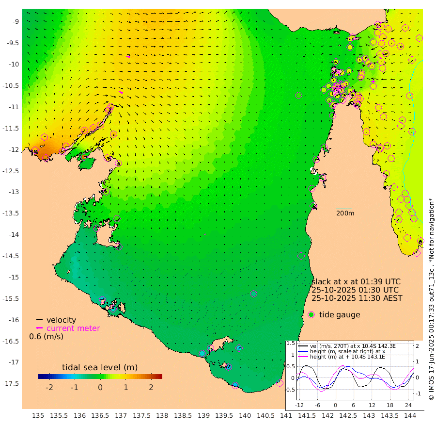 41cm/s 112T +3cm/s rms + 7cm/s -42T. ARA-GOC87 57m 6cm/s 135T +3cm/s rms + 2cm/s -2T. ARA-GOC87 60m 37cm/s 102T +2cm/s rms + 3cm/s 61T. ARA-GOC87 47m 89cm Daru 89cm Bobo Island 55cm Meer Island Barge 73cm Bramble Cay 85cm Unnamed Cay 84cm Pearce Cay 76cm Stephens Island 84cm Merrie England Shoals 89cm Mutacomal Reef 71cm Darnley Island Barge 58cm East Cay 77cm Yorke Island Barge 80cm Rennel Island 76cm Aureed Island 79cm Dungeness Reef 81cm Zagai Island 74cm Yam Island 67cm Dauan Island 61cm Saibai Island 79cm Phipi Reef 78cm Warrior Reef - West 57cm Mabuiag Island Barge 73cm Half Way Island 90cm Coconut Island 72cm Dugong Islet 77cm Poll Island 75cm Kirkcaldie Reef 70cm Suarji Island 73cm Sue Islet 65cm Hawkesbury Island 73cm Alert Patches 73cm Twin Island 71cm Badu Island 72cm St Pauls (Moa Island) 66cm Kubin (Moa Island) 63cm Ince Point 59cm Thursday Island 60cm Nardana Patches 59cm Turtle Head 73cm Round Island 55cm Goods Island 41cm Booby Island 41cm White Rocks Area 15cm Carpentaria 69cm Papou Point 77cm Bampfield Head 36cm Crab Island 37cm Red Wallis Island 58cm Packe Island 81cm Harrington Reef 57cm Herald Camp 13cm Sharp Point 51cm Red Island Point 73cm Possession Island 68cm Alpha Rock 79cm Frederick Point 98cm Wyborn Reef Light 97cm Tetley Island 56cm Triangle Reef 102cm Turtle Head Island 49cm Maclennan Cay 45cm Raine Island 75cm Mcsweeny Reef 73cm Collette Reef 57cm Shadwell Reef 80cm Hannibal Island 76cm Round Point 21cm Vrilya Point 61cm Cape Grenville 61cm Hicks Island 58cm Sir Charles Hardy Island 18cm Harvey Island 56cm Kay Reef 48cm Rocky Island 47cm Chapman Island 42cm Ham Reef 47cm Jubilee Reef 43cm Night Island 41cm Unnamed Reef No. 3 49cm Morris Island 47cm 1st 3 Mile Opening 45cm Creech Reef 43cm Fife Island 53cm Eden Reef 47cm Stanley Island 49cm Normanby River 114cm Yabooma Island 150cm Hutchison River 116cm Elcho Island 102cm North West Crocodile Island 98cm Cape Wessel 126cm Stevens Island 121cm Guluwuru Island 108cm Hopeful Bay 106cm Auster Point 104cm Two Island Bay 145cm Cadell Strait 177cm Mallison Island 105cm Melville Bay (Gove Harbour) 115cm Truant Island 73cm Cape Arnhem 33cm Cape Grey 19cm Hawk Island -32cm Milner Bay (Groote Eylandt) -48cm Cape Beatrice -103cm West Island -96cm Centre Island -85cm Mornington Island -97cm West Wellesley Islands -101cm Bountiful Island -113cm Albert River Mouth -117cm Sweers Island -107cm Karumba -63cm Nassau River Offshore -29cm Christmas Creek 1cm Archer River 10cm Boyd Point 10cm Weipa (Humbug Point) 17cm Pennefather River 17cm Cullen Point
