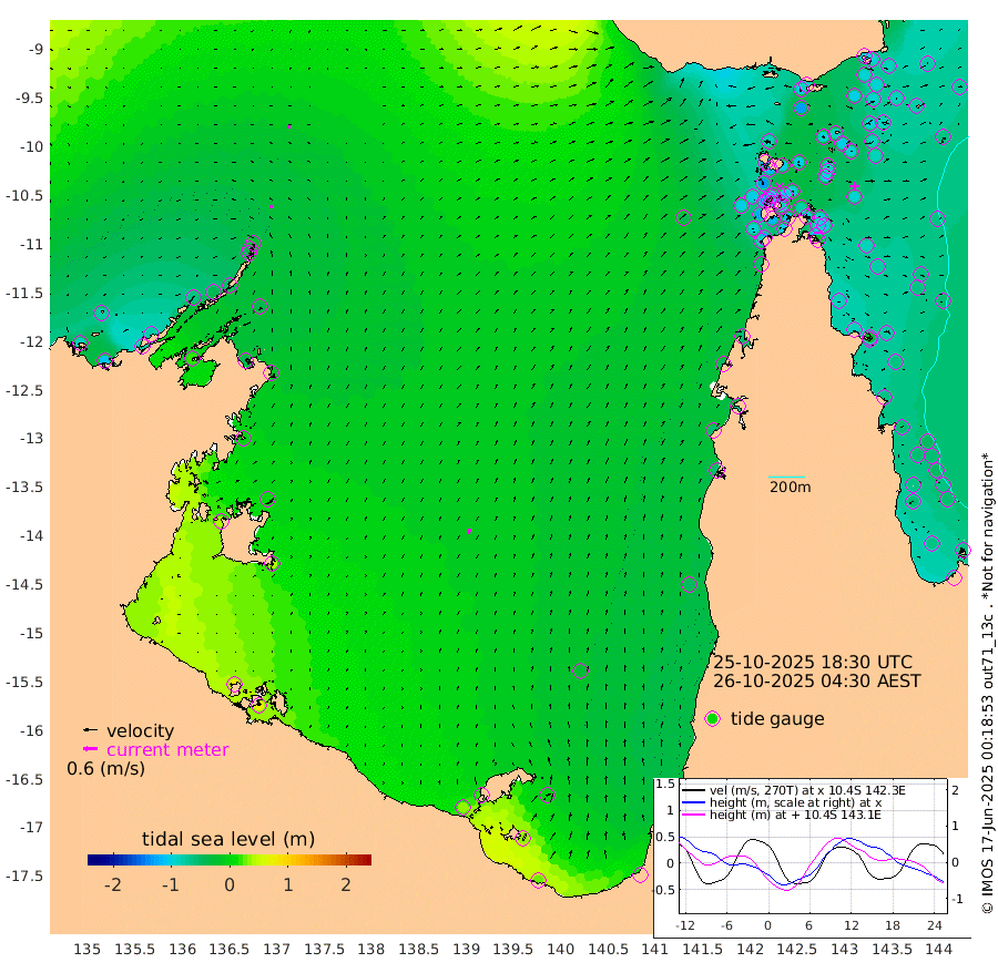 15cm/s -12T +3cm/s rms + 7cm/s -42T. ARA-GOC87 57m 22cm/s 9T +3cm/s rms + 2cm/s -2T. ARA-GOC87 60m 11cm/s -1T +2cm/s rms + 3cm/s 61T. ARA-GOC87 47m -99cm Daru -90cm Bobo Island -65cm Meer Island Barge -80cm Bramble Cay -94cm Unnamed Cay -94cm Pearce Cay -86cm Stephens Island -89cm Merrie England Shoals -95cm Mutacomal Reef -78cm Darnley Island Barge -71cm East Cay -84cm Yorke Island Barge -92cm Rennel Island -83cm Aureed Island -102cm Dungeness Reef -89cm Zagai Island -97cm Yam Island -104cm Dauan Island -84cm Saibai Island -130cm Phipi Reef -102cm Warrior Reef - West -87cm Mabuiag Island Barge -87cm Half Way Island -95cm Coconut Island -91cm Dugong Islet -93cm Poll Island -100cm Kirkcaldie Reef -100cm Suarji Island -85cm Sue Islet -128cm Hawkesbury Island -103cm Alert Patches -97cm Twin Island -126cm Badu Island -99cm St Pauls (Moa Island) -116cm Kubin (Moa Island) -99cm Ince Point -100cm Thursday Island -100cm Nardana Patches -114cm Turtle Head -121cm Round Island -119cm Goods Island -105cm Booby Island -103cm White Rocks Area -40cm Carpentaria -89cm Papou Point -120cm Bampfield Head -83cm Crab Island -93cm Red Wallis Island -113cm Packe Island -94cm Harrington Reef -126cm Herald Camp -19cm Sharp Point -102cm Red Island Point -105cm Possession Island -77cm Alpha Rock -96cm Frederick Point -96cm Wyborn Reef Light -95cm Tetley Island -63cm Triangle Reef -108cm Turtle Head Island -66cm Maclennan Cay -58cm Raine Island -83cm Mcsweeny Reef -79cm Collette Reef -65cm Shadwell Reef -85cm Hannibal Island -83cm Round Point -58cm Vrilya Point -72cm Cape Grenville -76cm Hicks Island -77cm Sir Charles Hardy Island -23cm Harvey Island -66cm Kay Reef -64cm Rocky Island -58cm Chapman Island -52cm Ham Reef -59cm Jubilee Reef -54cm Night Island -52cm Unnamed Reef No. 3 -64cm Morris Island -64cm 1st 3 Mile Opening -60cm Creech Reef -53cm Fife Island -67cm Eden Reef -61cm Stanley Island -64cm Normanby River -87cm Yabooma Island -111cm Hutchison River -78cm Elcho Island -76cm North West Crocodile Island -25cm Cape Wessel -61cm Stevens Island -40cm Guluwuru Island -56cm Hopeful Bay -46cm Auster Point -44cm Two Island Bay -80cm Cadell Strait 20cm Mallison Island -40cm Melville Bay (Gove Harbour) -38cm Truant Island -20cm Cape Arnhem -7cm Cape Grey 1cm Hawk Island 40cm Milner Bay (Groote Eylandt) 39cm Cape Beatrice 70cm West Island 71cm Centre Island 22cm Mornington Island 33cm West Wellesley Islands -6cm Bountiful Island 25cm Albert River Mouth 35cm Sweers Island 6cm Karumba -23cm Nassau River Offshore -50cm Christmas Creek -59cm Archer River -56cm Boyd Point -72cm Weipa (Humbug Point) -46cm Pennefather River -59cm Cullen Point