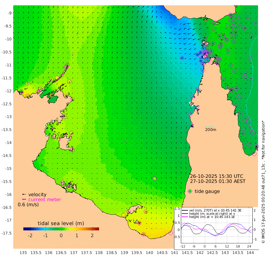 17cm/s 39T +3cm/s rms + 7cm/s -42T. ARA-GOC87 57m 12cm/s -47T +3cm/s rms + 2cm/s -2T. ARA-GOC87 60m 23cm/s 36T +2cm/s rms + 3cm/s 61T. ARA-GOC87 47m -16cm Daru -16cm Bobo Island -33cm Meer Island Barge -27cm Bramble Cay -24cm Unnamed Cay -27cm Pearce Cay -33cm Stephens Island -26cm Merrie England Shoals -18cm Mutacomal Reef -25cm Darnley Island Barge -40cm East Cay -19cm Yorke Island Barge -31cm Rennel Island -21cm Aureed Island -25cm Dungeness Reef 0cm Zagai Island -16cm Yam Island 1cm Dauan Island 10cm Saibai Island -2cm Phipi Reef 2cm Warrior Reef - West -34cm Mabuiag Island Barge -32cm Half Way Island -26cm Coconut Island -31cm Dugong Islet -24cm Poll Island -33cm Kirkcaldie Reef -33cm Suarji Island -14cm Sue Islet -133cm Hawkesbury Island -51cm Alert Patches -47cm Twin Island -101cm Badu Island -39cm St Pauls (Moa Island) -104cm Kubin (Moa Island) -63cm Ince Point -81cm Thursday Island -74cm Nardana Patches -99cm Turtle Head -120cm Round Island -134cm Goods Island -159cm Booby Island -152cm White Rocks Area -150cm Carpentaria -42cm Papou Point -183cm Bampfield Head -136cm Crab Island -151cm Red Wallis Island -126cm Packe Island -38cm Harrington Reef -158cm Herald Camp 1cm Sharp Point -90cm Red Island Point -79cm Possession Island -31cm Alpha Rock -40cm Frederick Point -23cm Wyborn Reef Light -23cm Tetley Island -31cm Triangle Reef -44cm Turtle Head Island -42cm Maclennan Cay -41cm Raine Island -28cm Mcsweeny Reef -25cm Collette Reef -30cm Shadwell Reef -25cm Hannibal Island -37cm Round Point -134cm Vrilya Point -39cm Cape Grenville -40cm Hicks Island -40cm Sir Charles Hardy Island -13cm Harvey Island -40cm Kay Reef -39cm Rocky Island -40cm Chapman Island -40cm Ham Reef -37cm Jubilee Reef -39cm Night Island -43cm Unnamed Reef No. 3 -42cm Morris Island -46cm 1st 3 Mile Opening -44cm Creech Reef -41cm Fife Island -42cm Eden Reef -44cm Stanley Island -44cm Normanby River 14cm Yabooma Island 35cm Hutchison River 32cm Elcho Island 32cm North West Crocodile Island 30cm Cape Wessel 42cm Stevens Island 65cm Guluwuru Island 32cm Hopeful Bay 25cm Auster Point 26cm Two Island Bay 60cm Cadell Strait 145cm Mallison Island 53cm Melville Bay (Gove Harbour) 48cm Truant Island 42cm Cape Arnhem 49cm Cape Grey 51cm Hawk Island 56cm Milner Bay (Groote Eylandt) 57cm Cape Beatrice 56cm West Island 50cm Centre Island 80cm Mornington Island 81cm West Wellesley Islands 105cm Bountiful Island 155cm Albert River Mouth 161cm Sweers Island 132cm Karumba 37cm Nassau River Offshore -11cm Christmas Creek -56cm Archer River -77cm Boyd Point -83cm Weipa (Humbug Point) -87cm Pennefather River -121cm Cullen Point