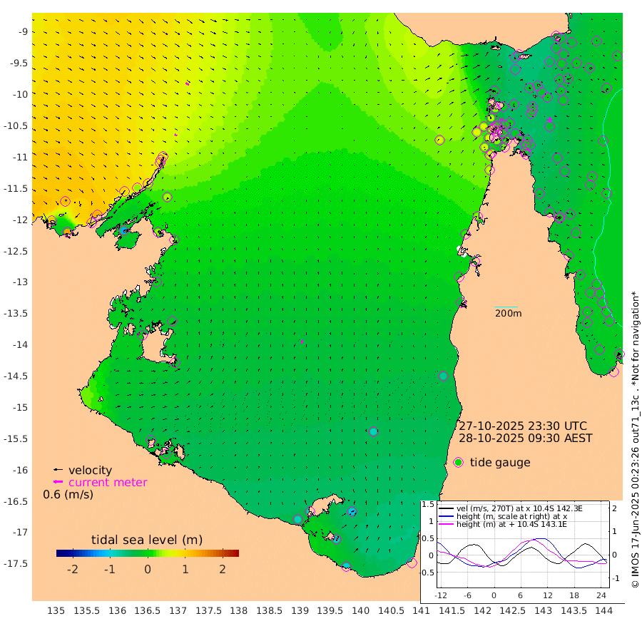 17cm/s 126T +3cm/s rms + 7cm/s -42T. ARA-GOC87 57m 25cm/s 9T +3cm/s rms + 2cm/s -2T. ARA-GOC87 60m 24cm/s 123T +2cm/s rms + 3cm/s 61T. ARA-GOC87 47m -27cm Daru -18cm Bobo Island -14cm Meer Island Barge -19cm Bramble Cay -25cm Unnamed Cay -14cm Pearce Cay -15cm Stephens Island -25cm Merrie England Shoals -30cm Mutacomal Reef -24cm Darnley Island Barge -11cm East Cay -27cm Yorke Island Barge -15cm Rennel Island -20cm Aureed Island -20cm Dungeness Reef -26cm Zagai Island -20cm Yam Island -45cm Dauan Island -51cm Saibai Island -49cm Phipi Reef -40cm Warrior Reef - West -11cm Mabuiag Island Barge -12cm Half Way Island -12cm Coconut Island -17cm Dugong Islet -14cm Poll Island -13cm Kirkcaldie Reef -10cm Suarji Island -29cm Sue Islet 38cm Hawkesbury Island -7cm Alert Patches -2cm Twin Island 31cm Badu Island -6cm St Pauls (Moa Island) 32cm Kubin (Moa Island) 6cm Ince Point 16cm Thursday Island 13cm Nardana Patches 22cm Turtle Head 37cm Round Island 46cm Goods Island 62cm Booby Island 66cm White Rocks Area 64cm Carpentaria 9cm Papou Point 73cm Bampfield Head 56cm Crab Island 58cm Red Wallis Island 35cm Packe Island -7cm Harrington Reef 40cm Herald Camp -12cm Sharp Point 24cm Red Island Point 17cm Possession Island -13cm Alpha Rock -7cm Frederick Point -19cm Wyborn Reef Light -18cm Tetley Island -16cm Triangle Reef 1cm Turtle Head Island -9cm Maclennan Cay -5cm Raine Island -21cm Mcsweeny Reef -26cm Collette Reef -21cm Shadwell Reef -27cm Hannibal Island -16cm Round Point 52cm Vrilya Point -18cm Cape Grenville -11cm Hicks Island -21cm Sir Charles Hardy Island -4cm Harvey Island -18cm Kay Reef -14cm Rocky Island -16cm Chapman Island -14cm Ham Reef -12cm Jubilee Reef -10cm Night Island -12cm Unnamed Reef No. 3 -10cm Morris Island -4cm 1st 3 Mile Opening -10cm Creech Reef -13cm Fife Island -13cm Eden Reef -14cm Stanley Island -9cm Normanby River 120cm Yabooma Island 134cm Hutchison River 120cm Elcho Island 115cm North West Crocodile Island 72cm Cape Wessel 95cm Stevens Island 32cm Guluwuru Island 78cm Hopeful Bay 82cm Auster Point 84cm Two Island Bay 85cm Cadell Strait -126cm Mallison Island 32cm Melville Bay (Gove Harbour) 41cm Truant Island 17cm Cape Arnhem 4cm Cape Grey -11cm Hawk Island -7cm Milner Bay (Groote Eylandt) -18cm Cape Beatrice -36cm West Island -32cm Centre Island -83cm Mornington Island -85cm West Wellesley Islands -105cm Bountiful Island -91cm Albert River Mouth -102cm Sweers Island -98cm Karumba -85cm Nassau River Offshore -68cm Christmas Creek -26cm Archer River -5cm Boyd Point -5cm Weipa (Humbug Point) 17cm Pennefather River 31cm Cullen Point