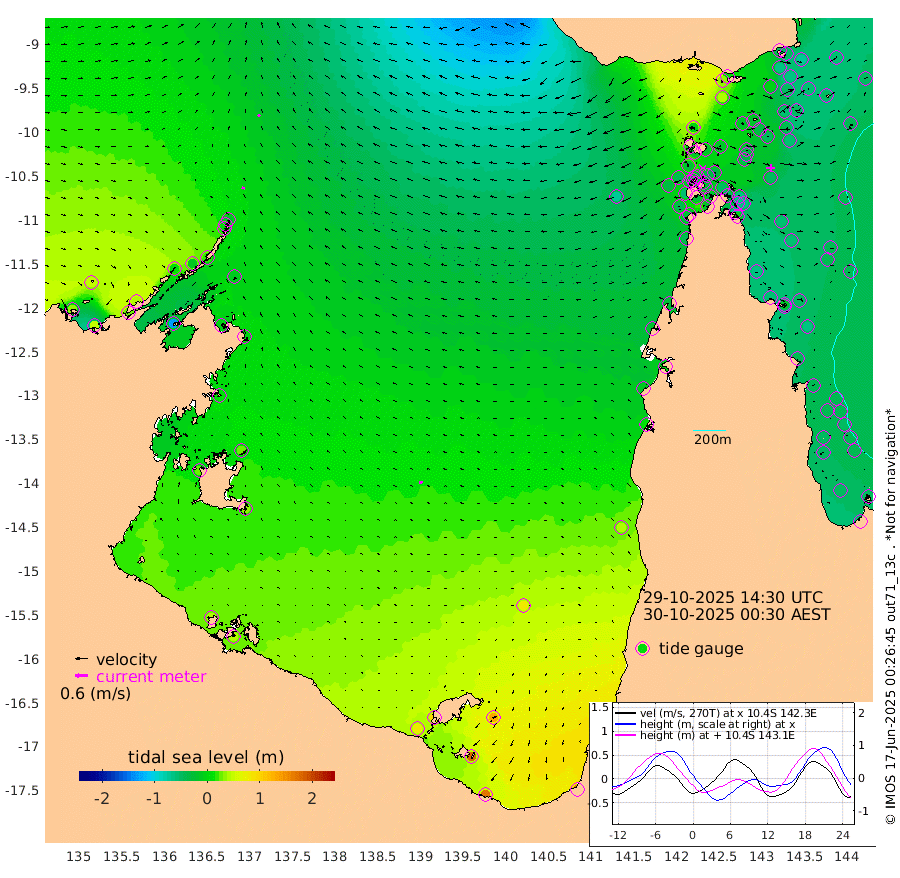 14cm/s -77T +3cm/s rms + 7cm/s -42T. ARA-GOC87 57m 16cm/s -98T +3cm/s rms + 2cm/s -2T. ARA-GOC87 60m 12cm/s -57T +2cm/s rms + 3cm/s 61T. ARA-GOC87 47m -48cm Daru -50cm Bobo Island -41cm Meer Island Barge -54cm Bramble Cay -60cm Unnamed Cay -46cm Pearce Cay -55cm Stephens Island -69cm Merrie England Shoals -63cm Mutacomal Reef -51cm Darnley Island Barge -50cm East Cay -48cm Yorke Island Barge -54cm Rennel Island -44cm Aureed Island -31cm Dungeness Reef -16cm Zagai Island -21cm Yam Island 31cm Dauan Island 11cm Saibai Island 45cm Phipi Reef -3cm Warrior Reef - West -7cm Mabuiag Island Barge -53cm Half Way Island -50cm Coconut Island -50cm Dugong Islet -34cm Poll Island -41cm Kirkcaldie Reef -18cm Suarji Island -37cm Sue Islet -25cm Hawkesbury Island -31cm Alert Patches -35cm Twin Island -13cm Badu Island -22cm St Pauls (Moa Island) -20cm Kubin (Moa Island) -26cm Ince Point -27cm Thursday Island -24cm Nardana Patches -19cm Turtle Head -22cm Round Island -24cm Goods Island -35cm Booby Island -40cm White Rocks Area -70cm Carpentaria -28cm Papou Point -57cm Bampfield Head -31cm Crab Island -40cm Red Wallis Island -29cm Packe Island -60cm Harrington Reef -25cm Herald Camp -3cm Sharp Point -21cm Red Island Point -23cm Possession Island -48cm Alpha Rock -46cm Frederick Point -64cm Wyborn Reef Light -61cm Tetley Island -38cm Triangle Reef -61cm Turtle Head Island -43cm Maclennan Cay -38cm Raine Island -57cm Mcsweeny Reef -55cm Collette Reef -44cm Shadwell Reef -60cm Hannibal Island -60cm Round Point -42cm Vrilya Point -58cm Cape Grenville -47cm Hicks Island -52cm Sir Charles Hardy Island -16cm Harvey Island -60cm Kay Reef -42cm Rocky Island -44cm Chapman Island -45cm Ham Reef -44cm Jubilee Reef -38cm Night Island -49cm Unnamed Reef No. 3 -46cm Morris Island -39cm 1st 3 Mile Opening -44cm Creech Reef -48cm Fife Island -46cm Eden Reef -51cm Stanley Island -54cm Normanby River 33cm Yabooma Island 49cm Hutchison River 43cm Elcho Island 48cm North West Crocodile Island -21cm Cape Wessel 10cm Stevens Island -15cm Guluwuru Island 16cm Hopeful Bay 0cm Auster Point 6cm Two Island Bay 30cm Cadell Strait -128cm Mallison Island -3cm Melville Bay (Gove Harbour) -14cm Truant Island -5cm Cape Arnhem 10cm Cape Grey 27cm Hawk Island 28cm Milner Bay (Groote Eylandt) 37cm Cape Beatrice 40cm West Island 41cm Centre Island 93cm Mornington Island 82cm West Wellesley Islands 129cm Bountiful Island 170cm Albert River Mouth 177cm Sweers Island 172cm Karumba 78cm Nassau River Offshore 43cm Christmas Creek 9cm Archer River -11cm Boyd Point 1cm Weipa (Humbug Point) -21cm Pennefather River -29cm Cullen Point
