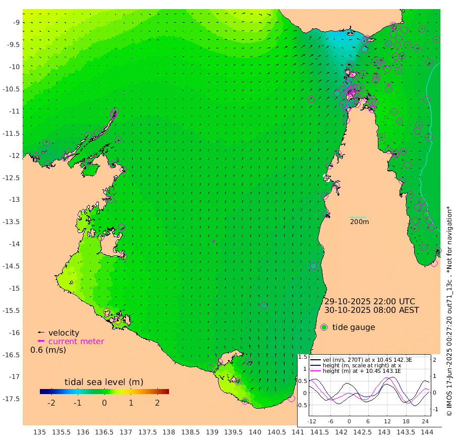 9cm/s 6T +3cm/s rms + 7cm/s -42T. ARA-GOC87 57m 32cm/s 10T +3cm/s rms + 2cm/s -2T. ARA-GOC87 60m 9cm/s 59T +2cm/s rms + 3cm/s 61T. ARA-GOC87 47m -10cm Daru -1cm Bobo Island -22cm Meer Island Barge -12cm Bramble Cay -8cm Unnamed Cay -10cm Pearce Cay -9cm Stephens Island 0cm Merrie England Shoals -2cm Mutacomal Reef -16cm Darnley Island Barge -13cm East Cay -14cm Yorke Island Barge -5cm Rennel Island -8cm Aureed Island -21cm Dungeness Reef -23cm Zagai Island -26cm Yam Island -79cm Dauan Island -55cm Saibai Island -73cm Phipi Reef -42cm Warrior Reef - West -34cm Mabuiag Island Barge -8cm Half Way Island 1cm Coconut Island -12cm Dugong Islet -13cm Poll Island -12cm Kirkcaldie Reef -13cm Suarji Island -13cm Sue Islet -59cm Hawkesbury Island -16cm Alert Patches -13cm Twin Island -56cm Badu Island -22cm St Pauls (Moa Island) -53cm Kubin (Moa Island) -27cm Ince Point -31cm Thursday Island -32cm Nardana Patches -49cm Turtle Head -45cm Round Island -58cm Goods Island -53cm Booby Island -38cm White Rocks Area -13cm Carpentaria -11cm Papou Point -37cm Bampfield Head -39cm Crab Island -46cm Red Wallis Island -56cm Packe Island 7cm Harrington Reef -68cm Herald Camp -3cm Sharp Point -27cm Red Island Point -20cm Possession Island -4cm Alpha Rock -5cm Frederick Point 3cm Wyborn Reef Light 2cm Tetley Island -19cm Triangle Reef -1cm Turtle Head Island -19cm Maclennan Cay -20cm Raine Island -6cm Mcsweeny Reef -8cm Collette Reef -19cm Shadwell Reef -8cm Hannibal Island -8cm Round Point -30cm Vrilya Point -9cm Cape Grenville -16cm Hicks Island -27cm Sir Charles Hardy Island -4cm Harvey Island -9cm Kay Reef -20cm Rocky Island -20cm Chapman Island -18cm Ham Reef -20cm Jubilee Reef -19cm Night Island -15cm Unnamed Reef No. 3 -18cm Morris Island -26cm 1st 3 Mile Opening -21cm Creech Reef -14cm Fife Island -27cm Eden Reef -19cm Stanley Island -14cm Normanby River -16cm Yabooma Island -20cm Hutchison River -8cm Elcho Island -8cm North West Crocodile Island 12cm Cape Wessel 1cm Stevens Island -16cm Guluwuru Island -3cm Hopeful Bay 5cm Auster Point -9cm Two Island Bay -32cm Cadell Strait -38cm Mallison Island -12cm Melville Bay (Gove Harbour) -8cm Truant Island -6cm Cape Arnhem 11cm Cape Grey 7cm Hawk Island 35cm Milner Bay (Groote Eylandt) 28cm Cape Beatrice 45cm West Island 48cm Centre Island -7cm Mornington Island -4cm West Wellesley Islands -26cm Bountiful Island -18cm Albert River Mouth 1cm Sweers Island -23cm Karumba -49cm Nassau River Offshore -64cm Christmas Creek -52cm Archer River -48cm Boyd Point -62cm Weipa (Humbug Point) -30cm Pennefather River -44cm Cullen Point