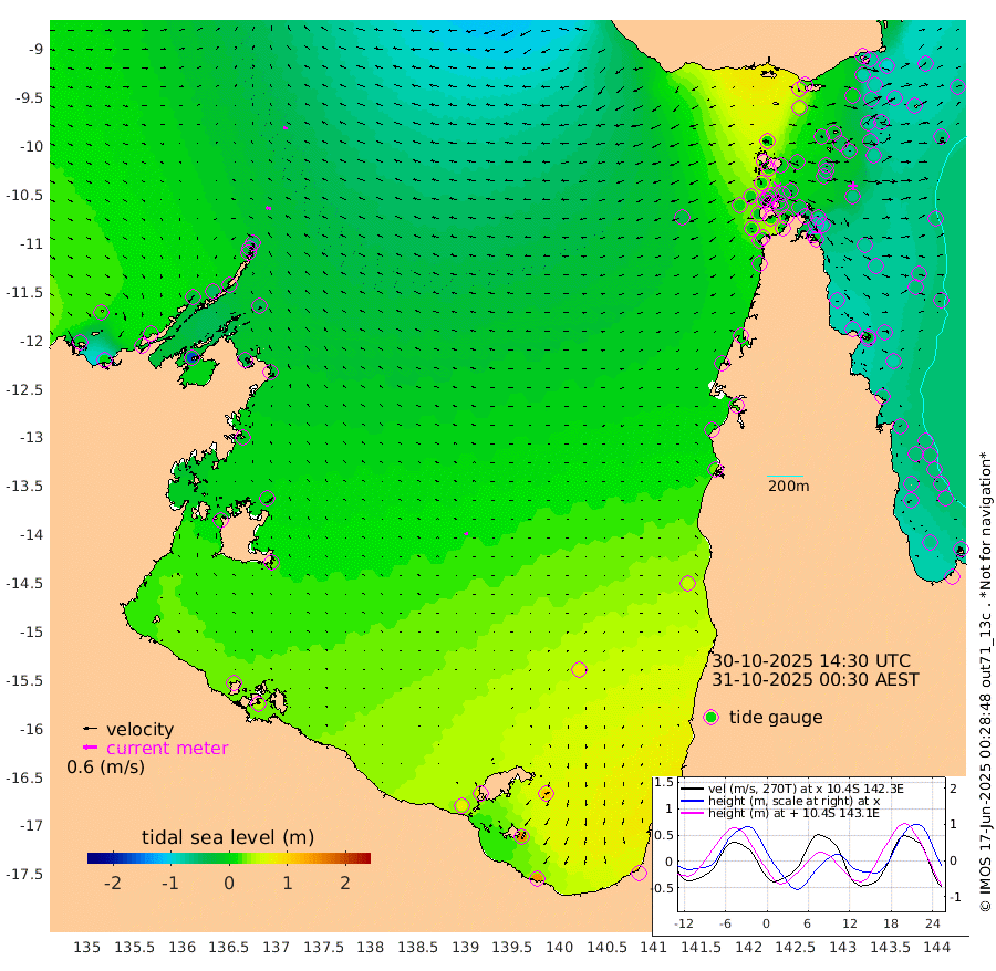 21cm/s -87T +3cm/s rms + 7cm/s -42T. ARA-GOC87 57m 15cm/s -110T +3cm/s rms + 2cm/s -2T. ARA-GOC87 60m 19cm/s -82T +2cm/s rms + 3cm/s 61T. ARA-GOC87 47m -65cm Daru -68cm Bobo Island -58cm Meer Island Barge -75cm Bramble Cay -82cm Unnamed Cay -64cm Pearce Cay -75cm Stephens Island -91cm Merrie England Shoals -80cm Mutacomal Reef -71cm Darnley Island Barge -67cm East Cay -67cm Yorke Island Barge -70cm Rennel Island -58cm Aureed Island -43cm Dungeness Reef -19cm Zagai Island -23cm Yam Island 41cm Dauan Island 19cm Saibai Island 48cm Phipi Reef -4cm Warrior Reef - West 6cm Mabuiag Island Barge -69cm Half Way Island -60cm Coconut Island -64cm Dugong Islet -39cm Poll Island -49cm Kirkcaldie Reef -14cm Suarji Island -44cm Sue Islet 1cm Hawkesbury Island -24cm Alert Patches -29cm Twin Island 10cm Badu Island -15cm St Pauls (Moa Island) 2cm Kubin (Moa Island) -12cm Ince Point -9cm Thursday Island -7cm Nardana Patches 2cm Turtle Head 0cm Round Island 5cm Goods Island 1cm Booby Island -7cm White Rocks Area -32cm Carpentaria -23cm Papou Point -22cm Bampfield Head 1cm Crab Island -2cm Red Wallis Island 2cm Packe Island -73cm Harrington Reef 6cm Herald Camp -1cm Sharp Point -5cm Red Island Point -12cm Possession Island -45cm Alpha Rock -48cm Frederick Point -79cm Wyborn Reef Light -72cm Tetley Island -48cm Triangle Reef -79cm Turtle Head Island -56cm Maclennan Cay -50cm Raine Island -74cm Mcsweeny Reef -73cm Collette Reef -59cm Shadwell Reef -81cm Hannibal Island -78cm Round Point -10cm Vrilya Point -75cm Cape Grenville -65cm Hicks Island -68cm Sir Charles Hardy Island -21cm Harvey Island -77cm Kay Reef -57cm Rocky Island -56cm Chapman Island -57cm Ham Reef -59cm Jubilee Reef -49cm Night Island -59cm Unnamed Reef No. 3 -61cm Morris Island -53cm 1st 3 Mile Opening -57cm Creech Reef -61cm Fife Island -64cm Eden Reef -67cm Stanley Island -73cm Normanby River 0cm Yabooma Island 7cm Hutchison River 9cm Elcho Island 16cm North West Crocodile Island -46cm Cape Wessel -24cm Stevens Island -51cm Guluwuru Island -13cm Hopeful Bay -29cm Auster Point -23cm Two Island Bay -14cm Cadell Strait -171cm Mallison Island -33cm Melville Bay (Gove Harbour) -45cm Truant Island -26cm Cape Arnhem -12cm Cape Grey 12cm Hawk Island 17cm Milner Bay (Groote Eylandt) 28cm Cape Beatrice 37cm West Island 41cm Centre Island 85cm Mornington Island 74cm West Wellesley Islands 110cm Bountiful Island 149cm Albert River Mouth 150cm Sweers Island 153cm Karumba 78cm Nassau River Offshore 50cm Christmas Creek 23cm Archer River 8cm Boyd Point 21cm Weipa (Humbug Point) 0cm Pennefather River 3cm Cullen Point
