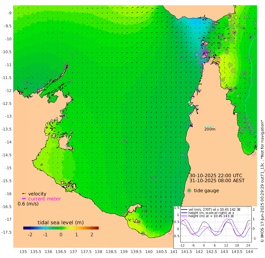 12cm/s 15T +3cm/s rms + 7cm/s -42T. ARA-GOC87 57m 30cm/s 9T +3cm/s rms + 2cm/s -2T. ARA-GOC87 60m 12cm/s 43T +2cm/s rms + 3cm/s 61T. ARA-GOC87 47m 26cm Daru 33cm Bobo Island 0cm Meer Island Barge 18cm Bramble Cay 29cm Unnamed Cay 21cm Pearce Cay 22cm Stephens Island 37cm Merrie England Shoals 36cm Mutacomal Reef 15cm Darnley Island Barge 9cm East Cay 19cm Yorke Island Barge 27cm Rennel Island 22cm Aureed Island 9cm Dungeness Reef 1cm Zagai Island -4cm Yam Island -66cm Dauan Island -42cm Saibai Island -50cm Phipi Reef -17cm Warrior Reef - West -29cm Mabuiag Island Barge 21cm Half Way Island 32cm Coconut Island 18cm Dugong Islet 12cm Poll Island 15cm Kirkcaldie Reef 7cm Suarji Island 15cm Sue Islet -74cm Hawkesbury Island 2cm Alert Patches 4cm Twin Island -67cm Badu Island -7cm St Pauls (Moa Island) -61cm Kubin (Moa Island) -20cm Ince Point -31cm Thursday Island -29cm Nardana Patches -53cm Turtle Head -50cm Round Island -76cm Goods Island -80cm Booby Island -65cm White Rocks Area -43cm Carpentaria 1cm Papou Point -55cm Bampfield Head -63cm Crab Island -75cm Red Wallis Island -69cm Packe Island 39cm Harrington Reef -83cm Herald Camp 4cm Sharp Point -32cm Red Island Point -10cm Possession Island 16cm Alpha Rock 19cm Frederick Point 39cm Wyborn Reef Light 36cm Tetley Island -1cm Triangle Reef 34cm Turtle Head Island -1cm Maclennan Cay -7cm Raine Island 26cm Mcsweeny Reef 24cm Collette Reef 4cm Shadwell Reef 27cm Hannibal Island 22cm Round Point -54cm Vrilya Point 18cm Cape Grenville 8cm Hicks Island -5cm Sir Charles Hardy Island 4cm Harvey Island 15cm Kay Reef -2cm Rocky Island -4cm Chapman Island -4cm Ham Reef -3cm Jubilee Reef -3cm Night Island -1cm Unnamed Reef No. 3 0cm Morris Island -10cm 1st 3 Mile Opening -5cm Creech Reef 3cm Fife Island -9cm Eden Reef 1cm Stanley Island 6cm Normanby River -29cm Yabooma Island -29cm Hutchison River -20cm Elcho Island -21cm North West Crocodile Island 8cm Cape Wessel -2cm Stevens Island -3cm Guluwuru Island -5cm Hopeful Bay 2cm Auster Point -14cm Two Island Bay -32cm Cadell Strait 18cm Mallison Island -1cm Melville Bay (Gove Harbour) 1cm Truant Island 3cm Cape Arnhem 22cm Cape Grey 20cm Hawk Island 42cm Milner Bay (Groote Eylandt) 34cm Cape Beatrice 50cm West Island 53cm Centre Island 13cm Mornington Island 13cm West Wellesley Islands -2cm Bountiful Island 2cm Albert River Mouth 30cm Sweers Island 0cm Karumba -35cm Nassau River Offshore -56cm Christmas Creek -54cm Archer River -57cm Boyd Point -72cm Weipa (Humbug Point) -40cm Pennefather River -64cm Cullen Point