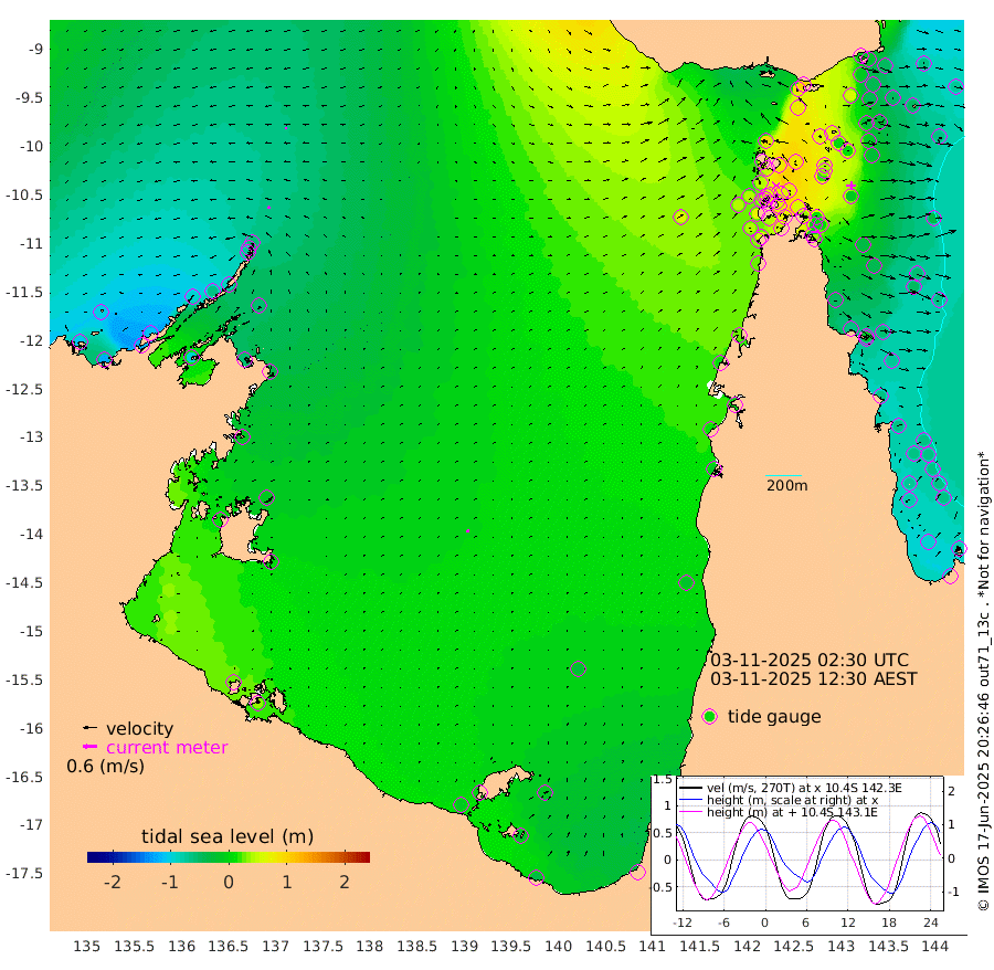11cm/s -68T +3cm/s rms + 7cm/s -42T. ARA-GOC87 57m 15cm/s 27T +3cm/s rms + 2cm/s -2T. ARA-GOC87 60m 8cm/s -87T +2cm/s rms + 3cm/s 61T. ARA-GOC87 47m -12cm Daru -17cm Bobo Island -63cm Meer Island Barge -63cm Bramble Cay -39cm Unnamed Cay -38cm Pearce Cay -51cm Stephens Island -50cm Merrie England Shoals -15cm Mutacomal Reef -48cm Darnley Island Barge -68cm East Cay -25cm Yorke Island Barge -26cm Rennel Island -14cm Aureed Island 3cm Dungeness Reef 64cm Zagai Island 56cm Yam Island 87cm Dauan Island 99cm Saibai Island 80cm Phipi Reef 59cm Warrior Reef - West 90cm Mabuiag Island Barge -30cm Half Way Island 13cm Coconut Island -14cm Dugong Islet 32cm Poll Island 20cm Kirkcaldie Reef 81cm Suarji Island 41cm Sue Islet 43cm Hawkesbury Island 65cm Alert Patches 61cm Twin Island 61cm Badu Island 77cm St Pauls (Moa Island) 48cm Kubin (Moa Island) 66cm Ince Point 65cm Thursday Island 67cm Nardana Patches 51cm Turtle Head 62cm Round Island 37cm Goods Island 42cm Booby Island 42cm White Rocks Area 63cm Carpentaria 65cm Papou Point 73cm Bampfield Head 33cm Crab Island 40cm Red Wallis Island 38cm Packe Island -2cm Harrington Reef 55cm Herald Camp 32cm Sharp Point 48cm Red Island Point 68cm Possession Island 54cm Alpha Rock 35cm Frederick Point 0cm Wyborn Reef Light 13cm Tetley Island -37cm Triangle Reef -15cm Turtle Head Island -53cm Maclennan Cay -64cm Raine Island -37cm Mcsweeny Reef -41cm Collette Reef -52cm Shadwell Reef -51cm Hannibal Island -66cm Round Point 28cm Vrilya Point -60cm Cape Grenville -62cm Hicks Island -57cm Sir Charles Hardy Island -19cm Harvey Island -69cm Kay Reef -65cm Rocky Island -63cm Chapman Island -61cm Ham Reef -65cm Jubilee Reef -61cm Night Island -64cm Unnamed Reef No. 3 -72cm Morris Island -64cm 1st 3 Mile Opening -67cm Creech Reef -80cm Fife Island -91cm Eden Reef -77cm Stanley Island -88cm Normanby River -110cm Yabooma Island -124cm Hutchison River -108cm Elcho Island -104cm North West Crocodile Island -58cm Cape Wessel -97cm Stevens Island -64cm Guluwuru Island -89cm Hopeful Bay -69cm Auster Point -83cm Two Island Bay -127cm Cadell Strait -93cm Mallison Island -58cm Melville Bay (Gove Harbour) -56cm Truant Island -32cm Cape Arnhem -15cm Cape Grey -10cm Hawk Island 12cm Milner Bay (Groote Eylandt) 1cm Cape Beatrice 27cm West Island 37cm Centre Island -6cm Mornington Island -8cm West Wellesley Islands -11cm Bountiful Island -34cm Albert River Mouth -21cm Sweers Island -31cm Karumba -27cm Nassau River Offshore -20cm Christmas Creek -10cm Archer River 8cm Boyd Point -1cm Weipa (Humbug Point) 6cm Pennefather River 30cm Cullen Point