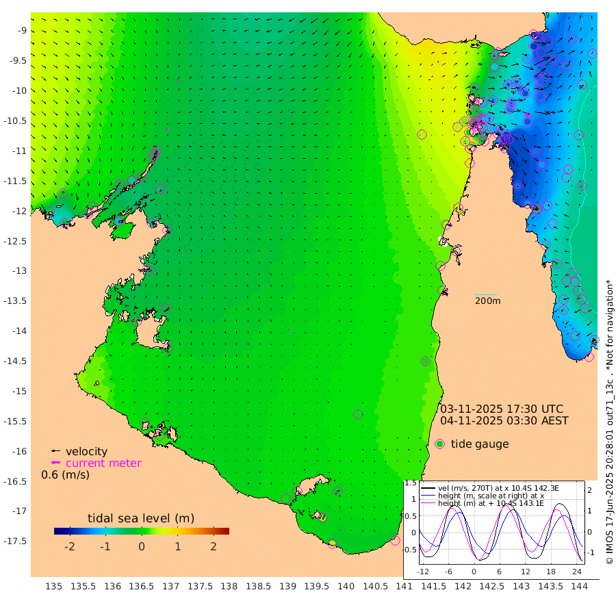 12cm/s -109T +3cm/s rms + 7cm/s -42T. ARA-GOC87 57m 7cm/s -54T +3cm/s rms + 2cm/s -2T. ARA-GOC87 60m 11cm/s -124T +2cm/s rms + 3cm/s 61T. ARA-GOC87 47m -168cm Daru -166cm Bobo Island -92cm Meer Island Barge -129cm Bramble Cay -163cm Unnamed Cay -152cm Pearce Cay -149cm Stephens Island -162cm Merrie England Shoals -174cm Mutacomal Reef -136cm Darnley Island Barge -105cm East Cay -150cm Yorke Island Barge -156cm Rennel Island -150cm Aureed Island -149cm Dungeness Reef -129cm Zagai Island -132cm Yam Island -62cm Dauan Island -70cm Saibai Island -86cm Phipi Reef -126cm Warrior Reef - West -56cm Mabuiag Island Barge -153cm Half Way Island -158cm Coconut Island -158cm Dugong Islet -141cm Poll Island -149cm Kirkcaldie Reef -129cm Suarji Island -139cm Sue Islet -3cm Hawkesbury Island -111cm Alert Patches -118cm Twin Island -8cm Badu Island -113cm St Pauls (Moa Island) -33cm Kubin (Moa Island) -79cm Ince Point -58cm Thursday Island -63cm Nardana Patches -32cm Turtle Head -29cm Round Island 9cm Goods Island 41cm Booby Island 23cm White Rocks Area 42cm Carpentaria -103cm Papou Point 4cm Bampfield Head 44cm Crab Island 36cm Red Wallis Island -13cm Packe Island -175cm Harrington Reef -2cm Herald Camp -33cm Sharp Point -35cm Red Island Point -82cm Possession Island -122cm Alpha Rock -143cm Frederick Point -173cm Wyborn Reef Light -168cm Tetley Island -86cm Triangle Reef -173cm Turtle Head Island -92cm Maclennan Cay -60cm Raine Island -146cm Mcsweeny Reef -135cm Collette Reef -91cm Shadwell Reef -148cm Hannibal Island -131cm Round Point 54cm Vrilya Point -118cm Cape Grenville -109cm Hicks Island -109cm Sir Charles Hardy Island -37cm Harvey Island -103cm Kay Reef -79cm Rocky Island -65cm Chapman Island -64cm Ham Reef -74cm Jubilee Reef -69cm Night Island -65cm Unnamed Reef No. 3 -81cm Morris Island -67cm 1st 3 Mile Opening -73cm Creech Reef -75cm Fife Island -79cm Eden Reef -81cm Stanley Island -95cm Normanby River -7cm Yabooma Island -24cm Hutchison River -2cm Elcho Island 0cm North West Crocodile Island -37cm Cape Wessel -25cm Stevens Island -69cm Guluwuru Island -14cm Hopeful Bay -28cm Auster Point -26cm Two Island Bay -35cm Cadell Strait -117cm Mallison Island -54cm Melville Bay (Gove Harbour) -57cm Truant Island -39cm Cape Arnhem -35cm Cape Grey -22cm Hawk Island -3cm Milner Bay (Groote Eylandt) 3cm Cape Beatrice 12cm West Island 17cm Centre Island 9cm Mornington Island 11cm West Wellesley Islands -2cm Bountiful Island 41cm Albert River Mouth 34cm Sweers Island 33cm Karumba 12cm Nassau River Offshore 8cm Christmas Creek 26cm Archer River 24cm Boyd Point 33cm Weipa (Humbug Point) 40cm Pennefather River 46cm Cullen Point