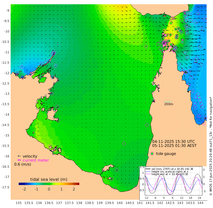 13cm/s -68T +3cm/s rms + 7cm/s -42T. ARA-GOC87 57m 4cm/s 77T +3cm/s rms + 2cm/s -2T. ARA-GOC87 60m 15cm/s -83T +2cm/s rms + 3cm/s 61T. ARA-GOC87 47m -65cm Daru -77cm Bobo Island -106cm Meer Island Barge -110cm Bramble Cay -94cm Unnamed Cay -91cm Pearce Cay -104cm Stephens Island -98cm Merrie England Shoals -65cm Mutacomal Reef -99cm Darnley Island Barge -118cm East Cay -78cm Yorke Island Barge -81cm Rennel Island -73cm Aureed Island -54cm Dungeness Reef 5cm Zagai Island 3cm Yam Island 46cm Dauan Island 54cm Saibai Island 17cm Phipi Reef 8cm Warrior Reef - West 42cm Mabuiag Island Barge -74cm Half Way Island -52cm Coconut Island -61cm Dugong Islet -21cm Poll Island -32cm Kirkcaldie Reef -2cm Suarji Island -12cm Sue Islet -4cm Hawkesbury Island 1cm Alert Patches 3cm Twin Island 9cm Badu Island 20cm St Pauls (Moa Island) -1cm Kubin (Moa Island) 14cm Ince Point 14cm Thursday Island 15cm Nardana Patches -2cm Turtle Head -17cm Round Island -14cm Goods Island -6cm Booby Island -11cm White Rocks Area 21cm Carpentaria 9cm Papou Point -43cm Bampfield Head 2cm Crab Island 6cm Red Wallis Island -4cm Packe Island -63cm Harrington Reef -24cm Herald Camp 22cm Sharp Point -1cm Red Island Point -13cm Possession Island 6cm Alpha Rock -24cm Frederick Point -60cm Wyborn Reef Light -46cm Tetley Island -79cm Triangle Reef -78cm Turtle Head Island -100cm Maclennan Cay -105cm Raine Island -88cm Mcsweeny Reef -92cm Collette Reef -95cm Shadwell Reef -105cm Hannibal Island -116cm Round Point 18cm Vrilya Point -108cm Cape Grenville -114cm Hicks Island -114cm Sir Charles Hardy Island -34cm Harvey Island -116cm Kay Reef -112cm Rocky Island -109cm Chapman Island -104cm Ham Reef -106cm Jubilee Reef -96cm Night Island -104cm Unnamed Reef No. 3 -117cm Morris Island -113cm 1st 3 Mile Opening -111cm Creech Reef -113cm Fife Island -136cm Eden Reef -119cm Stanley Island -132cm Normanby River -130cm Yabooma Island -154cm Hutchison River -122cm Elcho Island -109cm North West Crocodile Island -80cm Cape Wessel -106cm Stevens Island -87cm Guluwuru Island -107cm Hopeful Bay -96cm Auster Point -90cm Two Island Bay -120cm Cadell Strait -57cm Mallison Island -82cm Melville Bay (Gove Harbour) -85cm Truant Island -52cm Cape Arnhem -38cm Cape Grey -22cm Hawk Island 6cm Milner Bay (Groote Eylandt) 13cm Cape Beatrice 46cm West Island 45cm Centre Island 11cm Mornington Island 14cm West Wellesley Islands -16cm Bountiful Island 8cm Albert River Mouth 0cm Sweers Island 1cm Karumba -3cm Nassau River Offshore -15cm Christmas Creek -18cm Archer River -10cm Boyd Point -24cm Weipa (Humbug Point) 8cm Pennefather River 8cm Cullen Point