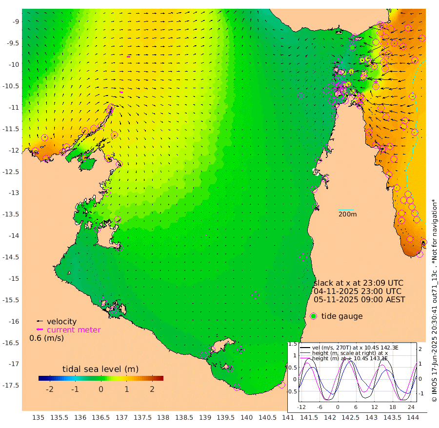 33cm/s 104T +3cm/s rms + 7cm/s -42T. ARA-GOC87 57m 1cm/s -135T +3cm/s rms + 2cm/s -2T. ARA-GOC87 60m 32cm/s 93T +2cm/s rms + 3cm/s 61T. ARA-GOC87 47m 129cm Daru 139cm Bobo Island 117cm Meer Island Barge 139cm Bramble Cay 142cm Unnamed Cay 145cm Pearce Cay 147cm Stephens Island 150cm Merrie England Shoals 128cm Mutacomal Reef 135cm Darnley Island Barge 128cm East Cay 126cm Yorke Island Barge 134cm Rennel Island 126cm Aureed Island 110cm Dungeness Reef 55cm Zagai Island 49cm Yam Island -18cm Dauan Island -29cm Saibai Island 18cm Phipi Reef 47cm Warrior Reef - West -24cm Mabuiag Island Barge 130cm Half Way Island 118cm Coconut Island 118cm Dugong Islet 82cm Poll Island 91cm Kirkcaldie Reef 51cm Suarji Island 66cm Sue Islet -22cm Hawkesbury Island 47cm Alert Patches 50cm Twin Island -16cm Badu Island 33cm St Pauls (Moa Island) 2cm Kubin (Moa Island) 20cm Ince Point 7cm Thursday Island 9cm Nardana Patches 6cm Turtle Head 2cm Round Island -9cm Goods Island -31cm Booby Island -21cm White Rocks Area -46cm Carpentaria 36cm Papou Point -2cm Bampfield Head -23cm Crab Island -33cm Red Wallis Island -2cm Packe Island 132cm Harrington Reef -23cm Herald Camp -2cm Sharp Point 1cm Red Island Point 36cm Possession Island 46cm Alpha Rock 83cm Frederick Point 126cm Wyborn Reef Light 113cm Tetley Island 95cm Triangle Reef 147cm Turtle Head Island 107cm Maclennan Cay 100cm Raine Island 133cm Mcsweeny Reef 129cm Collette Reef 108cm Shadwell Reef 147cm Hannibal Island 145cm Round Point -31cm Vrilya Point 128cm Cape Grenville 127cm Hicks Island 114cm Sir Charles Hardy Island 40cm Harvey Island 122cm Kay Reef 107cm Rocky Island 99cm Chapman Island 93cm Ham Reef 104cm Jubilee Reef 101cm Night Island 98cm Unnamed Reef No. 3 117cm Morris Island 108cm 1st 3 Mile Opening 108cm Creech Reef 116cm Fife Island 130cm Eden Reef 117cm Stanley Island 130cm Normanby River 93cm Yabooma Island 137cm Hutchison River 103cm Elcho Island 87cm North West Crocodile Island 83cm Cape Wessel 106cm Stevens Island 117cm Guluwuru Island 91cm Hopeful Bay 93cm Auster Point 88cm Two Island Bay 133cm Cadell Strait 142cm Mallison Island 100cm Melville Bay (Gove Harbour) 107cm Truant Island 72cm Cape Arnhem 45cm Cape Grey 31cm Hawk Island -8cm Milner Bay (Groote Eylandt) -13cm Cape Beatrice -56cm West Island -53cm Centre Island -22cm Mornington Island -30cm West Wellesley Islands -40cm Bountiful Island -35cm Albert River Mouth -35cm Sweers Island -34cm Karumba -20cm Nassau River Offshore -9cm Christmas Creek -6cm Archer River -13cm Boyd Point -14cm Weipa (Humbug Point) -6cm Pennefather River -36cm Cullen Point