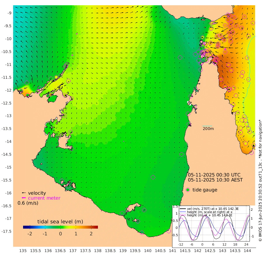 25cm/s 96T +3cm/s rms + 7cm/s -42T. ARA-GOC87 57m 6cm/s 133T +3cm/s rms + 2cm/s -2T. ARA-GOC87 60m 21cm/s 81T +2cm/s rms + 3cm/s 61T. ARA-GOC87 47m 171cm Daru 171cm Bobo Island 95cm Meer Island Barge 128cm Bramble Cay 160cm Unnamed Cay 159cm Pearce Cay 151cm Stephens Island 161cm Merrie England Shoals 170cm Mutacomal Reef 140cm Darnley Island Barge 102cm East Cay 152cm Yorke Island Barge 158cm Rennel Island 157cm Aureed Island 156cm Dungeness Reef 138cm Zagai Island 129cm Yam Island 72cm Dauan Island 67cm Saibai Island 105cm Phipi Reef 133cm Warrior Reef - West 52cm Mabuiag Island Barge 155cm Half Way Island 168cm Coconut Island 157cm Dugong Islet 146cm Poll Island 150cm Kirkcaldie Reef 137cm Suarji Island 138cm Sue Islet -6cm Hawkesbury Island 120cm Alert Patches 124cm Twin Island 14cm Badu Island 120cm St Pauls (Moa Island) 35cm Kubin (Moa Island) 84cm Ince Point 63cm Thursday Island 69cm Nardana Patches 42cm Turtle Head 33cm Round Island -2cm Goods Island -32cm Booby Island -21cm White Rocks Area -33cm Carpentaria 105cm Papou Point 7cm Bampfield Head -26cm Crab Island -29cm Red Wallis Island 20cm Packe Island 178cm Harrington Reef -4cm Herald Camp 34cm Sharp Point 31cm Red Island Point 91cm Possession Island 119cm Alpha Rock 146cm Frederick Point 173cm Wyborn Reef Light 168cm Tetley Island 89cm Triangle Reef 180cm Turtle Head Island 90cm Maclennan Cay 65cm Raine Island 148cm Mcsweeny Reef 137cm Collette Reef 95cm Shadwell Reef 151cm Hannibal Island 130cm Round Point -34cm Vrilya Point 115cm Cape Grenville 108cm Hicks Island 99cm Sir Charles Hardy Island 36cm Harvey Island 97cm Kay Reef 77cm Rocky Island 64cm Chapman Island 61cm Ham Reef 73cm Jubilee Reef 75cm Night Island 64cm Unnamed Reef No. 3 81cm Morris Island 74cm 1st 3 Mile Opening 76cm Creech Reef 78cm Fife Island 82cm Eden Reef 81cm Stanley Island 87cm Normanby River -30cm Yabooma Island 2cm Hutchison River -19cm Elcho Island -30cm North West Crocodile Island 19cm Cape Wessel 6cm Stevens Island 73cm Guluwuru Island -6cm Hopeful Bay 16cm Auster Point 7cm Two Island Bay 24cm Cadell Strait 141cm Mallison Island 55cm Melville Bay (Gove Harbour) 61cm Truant Island 48cm Cape Arnhem 33cm Cape Grey 26cm Hawk Island -2cm Milner Bay (Groote Eylandt) -8cm Cape Beatrice -28cm West Island -22cm Centre Island -5cm Mornington Island -13cm West Wellesley Islands -29cm Bountiful Island -43cm Albert River Mouth -39cm Sweers Island -39cm Karumba -14cm Nassau River Offshore -4cm Christmas Creek -14cm Archer River -12cm Boyd Point -24cm Weipa (Humbug Point) -11cm Pennefather River -34cm Cullen Point