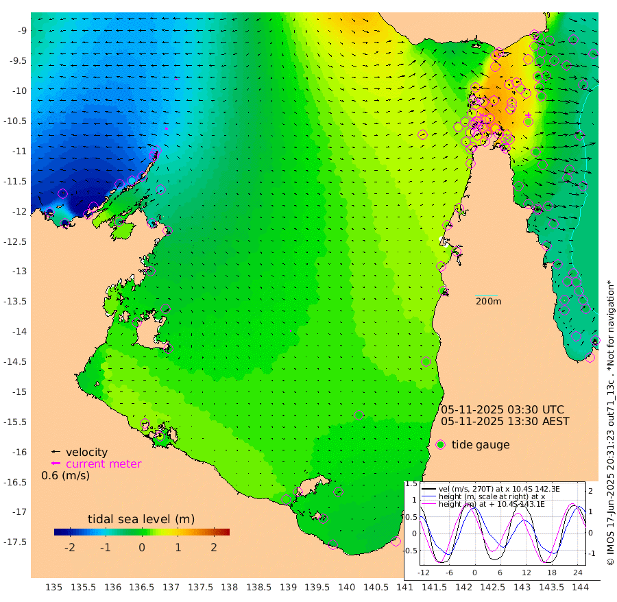 18cm/s -72T +3cm/s rms + 7cm/s -42T. ARA-GOC87 57m 8cm/s 113T +3cm/s rms + 2cm/s -2T. ARA-GOC87 60m 21cm/s -84T +2cm/s rms + 3cm/s 61T. ARA-GOC87 47m 29cm Daru 13cm Bobo Island -38cm Meer Island Barge -35cm Bramble Cay 0cm Unnamed Cay -9cm Pearce Cay -18cm Stephens Island -11cm Merrie England Shoals 26cm Mutacomal Reef -13cm Darnley Island Barge -45cm East Cay 12cm Yorke Island Barge 9cm Rennel Island 19cm Aureed Island 41cm Dungeness Reef 96cm Zagai Island 90cm Yam Island 125cm Dauan Island 131cm Saibai Island 120cm Phipi Reef 98cm Warrior Reef - West 111cm Mabuiag Island Barge 7cm Half Way Island 46cm Coconut Island 26cm Dugong Islet 66cm Poll Island 58cm Kirkcaldie Reef 112cm Suarji Island 78cm Sue Islet 52cm Hawkesbury Island 99cm Alert Patches 92cm Twin Island 71cm Badu Island 109cm St Pauls (Moa Island) 65cm Kubin (Moa Island) 93cm Ince Point 89cm Thursday Island 92cm Nardana Patches 73cm Turtle Head 76cm Round Island 49cm Goods Island 50cm Booby Island 45cm White Rocks Area 70cm Carpentaria 85cm Papou Point 79cm Bampfield Head 40cm Crab Island 49cm Red Wallis Island 58cm Packe Island 34cm Harrington Reef 73cm Herald Camp 44cm Sharp Point 57cm Red Island Point 89cm Possession Island 86cm Alpha Rock 68cm Frederick Point 36cm Wyborn Reef Light 48cm Tetley Island -14cm Triangle Reef 18cm Turtle Head Island -30cm Maclennan Cay -46cm Raine Island -2cm Mcsweeny Reef -6cm Collette Reef -24cm Shadwell Reef -15cm Hannibal Island -38cm Round Point 39cm Vrilya Point -30cm Cape Grenville -37cm Hicks Island -28cm Sir Charles Hardy Island -9cm Harvey Island -43cm Kay Reef -44cm Rocky Island -45cm Chapman Island -43cm Ham Reef -44cm Jubilee Reef -38cm Night Island -45cm Unnamed Reef No. 3 -51cm Morris Island -41cm 1st 3 Mile Opening -45cm Creech Reef -57cm Fife Island -69cm Eden Reef -52cm Stanley Island -68cm Normanby River -203cm Yabooma Island -231cm Hutchison River -205cm Elcho Island -201cm North West Crocodile Island -119cm Cape Wessel -177cm Stevens Island -99cm Guluwuru Island -162cm Hopeful Bay -135cm Auster Point -150cm Two Island Bay -205cm Cadell Strait -48cm Mallison Island -94cm Melville Bay (Gove Harbour) -94cm Truant Island -52cm Cape Arnhem -31cm Cape Grey -20cm Hawk Island 1cm Milner Bay (Groote Eylandt) -2cm Cape Beatrice 35cm West Island 45cm Centre Island 20cm Mornington Island 22cm West Wellesley Islands 10cm Bountiful Island -26cm Albert River Mouth -18cm Sweers Island -18cm Karumba 10cm Nassau River Offshore 22cm Christmas Creek 18cm Archer River 32cm Boyd Point 22cm Weipa (Humbug Point) 25cm Pennefather River 45cm Cullen Point