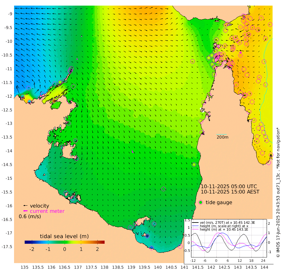22cm/s 114T +3cm/s rms + 7cm/s -42T. ARA-GOC87 57m 38cm/s 160T +3cm/s rms + 2cm/s -2T. ARA-GOC87 60m 9cm/s 123T +2cm/s rms + 3cm/s 61T. ARA-GOC87 47m 118cm Daru 116cm Bobo Island 92cm Meer Island Barge 99cm Bramble Cay 113cm Unnamed Cay 117cm Pearce Cay 114cm Stephens Island 109cm Merrie England Shoals 113cm Mutacomal Reef 117cm Darnley Island Barge 93cm East Cay 120cm Yorke Island Barge 111cm Rennel Island 117cm Aureed Island 113cm Dungeness Reef 101cm Zagai Island 101cm Yam Island 92cm Dauan Island 91cm Saibai Island 83cm Phipi Reef 109cm Warrior Reef - West 65cm Mabuiag Island Barge 115cm Half Way Island 110cm Coconut Island 120cm Dugong Islet 104cm Poll Island 111cm Kirkcaldie Reef 90cm Suarji Island 109cm Sue Islet 59cm Hawkesbury Island 92cm Alert Patches 96cm Twin Island 56cm Badu Island 95cm St Pauls (Moa Island) 68cm Kubin (Moa Island) 81cm Ince Point 75cm Thursday Island 75cm Nardana Patches 69cm Turtle Head 50cm Round Island 55cm Goods Island 48cm Booby Island 40cm White Rocks Area 53cm Carpentaria 81cm Papou Point 52cm Bampfield Head 39cm Crab Island 50cm Red Wallis Island 67cm Packe Island 119cm Harrington Reef 62cm Herald Camp 25cm Sharp Point 58cm Red Island Point 69cm Possession Island 89cm Alpha Rock 106cm Frederick Point 111cm Wyborn Reef Light 110cm Tetley Island 85cm Triangle Reef 121cm Turtle Head Island 90cm Maclennan Cay 72cm Raine Island 111cm Mcsweeny Reef 105cm Collette Reef 87cm Shadwell Reef 111cm Hannibal Island 100cm Round Point 44cm Vrilya Point 95cm Cape Grenville 93cm Hicks Island 107cm Sir Charles Hardy Island 31cm Harvey Island 88cm Kay Reef 80cm Rocky Island 78cm Chapman Island 78cm Ham Reef 82cm Jubilee Reef 76cm Night Island 78cm Unnamed Reef No. 3 81cm Morris Island 80cm 1st 3 Mile Opening 85cm Creech Reef 84cm Fife Island 91cm Eden Reef 86cm Stanley Island 88cm Normanby River -105cm Yabooma Island -111cm Hutchison River -117cm Elcho Island -121cm North West Crocodile Island -22cm Cape Wessel -80cm Stevens Island 32cm Guluwuru Island -80cm Hopeful Bay -46cm Auster Point -41cm Two Island Bay -35cm Cadell Strait 186cm Mallison Island 6cm Melville Bay (Gove Harbour) 15cm Truant Island 14cm Cape Arnhem -13cm Cape Grey -30cm Hawk Island -64cm Milner Bay (Groote Eylandt) -62cm Cape Beatrice -75cm West Island -77cm Centre Island -62cm Mornington Island -54cm West Wellesley Islands -88cm Bountiful Island -152cm Albert River Mouth -171cm Sweers Island -140cm Karumba -12cm Nassau River Offshore 35cm Christmas Creek 40cm Archer River 53cm Boyd Point 45cm Weipa (Humbug Point) 39cm Pennefather River 45cm Cullen Point
