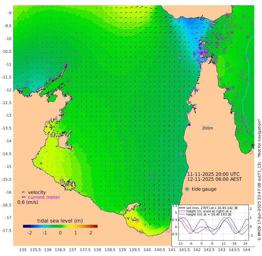 19cm/s 1T +3cm/s rms + 7cm/s -42T. ARA-GOC87 57m 32cm/s 8T +3cm/s rms + 2cm/s -2T. ARA-GOC87 60m 18cm/s 17T +2cm/s rms + 3cm/s 61T. ARA-GOC87 47m -12cm Daru -6cm Bobo Island -9cm Meer Island Barge -8cm Bramble Cay -3cm Unnamed Cay -15cm Pearce Cay -1cm Stephens Island 3cm Merrie England Shoals -9cm Mutacomal Reef -1cm Darnley Island Barge -10cm East Cay -5cm Yorke Island Barge -8cm Rennel Island -8cm Aureed Island -27cm Dungeness Reef -44cm Zagai Island -51cm Yam Island -114cm Dauan Island -95cm Saibai Island -110cm Phipi Reef -66cm Warrior Reef - West -88cm Mabuiag Island Barge -4cm Half Way Island -17cm Coconut Island -10cm Dugong Islet -32cm Poll Island -28cm Kirkcaldie Reef -47cm Suarji Island -26cm Sue Islet -150cm Hawkesbury Island -56cm Alert Patches -51cm Twin Island -149cm Badu Island -58cm St Pauls (Moa Island) -119cm Kubin (Moa Island) -76cm Ince Point -88cm Thursday Island -86cm Nardana Patches -115cm Turtle Head -113cm Round Island -143cm Goods Island -143cm Booby Island -134cm White Rocks Area -78cm Carpentaria -52cm Papou Point -122cm Bampfield Head -117cm Crab Island -137cm Red Wallis Island -132cm Packe Island 0cm Harrington Reef -139cm Herald Camp -9cm Sharp Point -103cm Red Island Point -64cm Possession Island -31cm Alpha Rock -31cm Frederick Point -8cm Wyborn Reef Light -14cm Tetley Island -22cm Triangle Reef -4cm Turtle Head Island -14cm Maclennan Cay -20cm Raine Island -2cm Mcsweeny Reef -3cm Collette Reef -12cm Shadwell Reef 0cm Hannibal Island -9cm Round Point -95cm Vrilya Point -3cm Cape Grenville -10cm Hicks Island -23cm Sir Charles Hardy Island 0cm Harvey Island -6cm Kay Reef -16cm Rocky Island -26cm Chapman Island -18cm Ham Reef -15cm Jubilee Reef -11cm Night Island -18cm Unnamed Reef No. 3 -13cm Morris Island -16cm 1st 3 Mile Opening -14cm Creech Reef -6cm Fife Island -18cm Eden Reef -8cm Stanley Island -5cm Normanby River -73cm Yabooma Island -86cm Hutchison River -65cm Elcho Island -67cm North West Crocodile Island -14cm Cape Wessel -42cm Stevens Island -14cm Guluwuru Island -41cm Hopeful Bay -23cm Auster Point -25cm Two Island Bay -64cm Cadell Strait 21cm Mallison Island -14cm Melville Bay (Gove Harbour) -12cm Truant Island 0cm Cape Arnhem 22cm Cape Grey 25cm Hawk Island 63cm Milner Bay (Groote Eylandt) 55cm Cape Beatrice 87cm West Island 88cm Centre Island 35cm Mornington Island 41cm West Wellesley Islands 12cm Bountiful Island 27cm Albert River Mouth 62cm Sweers Island 17cm Karumba -33cm Nassau River Offshore -68cm Christmas Creek -84cm Archer River -82cm Boyd Point -104cm Weipa (Humbug Point) -66cm Pennefather River -98cm Cullen Point