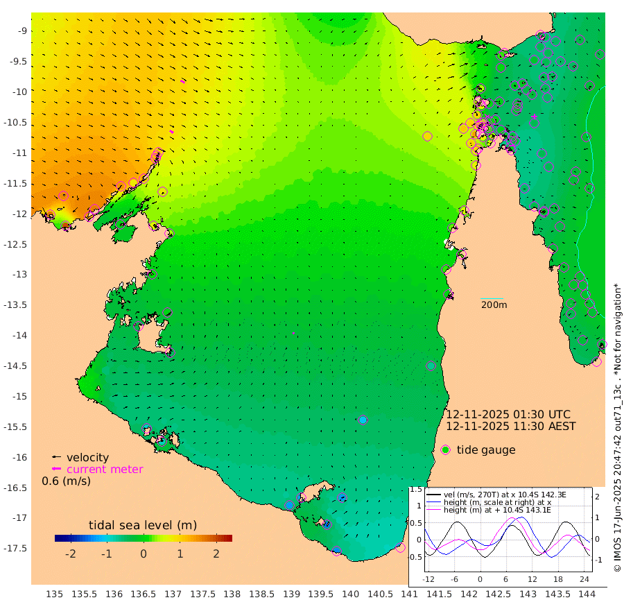 28cm/s 124T +3cm/s rms + 7cm/s -42T. ARA-GOC87 57m 15cm/s 17T +3cm/s rms + 2cm/s -2T. ARA-GOC87 60m 32cm/s 118T +2cm/s rms + 3cm/s 61T. ARA-GOC87 47m -46cm Daru -41cm Bobo Island -29cm Meer Island Barge -37cm Bramble Cay -43cm Unnamed Cay -42cm Pearce Cay -46cm Stephens Island -49cm Merrie England Shoals -44cm Mutacomal Reef -45cm Darnley Island Barge -32cm East Cay -44cm Yorke Island Barge -42cm Rennel Island -44cm Aureed Island -36cm Dungeness Reef -9cm Zagai Island -8cm Yam Island 19cm Dauan Island 20cm Saibai Island 3cm Phipi Reef -18cm Warrior Reef - West 42cm Mabuiag Island Barge -46cm Half Way Island -29cm Coconut Island -45cm Dugong Islet -21cm Poll Island -30cm Kirkcaldie Reef -5cm Suarji Island -22cm Sue Islet 104cm Hawkesbury Island 5cm Alert Patches 3cm Twin Island 94cm Badu Island 6cm St Pauls (Moa Island) 72cm Kubin (Moa Island) 26cm Ince Point 41cm Thursday Island 38cm Nardana Patches 56cm Turtle Head 90cm Round Island 93cm Goods Island 109cm Booby Island 105cm White Rocks Area 92cm Carpentaria 18cm Papou Point 137cm Bampfield Head 88cm Crab Island 98cm Red Wallis Island 71cm Packe Island -45cm Harrington Reef 100cm Herald Camp -9cm Sharp Point 54cm Red Island Point 38cm Possession Island -3cm Alpha Rock -16cm Frederick Point -29cm Wyborn Reef Light -24cm Tetley Island -19cm Triangle Reef -26cm Turtle Head Island -26cm Maclennan Cay -15cm Raine Island -44cm Mcsweeny Reef -42cm Collette Reef -28cm Shadwell Reef -47cm Hannibal Island -36cm Round Point 73cm Vrilya Point -38cm Cape Grenville -30cm Hicks Island -26cm Sir Charles Hardy Island -13cm Harvey Island -31cm Kay Reef -23cm Rocky Island -16cm Chapman Island -17cm Ham Reef -22cm Jubilee Reef -27cm Night Island -21cm Unnamed Reef No. 3 -26cm Morris Island -17cm 1st 3 Mile Opening -25cm Creech Reef -39cm Fife Island -26cm Eden Reef -30cm Stanley Island -33cm Normanby River 170cm Yabooma Island 189cm Hutchison River 165cm Elcho Island 156cm North West Crocodile Island 110cm Cape Wessel 145cm Stevens Island 76cm Guluwuru Island 132cm Hopeful Bay 122cm Auster Point 121cm Two Island Bay 135cm Cadell Strait -7cm Mallison Island 71cm Melville Bay (Gove Harbour) 82cm Truant Island 41cm Cape Arnhem 11cm Cape Grey -6cm Hawk Island -30cm Milner Bay (Groote Eylandt) -51cm Cape Beatrice -94cm West Island -87cm Centre Island -128cm Mornington Island -132cm West Wellesley Islands -133cm Bountiful Island -139cm Albert River Mouth -150cm Sweers Island -143cm Karumba -110cm Nassau River Offshore -70cm Christmas Creek -7cm Archer River 19cm Boyd Point 25cm Weipa (Humbug Point) 28cm Pennefather River 64cm Cullen Point