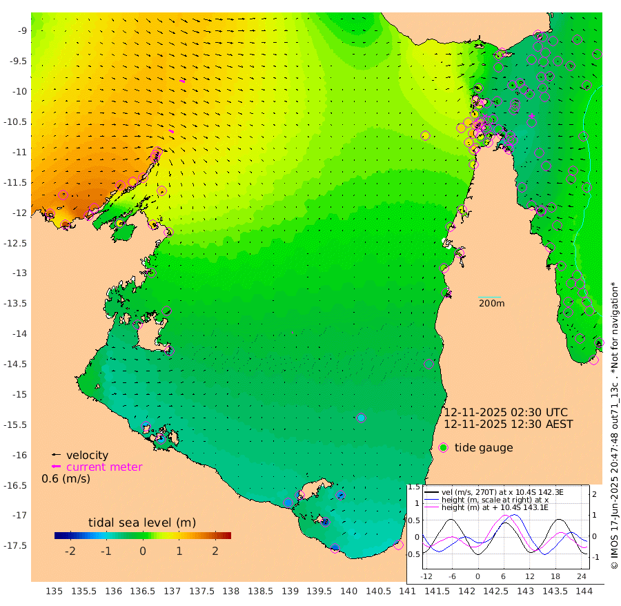 37cm/s 118T +3cm/s rms + 7cm/s -42T. ARA-GOC87 57m 5cm/s 62T +3cm/s rms + 2cm/s -2T. ARA-GOC87 60m 38cm/s 112T +2cm/s rms + 3cm/s 61T. ARA-GOC87 47m -31cm Daru -23cm Bobo Island -2cm Meer Island Barge -11cm Bramble Cay -24cm Unnamed Cay -19cm Pearce Cay -24cm Stephens Island -31cm Merrie England Shoals -31cm Mutacomal Reef -19cm Darnley Island Barge -4cm East Cay -23cm Yorke Island Barge -26cm Rennel Island -24cm Aureed Island -24cm Dungeness Reef -4cm Zagai Island -6cm Yam Island 27cm Dauan Island 28cm Saibai Island 7cm Phipi Reef -8cm Warrior Reef - West 36cm Mabuiag Island Barge -31cm Half Way Island -20cm Coconut Island -32cm Dugong Islet -16cm Poll Island -26cm Kirkcaldie Reef -10cm Suarji Island -16cm Sue Islet 97cm Hawkesbury Island -2cm Alert Patches -1cm Twin Island 86cm Badu Island 0cm St Pauls (Moa Island) 65cm Kubin (Moa Island) 19cm Ince Point 32cm Thursday Island 29cm Nardana Patches 50cm Turtle Head 77cm Round Island 86cm Goods Island 98cm Booby Island 92cm White Rocks Area 77cm Carpentaria 12cm Papou Point 121cm Bampfield Head 77cm Crab Island 87cm Red Wallis Island 66cm Packe Island -37cm Harrington Reef 92cm Herald Camp -13cm Sharp Point 46cm Red Island Point 28cm Possession Island -6cm Alpha Rock -14cm Frederick Point -19cm Wyborn Reef Light -16cm Tetley Island 4cm Triangle Reef -17cm Turtle Head Island -2cm Maclennan Cay 10cm Raine Island -25cm Mcsweeny Reef -20cm Collette Reef -4cm Shadwell Reef -23cm Hannibal Island -11cm Round Point 61cm Vrilya Point -15cm Cape Grenville -5cm Hicks Island 5cm Sir Charles Hardy Island -5cm Harvey Island -5cm Kay Reef 4cm Rocky Island 14cm Chapman Island 11cm Ham Reef 6cm Jubilee Reef -3cm Night Island 7cm Unnamed Reef No. 3 2cm Morris Island 8cm 1st 3 Mile Opening 2cm Creech Reef -9cm Fife Island 9cm Eden Reef -2cm Stanley Island -3cm Normanby River 179cm Yabooma Island 201cm Hutchison River 171cm Elcho Island 159cm North West Crocodile Island 130cm Cape Wessel 158cm Stevens Island 112cm Guluwuru Island 145cm Hopeful Bay 137cm Auster Point 139cm Two Island Bay 169cm Cadell Strait 88cm Mallison Island 98cm Melville Bay (Gove Harbour) 112cm Truant Island 62cm Cape Arnhem 18cm Cape Grey -3cm Hawk Island -44cm Milner Bay (Groote Eylandt) -64cm Cape Beatrice -120cm West Island -115cm Centre Island -136cm Mornington Island -138cm West Wellesley Islands -138cm Bountiful Island -155cm Albert River Mouth -169cm Sweers Island -159cm Karumba -103cm Nassau River Offshore -57cm Christmas Creek 2cm Archer River 25cm Boyd Point 33cm Weipa (Humbug Point) 23cm Pennefather River 58cm Cullen Point