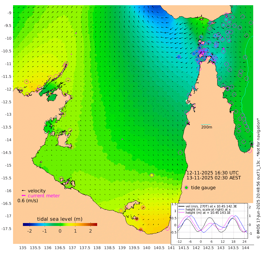 13cm/s 51T +3cm/s rms + 7cm/s -42T. ARA-GOC87 57m 17cm/s -58T +3cm/s rms + 2cm/s -2T. ARA-GOC87 60m 21cm/s 46T +2cm/s rms + 3cm/s 61T. ARA-GOC87 47m -78cm Daru -67cm Bobo Island -25cm Meer Island Barge -40cm Bramble Cay -68cm Unnamed Cay -59cm Pearce Cay -59cm Stephens Island -67cm Merrie England Shoals -85cm Mutacomal Reef -47cm Darnley Island Barge -33cm East Cay -62cm Yorke Island Barge -76cm Rennel Island -62cm Aureed Island -81cm Dungeness Reef -81cm Zagai Island -102cm Yam Island -68cm Dauan Island -69cm Saibai Island -67cm Phipi Reef -79cm Warrior Reef - West -100cm Mabuiag Island Barge -80cm Half Way Island -87cm Coconut Island -89cm Dugong Islet -95cm Poll Island -107cm Kirkcaldie Reef -105cm Suarji Island -93cm Sue Islet -152cm Hawkesbury Island -119cm Alert Patches -119cm Twin Island -125cm Badu Island -120cm St Pauls (Moa Island) -135cm Kubin (Moa Island) -122cm Ince Point -129cm Thursday Island -125cm Nardana Patches -124cm Turtle Head -141cm Round Island -131cm Goods Island -144cm Booby Island -141cm White Rocks Area -143cm Carpentaria -115cm Papou Point -170cm Bampfield Head -122cm Crab Island -141cm Red Wallis Island -137cm Packe Island -102cm Harrington Reef -162cm Herald Camp -32cm Sharp Point -121cm Red Island Point -125cm Possession Island -108cm Alpha Rock -110cm Frederick Point -91cm Wyborn Reef Light -97cm Tetley Island -33cm Triangle Reef -105cm Turtle Head Island -38cm Maclennan Cay -16cm Raine Island -62cm Mcsweeny Reef -51cm Collette Reef -28cm Shadwell Reef -51cm Hannibal Island -45cm Round Point -120cm Vrilya Point -45cm Cape Grenville -39cm Hicks Island -41cm Sir Charles Hardy Island -15cm Harvey Island -33cm Kay Reef -21cm Rocky Island -12cm Chapman Island -17cm Ham Reef -20cm Jubilee Reef -21cm Night Island -18cm Unnamed Reef No. 3 -22cm Morris Island -22cm 1st 3 Mile Opening -22cm Creech Reef -14cm Fife Island -9cm Eden Reef -23cm Stanley Island -24cm Normanby River 54cm Yabooma Island 74cm Hutchison River 71cm Elcho Island 64cm North West Crocodile Island 40cm Cape Wessel 64cm Stevens Island 57cm Guluwuru Island 65cm Hopeful Bay 45cm Auster Point 40cm Two Island Bay 81cm Cadell Strait 109cm Mallison Island 57cm Melville Bay (Gove Harbour) 51cm Truant Island 44cm Cape Arnhem 44cm Cape Grey 52cm Hawk Island 57cm Milner Bay (Groote Eylandt) 58cm Cape Beatrice 49cm West Island 48cm Centre Island 96cm Mornington Island 98cm West Wellesley Islands 125cm Bountiful Island 187cm Albert River Mouth 202cm Sweers Island 164cm Karumba 60cm Nassau River Offshore 12cm Christmas Creek -28cm Archer River -57cm Boyd Point -51cm Weipa (Humbug Point) -68cm Pennefather River -104cm Cullen Point