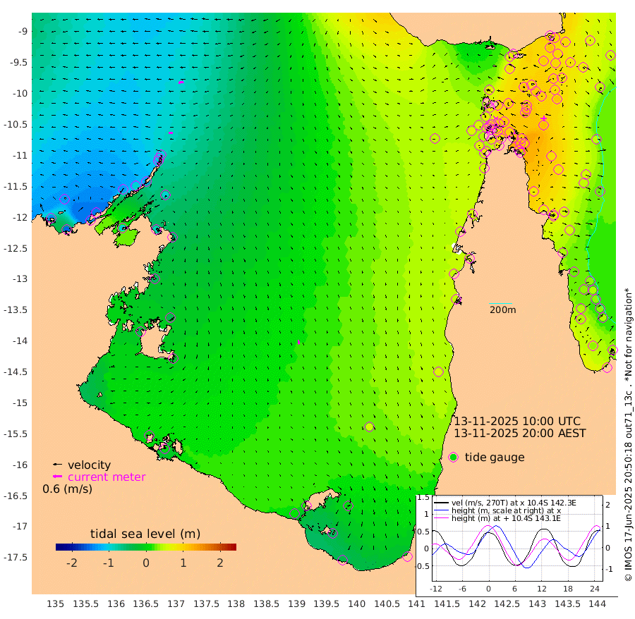 26cm/s -92T +3cm/s rms + 7cm/s -42T. ARA-GOC87 57m 29cm/s 170T +3cm/s rms + 2cm/s -2T. ARA-GOC87 60m 35cm/s -98T +2cm/s rms + 3cm/s 61T. ARA-GOC87 47m 109cm Daru 97cm Bobo Island 46cm Meer Island Barge 67cm Bramble Cay 94cm Unnamed Cay 95cm Pearce Cay 90cm Stephens Island 96cm Merrie England Shoals 111cm Mutacomal Reef 77cm Darnley Island Barge 56cm East Cay 90cm Yorke Island Barge 102cm Rennel Island 93cm Aureed Island 108cm Dungeness Reef 89cm Zagai Island 108cm Yam Island 73cm Dauan Island 66cm Saibai Island 88cm Phipi Reef 102cm Warrior Reef - West 71cm Mabuiag Island Barge 107cm Half Way Island 104cm Coconut Island 116cm Dugong Islet 108cm Poll Island 123cm Kirkcaldie Reef 103cm Suarji Island 102cm Sue Islet 82cm Hawkesbury Island 109cm Alert Patches 111cm Twin Island 66cm Badu Island 111cm St Pauls (Moa Island) 86cm Kubin (Moa Island) 100cm Ince Point 95cm Thursday Island 94cm Nardana Patches 85cm Turtle Head 70cm Round Island 68cm Goods Island 60cm Booby Island 61cm White Rocks Area 48cm Carpentaria 96cm Papou Point 45cm Bampfield Head 54cm Crab Island 69cm Red Wallis Island 90cm Packe Island 125cm Harrington Reef 82cm Herald Camp 36cm Sharp Point 86cm Red Island Point 88cm Possession Island 100cm Alpha Rock 116cm Frederick Point 104cm Wyborn Reef Light 106cm Tetley Island 49cm Triangle Reef 113cm Turtle Head Island 55cm Maclennan Cay 28cm Raine Island 89cm Mcsweeny Reef 77cm Collette Reef 47cm Shadwell Reef 81cm Hannibal Island 72cm Round Point 57cm Vrilya Point 69cm Cape Grenville 60cm Hicks Island 58cm Sir Charles Hardy Island 22cm Harvey Island 53cm Kay Reef 39cm Rocky Island 27cm Chapman Island 30cm Ham Reef 36cm Jubilee Reef 41cm Night Island 34cm Unnamed Reef No. 3 41cm Morris Island 31cm 1st 3 Mile Opening 39cm Creech Reef 44cm Fife Island 32cm Eden Reef 42cm Stanley Island 48cm Normanby River -136cm Yabooma Island -157cm Hutchison River -146cm Elcho Island -130cm North West Crocodile Island -104cm Cape Wessel -134cm Stevens Island -95cm Guluwuru Island -128cm Hopeful Bay -114cm Auster Point -105cm Two Island Bay -128cm Cadell Strait -97cm Mallison Island -89cm Melville Bay (Gove Harbour) -96cm Truant Island -64cm Cape Arnhem -49cm Cape Grey -41cm Hawk Island -41cm Milner Bay (Groote Eylandt) -21cm Cape Beatrice 7cm West Island 1cm Centre Island 18cm Mornington Island 14cm West Wellesley Islands 6cm Bountiful Island -37cm Albert River Mouth -51cm Sweers Island -9cm Karumba 54cm Nassau River Offshore 67cm Christmas Creek 49cm Archer River 48cm Boyd Point 45cm Weipa (Humbug Point) 47cm Pennefather River 53cm Cullen Point