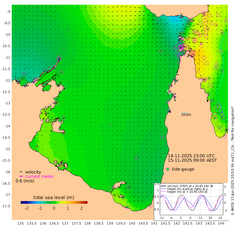8cm/s 25T +3cm/s rms + 7cm/s -42T. ARA-GOC87 57m 20cm/s 15T +3cm/s rms + 2cm/s -2T. ARA-GOC87 60m 7cm/s 51T +2cm/s rms + 3cm/s 61T. ARA-GOC87 47m 75cm Daru 81cm Bobo Island 32cm Meer Island Barge 47cm Bramble Cay 68cm Unnamed Cay 70cm Pearce Cay 68cm Stephens Island 70cm Merrie England Shoals 75cm Mutacomal Reef 58cm Darnley Island Barge 37cm East Cay 67cm Yorke Island Barge 74cm Rennel Island 76cm Aureed Island 69cm Dungeness Reef 57cm Zagai Island 52cm Yam Island -14cm Dauan Island -7cm Saibai Island 5cm Phipi Reef 41cm Warrior Reef - West 0cm Mabuiag Island Barge 75cm Half Way Island 83cm Coconut Island 77cm Dugong Islet 68cm Poll Island 72cm Kirkcaldie Reef 71cm Suarji Island 61cm Sue Islet -53cm Hawkesbury Island 53cm Alert Patches 58cm Twin Island -39cm Badu Island 53cm St Pauls (Moa Island) -16cm Kubin (Moa Island) 28cm Ince Point 15cm Thursday Island 18cm Nardana Patches -9cm Turtle Head -15cm Round Island -40cm Goods Island -49cm Booby Island -36cm White Rocks Area -14cm Carpentaria 50cm Papou Point -20cm Bampfield Head -41cm Crab Island -45cm Red Wallis Island -27cm Packe Island 98cm Harrington Reef -44cm Herald Camp 17cm Sharp Point -8cm Red Island Point 37cm Possession Island 56cm Alpha Rock 72cm Frederick Point 80cm Wyborn Reef Light 77cm Tetley Island 27cm Triangle Reef 88cm Turtle Head Island 33cm Maclennan Cay 14cm Raine Island 66cm Mcsweeny Reef 56cm Collette Reef 28cm Shadwell Reef 62cm Hannibal Island 48cm Round Point -37cm Vrilya Point 46cm Cape Grenville 40cm Hicks Island 28cm Sir Charles Hardy Island 15cm Harvey Island 32cm Kay Reef 19cm Rocky Island 7cm Chapman Island 10cm Ham Reef 18cm Jubilee Reef 22cm Night Island 14cm Unnamed Reef No. 3 24cm Morris Island 21cm 1st 3 Mile Opening 22cm Creech Reef 22cm Fife Island 17cm Eden Reef 22cm Stanley Island 28cm Normanby River -66cm Yabooma Island -55cm Hutchison River -52cm Elcho Island -56cm North West Crocodile Island -14cm Cape Wessel -43cm Stevens Island -2cm Guluwuru Island -49cm Hopeful Bay -22cm Auster Point -32cm Two Island Bay -55cm Cadell Strait -45cm Mallison Island -7cm Melville Bay (Gove Harbour) -4cm Truant Island 4cm Cape Arnhem 16cm Cape Grey 12cm Hawk Island 30cm Milner Bay (Groote Eylandt) 25cm Cape Beatrice 41cm West Island 46cm Centre Island 11cm Mornington Island 10cm West Wellesley Islands -13cm Bountiful Island -15cm Albert River Mouth -4cm Sweers Island -20cm Karumba -29cm Nassau River Offshore -39cm Christmas Creek -45cm Archer River -37cm Boyd Point -53cm Weipa (Humbug Point) -28cm Pennefather River -44cm Cullen Point
