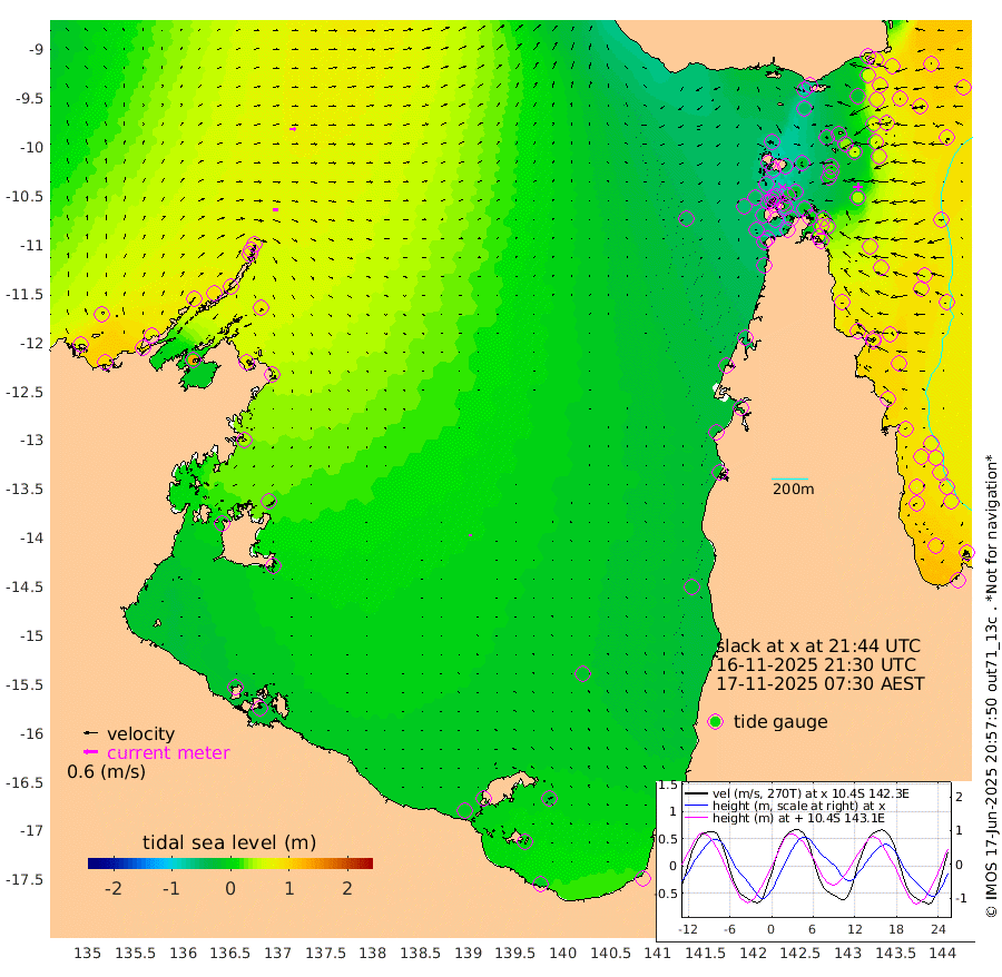 23cm/s 96T +3cm/s rms + 7cm/s -42T. ARA-GOC87 57m 7cm/s -4T +3cm/s rms + 2cm/s -2T. ARA-GOC87 60m 25cm/s 87T +2cm/s rms + 3cm/s 61T. ARA-GOC87 47m 50cm Daru 68cm Bobo Island 73cm Meer Island Barge 84cm Bramble Cay 69cm Unnamed Cay 75cm Pearce Cay 78cm Stephens Island 81cm Merrie England Shoals 54cm Mutacomal Reef 73cm Darnley Island Barge 85cm East Cay 58cm Yorke Island Barge 61cm Rennel Island 59cm Aureed Island 30cm Dungeness Reef -12cm Zagai Island -25cm Yam Island -77cm Dauan Island -67cm Saibai Island -52cm Phipi Reef -23cm Warrior Reef - West -63cm Mabuiag Island Barge 53cm Half Way Island 46cm Coconut Island 38cm Dugong Islet 8cm Poll Island 13cm Kirkcaldie Reef -18cm Suarji Island 3cm Sue Islet -62cm Hawkesbury Island -18cm Alert Patches -17cm Twin Island -55cm Badu Island -38cm St Pauls (Moa Island) -56cm Kubin (Moa Island) -39cm Ince Point -47cm Thursday Island -46cm Nardana Patches -46cm Turtle Head -52cm Round Island -49cm Goods Island -59cm Booby Island -50cm White Rocks Area -51cm Carpentaria -24cm Papou Point -45cm Bampfield Head -45cm Crab Island -58cm Red Wallis Island -52cm Packe Island 51cm Harrington Reef -76cm Herald Camp -19cm Sharp Point -32cm Red Island Point -26cm Possession Island -12cm Alpha Rock 12cm Frederick Point 51cm Wyborn Reef Light 39cm Tetley Island 56cm Triangle Reef 58cm Turtle Head Island 63cm Maclennan Cay 71cm Raine Island 69cm Mcsweeny Reef 73cm Collette Reef 68cm Shadwell Reef 84cm Hannibal Island 90cm Round Point -43cm Vrilya Point 79cm Cape Grenville 77cm Hicks Island 68cm Sir Charles Hardy Island 23cm Harvey Island 86cm Kay Reef 75cm Rocky Island 77cm Chapman Island 72cm Ham Reef 73cm Jubilee Reef 66cm Night Island 77cm Unnamed Reef No. 3 81cm Morris Island 69cm 1st 3 Mile Opening 74cm Creech Reef 85cm Fife Island 94cm Eden Reef 81cm Stanley Island 92cm Normanby River 59cm Yabooma Island 92cm Hutchison River 74cm Elcho Island 61cm North West Crocodile Island 68cm Cape Wessel 78cm Stevens Island 84cm Guluwuru Island 72cm Hopeful Bay 69cm Auster Point 55cm Two Island Bay 90cm Cadell Strait 135cm Mallison Island 72cm Melville Bay (Gove Harbour) 76cm Truant Island 52cm Cape Arnhem 39cm Cape Grey 27cm Hawk Island 6cm Milner Bay (Groote Eylandt) 2cm Cape Beatrice -25cm West Island -23cm Centre Island -7cm Mornington Island -10cm West Wellesley Islands -18cm Bountiful Island -11cm Albert River Mouth 1cm Sweers Island -13cm Karumba -17cm Nassau River Offshore -18cm Christmas Creek -11cm Archer River -23cm Boyd Point -26cm Weipa (Humbug Point) -17cm Pennefather River -51cm Cullen Point