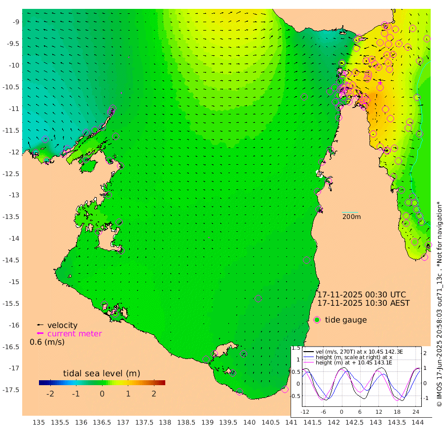 8cm/s 84T +3cm/s rms + 7cm/s -42T. ARA-GOC87 57m 8cm/s 53T +3cm/s rms + 2cm/s -2T. ARA-GOC87 60m 7cm/s 86T +2cm/s rms + 3cm/s 61T. ARA-GOC87 47m 101cm Daru 108cm Bobo Island 43cm Meer Island Barge 59cm Bramble Cay 85cm Unnamed Cay 97cm Pearce Cay 84cm Stephens Island 81cm Merrie England Shoals 97cm Mutacomal Reef 76cm Darnley Island Barge 47cm East Cay 91cm Yorke Island Barge 95cm Rennel Island 105cm Aureed Island 103cm Dungeness Reef 105cm Zagai Island 97cm Yam Island 55cm Dauan Island 59cm Saibai Island 73cm Phipi Reef 97cm Warrior Reef - West 52cm Mabuiag Island Barge 95cm Half Way Island 114cm Coconut Island 102cm Dugong Islet 105cm Poll Island 106cm Kirkcaldie Reef 119cm Suarji Island 99cm Sue Islet -2cm Hawkesbury Island 97cm Alert Patches 102cm Twin Island 19cm Badu Island 101cm St Pauls (Moa Island) 31cm Kubin (Moa Island) 74cm Ince Point 61cm Thursday Island 64cm Nardana Patches 40cm Turtle Head 25cm Round Island 9cm Goods Island -5cm Booby Island 5cm White Rocks Area 15cm Carpentaria 92cm Papou Point 18cm Bampfield Head -6cm Crab Island -1cm Red Wallis Island 20cm Packe Island 123cm Harrington Reef 0cm Herald Camp 31cm Sharp Point 38cm Red Island Point 76cm Possession Island 90cm Alpha Rock 108cm Frederick Point 104cm Wyborn Reef Light 105cm Tetley Island 45cm Triangle Reef 110cm Turtle Head Island 47cm Maclennan Cay 23cm Raine Island 83cm Mcsweeny Reef 72cm Collette Reef 39cm Shadwell Reef 77cm Hannibal Island 60cm Round Point -9cm Vrilya Point 54cm Cape Grenville 51cm Hicks Island 46cm Sir Charles Hardy Island 18cm Harvey Island 39cm Kay Reef 29cm Rocky Island 21cm Chapman Island 21cm Ham Reef 28cm Jubilee Reef 30cm Night Island 24cm Unnamed Reef No. 3 31cm Morris Island 30cm 1st 3 Mile Opening 31cm Creech Reef 27cm Fife Island 26cm Eden Reef 27cm Stanley Island 32cm Normanby River -87cm Yabooma Island -71cm Hutchison River -75cm Elcho Island -78cm North West Crocodile Island -22cm Cape Wessel -63cm Stevens Island 4cm Guluwuru Island -68cm Hopeful Bay -36cm Auster Point -47cm Two Island Bay -58cm Cadell Strait -25cm Mallison Island -7cm Melville Bay (Gove Harbour) -3cm Truant Island 5cm Cape Arnhem 10cm Cape Grey 2cm Hawk Island 4cm Milner Bay (Groote Eylandt) 1cm Cape Beatrice 8cm West Island 15cm Centre Island -3cm Mornington Island -3cm West Wellesley Islands -24cm Bountiful Island -43cm Albert River Mouth -43cm Sweers Island -43cm Karumba -19cm Nassau River Offshore -12cm Christmas Creek -16cm Archer River -6cm Boyd Point -19cm Weipa (Humbug Point) -7cm Pennefather River -14cm Cullen Point
