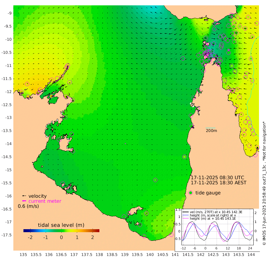 3cm/s -71T +3cm/s rms + 7cm/s -42T. ARA-GOC87 57m 10cm/s -156T +3cm/s rms + 2cm/s -2T. ARA-GOC87 60m 3cm/s -63T +2cm/s rms + 3cm/s 61T. ARA-GOC87 47m 13cm Daru 14cm Bobo Island 45cm Meer Island Barge 51cm Bramble Cay 36cm Unnamed Cay 20cm Pearce Cay 34cm Stephens Island 42cm Merrie England Shoals 24cm Mutacomal Reef 32cm Darnley Island Barge 54cm East Cay 17cm Yorke Island Barge 21cm Rennel Island 9cm Aureed Island -3cm Dungeness Reef -31cm Zagai Island -21cm Yam Island -36cm Dauan Island -34cm Saibai Island -38cm Phipi Reef -24cm Warrior Reef - West -37cm Mabuiag Island Barge 14cm Half Way Island -4cm Coconut Island 7cm Dugong Islet -17cm Poll Island -13cm Kirkcaldie Reef -39cm Suarji Island -19cm Sue Islet -7cm Hawkesbury Island -36cm Alert Patches -33cm Twin Island -20cm Badu Island -44cm St Pauls (Moa Island) -14cm Kubin (Moa Island) -33cm Ince Point -32cm Thursday Island -33cm Nardana Patches -20cm Turtle Head -11cm Round Island -8cm Goods Island -14cm Booby Island -7cm White Rocks Area -31cm Carpentaria -36cm Papou Point -8cm Bampfield Head -19cm Crab Island -10cm Red Wallis Island -4cm Packe Island -2cm Harrington Reef 3cm Herald Camp -20cm Sharp Point -21cm Red Island Point -33cm Possession Island -18cm Alpha Rock -18cm Frederick Point 13cm Wyborn Reef Light 6cm Tetley Island 34cm Triangle Reef 0cm Turtle Head Island 42cm Maclennan Cay 50cm Raine Island 29cm Mcsweeny Reef 35cm Collette Reef 43cm Shadwell Reef 41cm Hannibal Island 54cm Round Point -28cm Vrilya Point 51cm Cape Grenville 49cm Hicks Island 60cm Sir Charles Hardy Island 14cm Harvey Island 62cm Kay Reef 56cm Rocky Island 60cm Chapman Island 56cm Ham Reef 53cm Jubilee Reef 46cm Night Island 56cm Unnamed Reef No. 3 58cm Morris Island 47cm 1st 3 Mile Opening 51cm Creech Reef 60cm Fife Island 68cm Eden Reef 60cm Stanley Island 68cm Normanby River 103cm Yabooma Island 106cm Hutchison River 92cm Elcho Island 89cm North West Crocodile Island 62cm Cape Wessel 90cm Stevens Island 54cm Guluwuru Island 89cm Hopeful Bay 62cm Auster Point 67cm Two Island Bay 86cm Cadell Strait 119cm Mallison Island 53cm Melville Bay (Gove Harbour) 53cm Truant Island 29cm Cape Arnhem 13cm Cape Grey 9cm Hawk Island -9cm Milner Bay (Groote Eylandt) -6cm Cape Beatrice -26cm West Island -36cm Centre Island -1cm Mornington Island 1cm West Wellesley Islands 29cm Bountiful Island 21cm Albert River Mouth 10cm Sweers Island 18cm Karumba 22cm Nassau River Offshore 23cm Christmas Creek 12cm Archer River 3cm Boyd Point 16cm Weipa (Humbug Point) -23cm Pennefather River -10cm Cullen Point