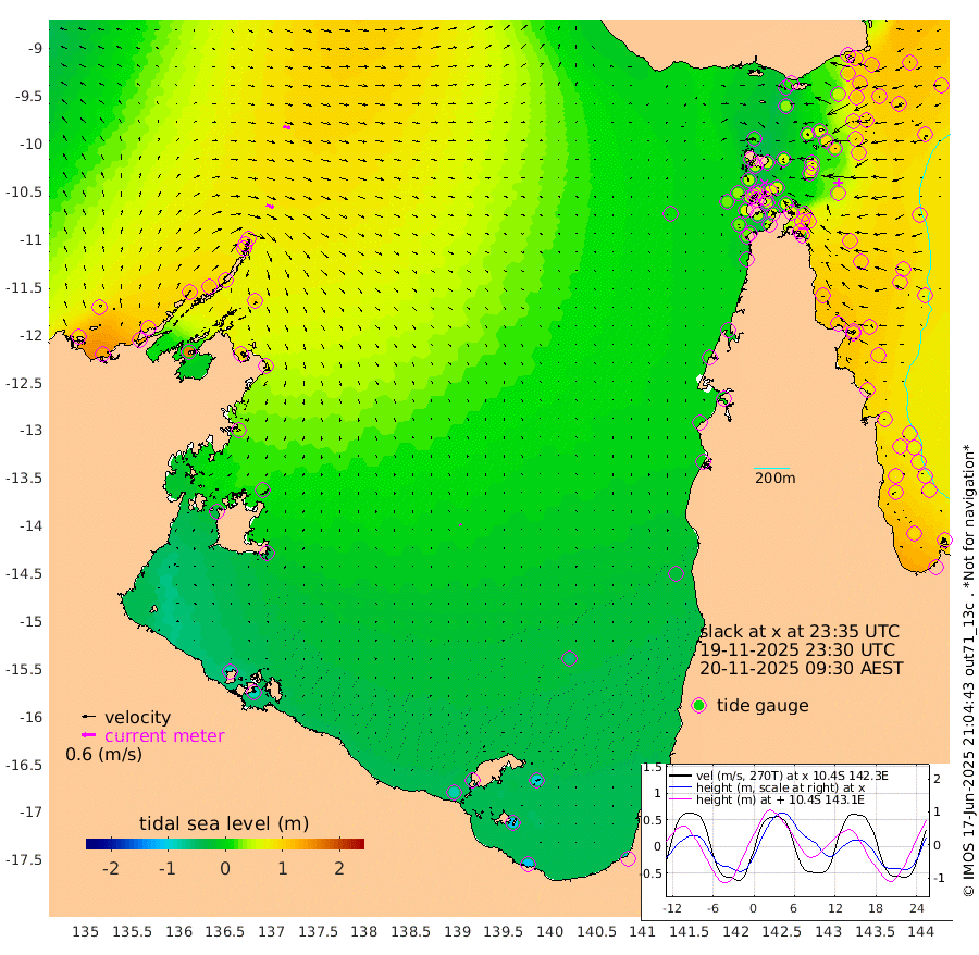 34cm/s 112T +3cm/s rms + 7cm/s -42T. ARA-GOC87 57m 5cm/s 138T +3cm/s rms + 2cm/s -2T. ARA-GOC87 60m 31cm/s 103T +2cm/s rms + 3cm/s 61T. ARA-GOC87 47m 99cm Daru 109cm Bobo Island 83cm Meer Island Barge 106cm Bramble Cay 109cm Unnamed Cay 110cm Pearce Cay 104cm Stephens Island 115cm Merrie England Shoals 106cm Mutacomal Reef 97cm Darnley Island Barge 94cm East Cay 94cm Yorke Island Barge 100cm Rennel Island 95cm Aureed Island 83cm Dungeness Reef 58cm Zagai Island 51cm Yam Island 12cm Dauan Island 16cm Saibai Island 35cm Phipi Reef 51cm Warrior Reef - West 21cm Mabuiag Island Barge 91cm Half Way Island 100cm Coconut Island 84cm Dugong Islet 72cm Poll Island 74cm Kirkcaldie Reef 55cm Suarji Island 66cm Sue Islet 43cm Hawkesbury Island 60cm Alert Patches 60cm Twin Island 42cm Badu Island 46cm St Pauls (Moa Island) 38cm Kubin (Moa Island) 42cm Ince Point 37cm Thursday Island 38cm Nardana Patches 39cm Turtle Head 48cm Round Island 38cm Goods Island 26cm Booby Island 31cm White Rocks Area 11cm Carpentaria 50cm Papou Point 61cm Bampfield Head 23cm Crab Island 23cm Red Wallis Island 38cm Packe Island 99cm Harrington Reef 29cm Herald Camp 3cm Sharp Point 42cm Red Island Point 57cm Possession Island 58cm Alpha Rock 79cm Frederick Point 109cm Wyborn Reef Light 103cm Tetley Island 78cm Triangle Reef 115cm Turtle Head Island 77cm Maclennan Cay 75cm Raine Island 100cm Mcsweeny Reef 100cm Collette Reef 83cm Shadwell Reef 111cm Hannibal Island 112cm Round Point 14cm Vrilya Point 96cm Cape Grenville 92cm Hicks Island 88cm Sir Charles Hardy Island 28cm Harvey Island 96cm Kay Reef 81cm Rocky Island 82cm Chapman Island 75cm Ham Reef 78cm Jubilee Reef 71cm Night Island 79cm Unnamed Reef No. 3 85cm Morris Island 75cm 1st 3 Mile Opening 78cm Creech Reef 79cm Fife Island 95cm Eden Reef 84cm Stanley Island 92cm Normanby River 93cm Yabooma Island 132cm Hutchison River 101cm Elcho Island 87cm North West Crocodile Island 89cm Cape Wessel 108cm Stevens Island 108cm Guluwuru Island 97cm Hopeful Bay 94cm Auster Point 83cm Two Island Bay 121cm Cadell Strait 161cm Mallison Island 91cm Melville Bay (Gove Harbour) 100cm Truant Island 63cm Cape Arnhem 31cm Cape Grey 18cm Hawk Island -31cm Milner Bay (Groote Eylandt) -41cm Cape Beatrice -90cm West Island -84cm Centre Island -72cm Mornington Island -81cm West Wellesley Islands -91cm Bountiful Island -108cm Albert River Mouth -106cm Sweers Island -100cm Karumba -56cm Nassau River Offshore -25cm Christmas Creek 7cm Archer River 9cm Boyd Point 7cm Weipa (Humbug Point) 17cm Pennefather River 5cm Cullen Point