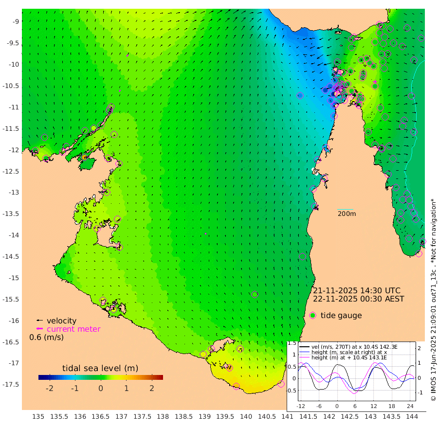 18cm/s 38T +3cm/s rms + 7cm/s -42T. ARA-GOC87 57m 12cm/s -16T +3cm/s rms + 2cm/s -2T. ARA-GOC87 60m 22cm/s 37T +2cm/s rms + 3cm/s 61T. ARA-GOC87 47m -3cm Daru 2cm Bobo Island -39cm Meer Island Barge -25cm Bramble Cay -16cm Unnamed Cay -11cm Pearce Cay -23cm Stephens Island -16cm Merrie England Shoals 1cm Mutacomal Reef -21cm Darnley Island Barge -42cm East Cay -10cm Yorke Island Barge -17cm Rennel Island -2cm Aureed Island -12cm Dungeness Reef 13cm Zagai Island -1cm Yam Island -8cm Dauan Island 4cm Saibai Island -17cm Phipi Reef 11cm Warrior Reef - West -33cm Mabuiag Island Barge -15cm Half Way Island -5cm Coconut Island -11cm Dugong Islet -2cm Poll Island -17cm Kirkcaldie Reef -10cm Suarji Island -1cm Sue Islet -145cm Hawkesbury Island -35cm Alert Patches -23cm Twin Island -115cm Badu Island -18cm St Pauls (Moa Island) -103cm Kubin (Moa Island) -49cm Ince Point -70cm Thursday Island -63cm Nardana Patches -100cm Turtle Head -126cm Round Island -143cm Goods Island -168cm Booby Island -151cm White Rocks Area -139cm Carpentaria -25cm Papou Point -192cm Bampfield Head -145cm Crab Island -147cm Red Wallis Island -117cm Packe Island -10cm Harrington Reef -167cm Herald Camp 8cm Sharp Point -93cm Red Island Point -71cm Possession Island -5cm Alpha Rock -15cm Frederick Point -1cm Wyborn Reef Light 0cm Tetley Island -28cm Triangle Reef -29cm Turtle Head Island -43cm Maclennan Cay -53cm Raine Island -17cm Mcsweeny Reef -20cm Collette Reef -37cm Shadwell Reef -20cm Hannibal Island -31cm Round Point -138cm Vrilya Point -35cm Cape Grenville -43cm Hicks Island -45cm Sir Charles Hardy Island -13cm Harvey Island -43cm Kay Reef -48cm Rocky Island -47cm Chapman Island -49cm Ham Reef -47cm Jubilee Reef -41cm Night Island -48cm Unnamed Reef No. 3 -50cm Morris Island -60cm 1st 3 Mile Opening -52cm Creech Reef -42cm Fife Island -54cm Eden Reef -53cm Stanley Island -49cm Normanby River -19cm Yabooma Island -8cm Hutchison River -2cm Elcho Island 0cm North West Crocodile Island 27cm Cape Wessel 21cm Stevens Island 42cm Guluwuru Island 9cm Hopeful Bay 9cm Auster Point 11cm Two Island Bay 25cm Cadell Strait 131cm Mallison Island 35cm Melville Bay (Gove Harbour) 33cm Truant Island 32cm Cape Arnhem 33cm Cape Grey 43cm Hawk Island 58cm Milner Bay (Groote Eylandt) 58cm Cape Beatrice 68cm West Island 63cm Centre Island 67cm Mornington Island 71cm West Wellesley Islands 72cm Bountiful Island 117cm Albert River Mouth 125cm Sweers Island 91cm Karumba 22cm Nassau River Offshore -28cm Christmas Creek -75cm Archer River -89cm Boyd Point -103cm Weipa (Humbug Point) -96cm Pennefather River -124cm Cullen Point