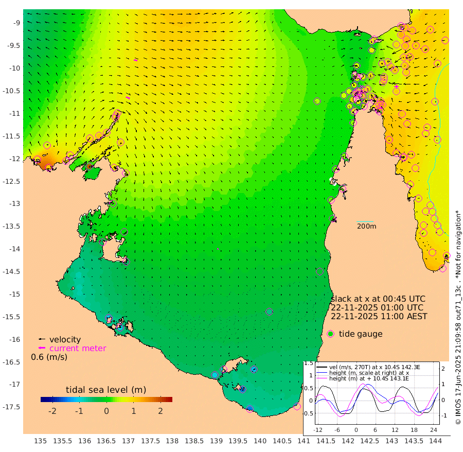37cm/s 114T +3cm/s rms + 7cm/s -42T. ARA-GOC87 57m 14cm/s 153T +3cm/s rms + 2cm/s -2T. ARA-GOC87 60m 31cm/s 105T +2cm/s rms + 3cm/s 61T. ARA-GOC87 47m 116cm Daru 118cm Bobo Island 80cm Meer Island Barge 103cm Bramble Cay 118cm Unnamed Cay 115cm Pearce Cay 107cm Stephens Island 119cm Merrie England Shoals 122cm Mutacomal Reef 102cm Darnley Island Barge 86cm East Cay 107cm Yorke Island Barge 111cm Rennel Island 106cm Aureed Island 105cm Dungeness Reef 97cm Zagai Island 92cm Yam Island 71cm Dauan Island 70cm Saibai Island 82cm Phipi Reef 94cm Warrior Reef - West 66cm Mabuiag Island Barge 104cm Half Way Island 117cm Coconut Island 104cm Dugong Islet 101cm Poll Island 99cm Kirkcaldie Reef 92cm Suarji Island 97cm Sue Islet 82cm Hawkesbury Island 96cm Alert Patches 96cm Twin Island 81cm Badu Island 89cm St Pauls (Moa Island) 80cm Kubin (Moa Island) 82cm Ince Point 76cm Thursday Island 78cm Nardana Patches 76cm Turtle Head 87cm Round Island 72cm Goods Island 59cm Booby Island 61cm White Rocks Area 38cm Carpentaria 84cm Papou Point 98cm Bampfield Head 47cm Crab Island 56cm Red Wallis Island 77cm Packe Island 114cm Harrington Reef 74cm Herald Camp 17cm Sharp Point 65cm Red Island Point 90cm Possession Island 92cm Alpha Rock 105cm Frederick Point 128cm Wyborn Reef Light 126cm Tetley Island 81cm Triangle Reef 131cm Turtle Head Island 76cm Maclennan Cay 66cm Raine Island 106cm Mcsweeny Reef 104cm Collette Reef 82cm Shadwell Reef 113cm Hannibal Island 108cm Round Point 34cm Vrilya Point 93cm Cape Grenville 88cm Hicks Island 90cm Sir Charles Hardy Island 27cm Harvey Island 87cm Kay Reef 73cm Rocky Island 73cm Chapman Island 67cm Ham Reef 71cm Jubilee Reef 66cm Night Island 68cm Unnamed Reef No. 3 75cm Morris Island 70cm 1st 3 Mile Opening 70cm Creech Reef 67cm Fife Island 83cm Eden Reef 75cm Stanley Island 79cm Normanby River 77cm Yabooma Island 110cm Hutchison River 78cm Elcho Island 64cm North West Crocodile Island 83cm Cape Wessel 94cm Stevens Island 110cm Guluwuru Island 81cm Hopeful Bay 84cm Auster Point 78cm Two Island Bay 108cm Cadell Strait 193cm Mallison Island 90cm Melville Bay (Gove Harbour) 102cm Truant Island 64cm Cape Arnhem 22cm Cape Grey 9cm Hawk Island -46cm Milner Bay (Groote Eylandt) -58cm Cape Beatrice -110cm West Island -104cm Centre Island -95cm Mornington Island -102cm West Wellesley Islands -118cm Bountiful Island -146cm Albert River Mouth -154cm Sweers Island -139cm Karumba -66cm Nassau River Offshore -22cm Christmas Creek 13cm Archer River 25cm Boyd Point 23cm Weipa (Humbug Point) 27cm Pennefather River 31cm Cullen Point