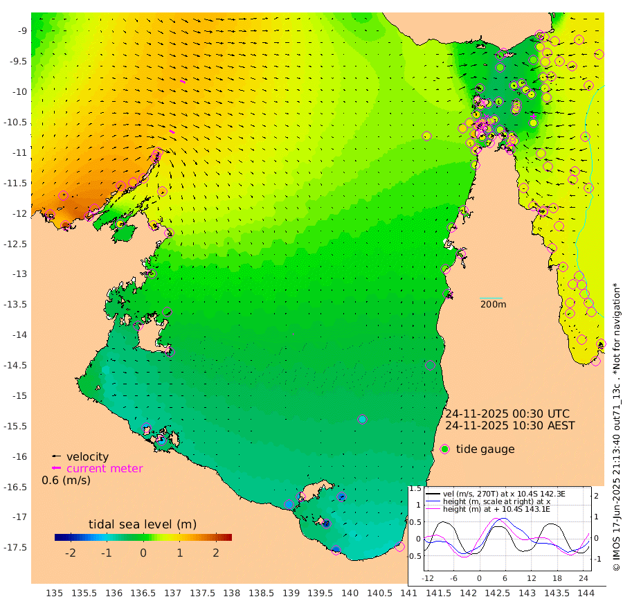 41cm/s 119T +3cm/s rms + 7cm/s -42T. ARA-GOC87 57m 5cm/s 104T +3cm/s rms + 2cm/s -2T. ARA-GOC87 60m 38cm/s 114T +2cm/s rms + 3cm/s 61T. ARA-GOC87 47m 59cm Daru 62cm Bobo Island 62cm Meer Island Barge 69cm Bramble Cay 71cm Unnamed Cay 68cm Pearce Cay 69cm Stephens Island 71cm Merrie England Shoals 62cm Mutacomal Reef 63cm Darnley Island Barge 62cm East Cay 59cm Yorke Island Barge 65cm Rennel Island 53cm Aureed Island 57cm Dungeness Reef 38cm Zagai Island 42cm Yam Island 21cm Dauan Island 8cm Saibai Island 23cm Phipi Reef 29cm Warrior Reef - West 30cm Mabuiag Island Barge 65cm Half Way Island 60cm Coconut Island 60cm Dugong Islet 50cm Poll Island 53cm Kirkcaldie Reef 36cm Suarji Island 39cm Sue Islet 90cm Hawkesbury Island 48cm Alert Patches 49cm Twin Island 79cm Badu Island 43cm St Pauls (Moa Island) 80cm Kubin (Moa Island) 51cm Ince Point 56cm Thursday Island 55cm Nardana Patches 68cm Turtle Head 85cm Round Island 89cm Goods Island 90cm Booby Island 89cm White Rocks Area 66cm Carpentaria 49cm Papou Point 118cm Bampfield Head 73cm Crab Island 80cm Red Wallis Island 78cm Packe Island 62cm Harrington Reef 87cm Herald Camp -3cm Sharp Point 53cm Red Island Point 61cm Possession Island 42cm Alpha Rock 53cm Frederick Point 68cm Wyborn Reef Light 65cm Tetley Island 52cm Triangle Reef 88cm Turtle Head Island 58cm Maclennan Cay 57cm Raine Island 62cm Mcsweeny Reef 59cm Collette Reef 56cm Shadwell Reef 68cm Hannibal Island 71cm Round Point 61cm Vrilya Point 62cm Cape Grenville 65cm Hicks Island 64cm Sir Charles Hardy Island 19cm Harvey Island 61cm Kay Reef 56cm Rocky Island 52cm Chapman Island 50cm Ham Reef 57cm Jubilee Reef 51cm Night Island 50cm Unnamed Reef No. 3 61cm Morris Island 65cm 1st 3 Mile Opening 58cm Creech Reef 47cm Fife Island 71cm Eden Reef 61cm Stanley Island 64cm Normanby River 165cm Yabooma Island 201cm Hutchison River 163cm Elcho Island 148cm North West Crocodile Island 116cm Cape Wessel 152cm Stevens Island 122cm Guluwuru Island 130cm Hopeful Bay 130cm Auster Point 134cm Two Island Bay 167cm Cadell Strait 87cm Mallison Island 102cm Melville Bay (Gove Harbour) 115cm Truant Island 66cm Cape Arnhem 23cm Cape Grey 0cm Hawk Island -44cm Milner Bay (Groote Eylandt) -59cm Cape Beatrice -117cm West Island -112cm Centre Island -126cm Mornington Island -129cm West Wellesley Islands -147cm Bountiful Island -153cm Albert River Mouth -176cm Sweers Island -158cm Karumba -96cm Nassau River Offshore -49cm Christmas Creek 2cm Archer River 23cm Boyd Point 27cm Weipa (Humbug Point) 35cm Pennefather River 47cm Cullen Point