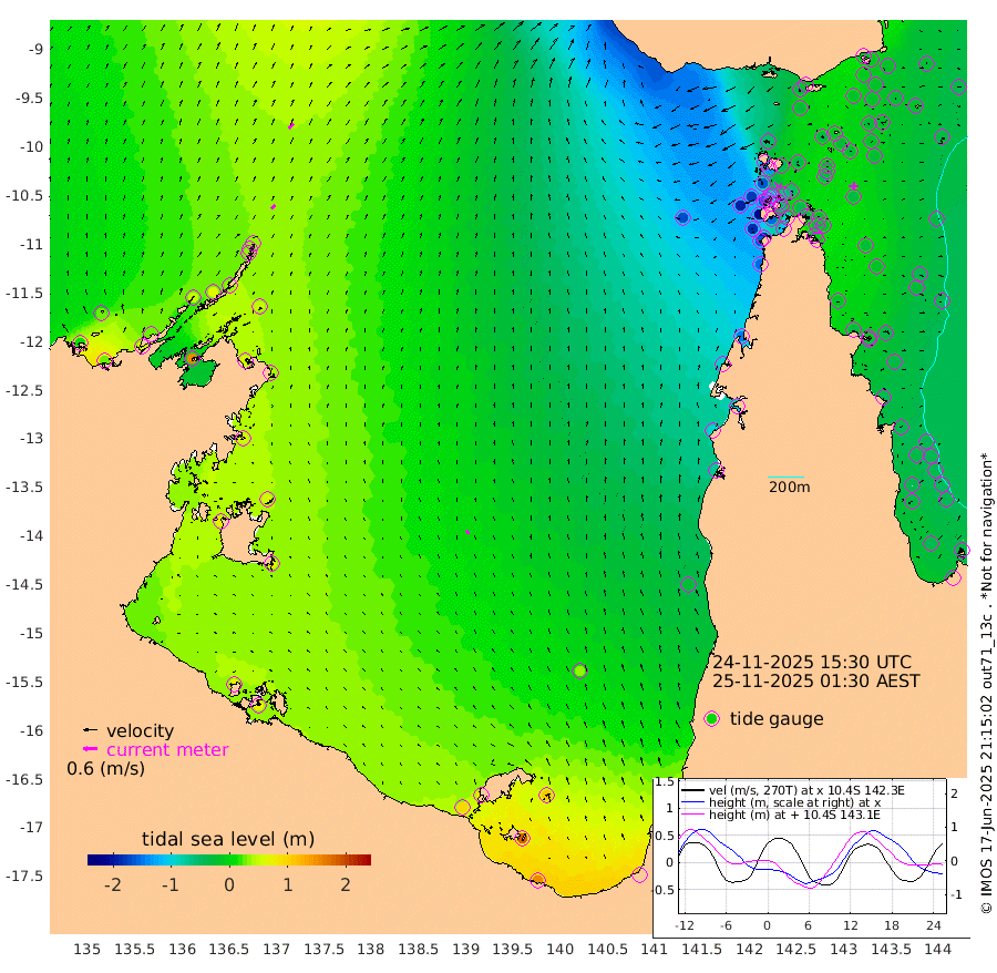 22cm/s 47T +3cm/s rms + 7cm/s -42T. ARA-GOC87 57m 17cm/s -23T +3cm/s rms + 2cm/s -2T. ARA-GOC87 60m 29cm/s 43T +2cm/s rms + 3cm/s 61T. ARA-GOC87 47m -15cm Daru -13cm Bobo Island -31cm Meer Island Barge -23cm Bramble Cay -19cm Unnamed Cay -22cm Pearce Cay -28cm Stephens Island -18cm Merrie England Shoals -15cm Mutacomal Reef -21cm Darnley Island Barge -38cm East Cay -16cm Yorke Island Barge -29cm Rennel Island -19cm Aureed Island -28cm Dungeness Reef -14cm Zagai Island -32cm Yam Island -31cm Dauan Island -18cm Saibai Island -27cm Phipi Reef -17cm Warrior Reef - West -55cm Mabuiag Island Barge -29cm Half Way Island -27cm Coconut Island -30cm Dugong Islet -30cm Poll Island -39cm Kirkcaldie Reef -43cm Suarji Island -19cm Sue Islet -161cm Hawkesbury Island -61cm Alert Patches -57cm Twin Island -130cm Badu Island -52cm St Pauls (Moa Island) -131cm Kubin (Moa Island) -80cm Ince Point -99cm Thursday Island -93cm Nardana Patches -123cm Turtle Head -145cm Round Island -163cm Goods Island -189cm Booby Island -178cm White Rocks Area -172cm Carpentaria -55cm Papou Point -210cm Bampfield Head -160cm Crab Island -180cm Red Wallis Island -154cm Packe Island -34cm Harrington Reef -190cm Herald Camp -2cm Sharp Point -109cm Red Island Point -91cm Possession Island -38cm Alpha Rock -44cm Frederick Point -20cm Wyborn Reef Light -22cm Tetley Island -32cm Triangle Reef -36cm Turtle Head Island -42cm Maclennan Cay -42cm Raine Island -23cm Mcsweeny Reef -20cm Collette Reef -28cm Shadwell Reef -19cm Hannibal Island -30cm Round Point -151cm Vrilya Point -34cm Cape Grenville -38cm Hicks Island -45cm Sir Charles Hardy Island -12cm Harvey Island -35cm Kay Reef -38cm Rocky Island -39cm Chapman Island -40cm Ham Reef -37cm Jubilee Reef -38cm Night Island -43cm Unnamed Reef No. 3 -41cm Morris Island -47cm 1st 3 Mile Opening -44cm Creech Reef -37cm Fife Island -41cm Eden Reef -41cm Stanley Island -39cm Normanby River 12cm Yabooma Island 25cm Hutchison River 25cm Elcho Island 26cm North West Crocodile Island 32cm Cape Wessel 45cm Stevens Island 61cm Guluwuru Island 36cm Hopeful Bay 30cm Auster Point 27cm Two Island Bay 58cm Cadell Strait 156cm Mallison Island 54cm Melville Bay (Gove Harbour) 49cm Truant Island 43cm Cape Arnhem 56cm Cape Grey 59cm Hawk Island 72cm Milner Bay (Groote Eylandt) 68cm Cape Beatrice 74cm West Island 69cm Centre Island 87cm Mornington Island 90cm West Wellesley Islands 110cm Bountiful Island 157cm Albert River Mouth 183cm Sweers Island 135cm Karumba 32cm Nassau River Offshore -25cm Christmas Creek -71cm Archer River -95cm Boyd Point -105cm Weipa (Humbug Point) -95cm Pennefather River -143cm Cullen Point