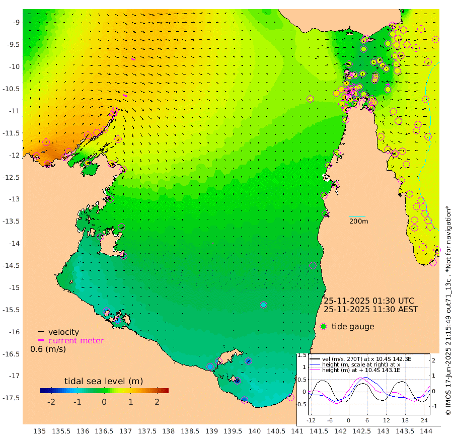 42cm/s 117T +3cm/s rms + 7cm/s -42T. ARA-GOC87 57m 8cm/s 139T +3cm/s rms + 2cm/s -2T. ARA-GOC87 60m 38cm/s 112T +2cm/s rms + 3cm/s 61T. ARA-GOC87 47m 64cm Daru 66cm Bobo Island 62cm Meer Island Barge 68cm Bramble Cay 73cm Unnamed Cay 71cm Pearce Cay 70cm Stephens Island 69cm Merrie England Shoals 65cm Mutacomal Reef 67cm Darnley Island Barge 60cm East Cay 65cm Yorke Island Barge 67cm Rennel Island 59cm Aureed Island 64cm Dungeness Reef 53cm Zagai Island 56cm Yam Island 47cm Dauan Island 34cm Saibai Island 41cm Phipi Reef 48cm Warrior Reef - West 45cm Mabuiag Island Barge 69cm Half Way Island 64cm Coconut Island 67cm Dugong Islet 59cm Poll Island 61cm Kirkcaldie Reef 48cm Suarji Island 51cm Sue Islet 94cm Hawkesbury Island 56cm Alert Patches 59cm Twin Island 86cm Badu Island 56cm St Pauls (Moa Island) 87cm Kubin (Moa Island) 60cm Ince Point 65cm Thursday Island 64cm Nardana Patches 75cm Turtle Head 85cm Round Island 92cm Goods Island 91cm Booby Island 90cm White Rocks Area 67cm Carpentaria 58cm Papou Point 114cm Bampfield Head 72cm Crab Island 82cm Red Wallis Island 82cm Packe Island 65cm Harrington Reef 90cm Herald Camp 2cm Sharp Point 56cm Red Island Point 64cm Possession Island 51cm Alpha Rock 60cm Frederick Point 71cm Wyborn Reef Light 69cm Tetley Island 54cm Triangle Reef 88cm Turtle Head Island 59cm Maclennan Cay 56cm Raine Island 64cm Mcsweeny Reef 60cm Collette Reef 56cm Shadwell Reef 67cm Hannibal Island 68cm Round Point 59cm Vrilya Point 60cm Cape Grenville 64cm Hicks Island 68cm Sir Charles Hardy Island 19cm Harvey Island 58cm Kay Reef 54cm Rocky Island 52cm Chapman Island 50cm Ham Reef 57cm Jubilee Reef 49cm Night Island 49cm Unnamed Reef No. 3 58cm Morris Island 65cm 1st 3 Mile Opening 57cm Creech Reef 46cm Fife Island 69cm Eden Reef 59cm Stanley Island 61cm Normanby River 150cm Yabooma Island 182cm Hutchison River 144cm Elcho Island 130cm North West Crocodile Island 113cm Cape Wessel 138cm Stevens Island 127cm Guluwuru Island 116cm Hopeful Bay 121cm Auster Point 127cm Two Island Bay 161cm Cadell Strait 113cm Mallison Island 103cm Melville Bay (Gove Harbour) 117cm Truant Island 68cm Cape Arnhem 22cm Cape Grey -4cm Hawk Island -49cm Milner Bay (Groote Eylandt) -63cm Cape Beatrice -120cm West Island -118cm Centre Island -127cm Mornington Island -127cm West Wellesley Islands -145cm Bountiful Island -157cm Albert River Mouth -186cm Sweers Island -165cm Karumba -91cm Nassau River Offshore -42cm Christmas Creek 4cm Archer River 28cm Boyd Point 31cm Weipa (Humbug Point) 32cm Pennefather River 49cm Cullen Point
