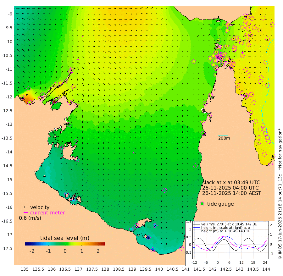 32cm/s 113T +3cm/s rms + 7cm/s -42T. ARA-GOC87 57m 26cm/s 160T +3cm/s rms + 2cm/s -2T. ARA-GOC87 60m 22cm/s 108T +2cm/s rms + 3cm/s 61T. ARA-GOC87 47m 93cm Daru 85cm Bobo Island 72cm Meer Island Barge 82cm Bramble Cay 94cm Unnamed Cay 85cm Pearce Cay 86cm Stephens Island 90cm Merrie England Shoals 94cm Mutacomal Reef 87cm Darnley Island Barge 71cm East Cay 90cm Yorke Island Barge 87cm Rennel Island 81cm Aureed Island 85cm Dungeness Reef 83cm Zagai Island 85cm Yam Island 90cm Dauan Island 82cm Saibai Island 71cm Phipi Reef 88cm Warrior Reef - West 67cm Mabuiag Island Barge 86cm Half Way Island 83cm Coconut Island 90cm Dugong Islet 82cm Poll Island 83cm Kirkcaldie Reef 68cm Suarji Island 84cm Sue Islet 81cm Hawkesbury Island 74cm Alert Patches 77cm Twin Island 77cm Badu Island 78cm St Pauls (Moa Island) 81cm Kubin (Moa Island) 73cm Ince Point 71cm Thursday Island 72cm Nardana Patches 74cm Turtle Head 71cm Round Island 74cm Goods Island 66cm Booby Island 63cm White Rocks Area 51cm Carpentaria 68cm Papou Point 82cm Bampfield Head 51cm Crab Island 65cm Red Wallis Island 77cm Packe Island 84cm Harrington Reef 81cm Herald Camp 16cm Sharp Point 52cm Red Island Point 63cm Possession Island 78cm Alpha Rock 81cm Frederick Point 96cm Wyborn Reef Light 95cm Tetley Island 68cm Triangle Reef 97cm Turtle Head Island 69cm Maclennan Cay 60cm Raine Island 86cm Mcsweeny Reef 82cm Collette Reef 72cm Shadwell Reef 88cm Hannibal Island 81cm Round Point 44cm Vrilya Point 75cm Cape Grenville 74cm Hicks Island 88cm Sir Charles Hardy Island 23cm Harvey Island 71cm Kay Reef 64cm Rocky Island 64cm Chapman Island 62cm Ham Reef 67cm Jubilee Reef 58cm Night Island 60cm Unnamed Reef No. 3 65cm Morris Island 68cm 1st 3 Mile Opening 65cm Creech Reef 63cm Fife Island 74cm Eden Reef 69cm Stanley Island 69cm Normanby River 36cm Yabooma Island 43cm Hutchison River 21cm Elcho Island 11cm North West Crocodile Island 56cm Cape Wessel 46cm Stevens Island 93cm Guluwuru Island 33cm Hopeful Bay 46cm Auster Point 52cm Two Island Bay 74cm Cadell Strait 226cm Mallison Island 67cm Melville Bay (Gove Harbour) 79cm Truant Island 50cm Cape Arnhem 8cm Cape Grey -14cm Hawk Island -57cm Milner Bay (Groote Eylandt) -65cm Cape Beatrice -105cm West Island -108cm Centre Island -97cm Mornington Island -89cm West Wellesley Islands -113cm Bountiful Island -151cm Albert River Mouth -180cm Sweers Island -154cm Karumba -50cm Nassau River Offshore 0cm Christmas Creek 22cm Archer River 41cm Boyd Point 40cm Weipa (Humbug Point) 29cm Pennefather River 46cm Cullen Point