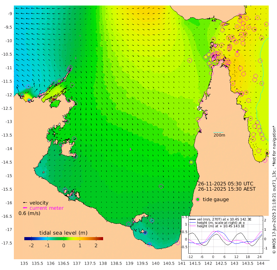 10cm/s 123T +3cm/s rms + 7cm/s -42T. ARA-GOC87 57m 34cm/s 163T +3cm/s rms + 2cm/s -2T. ARA-GOC87 60m 5cm/s -129T +2cm/s rms + 3cm/s 61T. ARA-GOC87 47m 99cm Daru 85cm Bobo Island 63cm Meer Island Barge 77cm Bramble Cay 95cm Unnamed Cay 79cm Pearce Cay 84cm Stephens Island 94cm Merrie England Shoals 104cm Mutacomal Reef 84cm Darnley Island Barge 66cm East Cay 89cm Yorke Island Barge 89cm Rennel Island 82cm Aureed Island 87cm Dungeness Reef 88cm Zagai Island 93cm Yam Island 98cm Dauan Island 96cm Saibai Island 79cm Phipi Reef 99cm Warrior Reef - West 75cm Mabuiag Island Barge 86cm Half Way Island 88cm Coconut Island 93cm Dugong Islet 88cm Poll Island 92cm Kirkcaldie Reef 78cm Suarji Island 94cm Sue Islet 75cm Hawkesbury Island 86cm Alert Patches 87cm Twin Island 69cm Badu Island 87cm St Pauls (Moa Island) 77cm Kubin (Moa Island) 81cm Ince Point 77cm Thursday Island 78cm Nardana Patches 76cm Turtle Head 70cm Round Island 66cm Goods Island 60cm Booby Island 55cm White Rocks Area 57cm Carpentaria 71cm Papou Point 74cm Bampfield Head 49cm Crab Island 65cm Red Wallis Island 81cm Packe Island 90cm Harrington Reef 84cm Herald Camp 25cm Sharp Point 56cm Red Island Point 66cm Possession Island 93cm Alpha Rock 91cm Frederick Point 102cm Wyborn Reef Light 102cm Tetley Island 65cm Triangle Reef 91cm Turtle Head Island 64cm Maclennan Cay 51cm Raine Island 88cm Mcsweeny Reef 85cm Collette Reef 69cm Shadwell Reef 88cm Hannibal Island 79cm Round Point 48cm Vrilya Point 75cm Cape Grenville 68cm Hicks Island 84cm Sir Charles Hardy Island 23cm Harvey Island 70cm Kay Reef 59cm Rocky Island 60cm Chapman Island 58cm Ham Reef 60cm Jubilee Reef 55cm Night Island 58cm Unnamed Reef No. 3 58cm Morris Island 55cm 1st 3 Mile Opening 59cm Creech Reef 64cm Fife Island 60cm Eden Reef 64cm Stanley Island 61cm Normanby River -78cm Yabooma Island -94cm Hutchison River -94cm Elcho Island -98cm North West Crocodile Island -19cm Cape Wessel -54cm Stevens Island 17cm Guluwuru Island -55cm Hopeful Bay -40cm Auster Point -37cm Two Island Bay -42cm Cadell Strait 209cm Mallison Island 1cm Melville Bay (Gove Harbour) 8cm Truant Island 7cm Cape Arnhem -20cm Cape Grey -28cm Hawk Island -57cm Milner Bay (Groote Eylandt) -56cm Cape Beatrice -68cm West Island -73cm Centre Island -56cm Mornington Island -48cm West Wellesley Islands -76cm Bountiful Island -128cm Albert River Mouth -151cm Sweers Island -120cm Karumba -8cm Nassau River Offshore 36cm Christmas Creek 41cm Archer River 54cm Boyd Point 50cm Weipa (Humbug Point) 37cm Pennefather River 55cm Cullen Point
