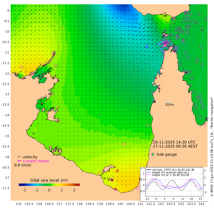 7cm/s 38T +3cm/s rms + 7cm/s -42T. ARA-GOC87 57m 17cm/s -68T +3cm/s rms + 2cm/s -2T. ARA-GOC87 60m 15cm/s 37T +2cm/s rms + 3cm/s 61T. ARA-GOC87 47m -33cm Daru -31cm Bobo Island -19cm Meer Island Barge -24cm Bramble Cay -33cm Unnamed Cay -25cm Pearce Cay -31cm Stephens Island -36cm Merrie England Shoals -42cm Mutacomal Reef -25cm Darnley Island Barge -27cm East Cay -28cm Yorke Island Barge -38cm Rennel Island -30cm Aureed Island -28cm Dungeness Reef -33cm Zagai Island -42cm Yam Island -17cm Dauan Island -31cm Saibai Island 4cm Phipi Reef -27cm Warrior Reef - West -51cm Mabuiag Island Barge -36cm Half Way Island -45cm Coconut Island -40cm Dugong Islet -41cm Poll Island -46cm Kirkcaldie Reef -46cm Suarji Island -43cm Sue Islet -87cm Hawkesbury Island -58cm Alert Patches -60cm Twin Island -72cm Badu Island -54cm St Pauls (Moa Island) -74cm Kubin (Moa Island) -64cm Ince Point -72cm Thursday Island -68cm Nardana Patches -71cm Turtle Head -78cm Round Island -85cm Goods Island -104cm Booby Island -103cm White Rocks Area -133cm Carpentaria -56cm Papou Point -125cm Bampfield Head -89cm Crab Island -108cm Red Wallis Island -88cm Packe Island -50cm Harrington Reef -97cm Herald Camp -12cm Sharp Point -68cm Red Island Point -59cm Possession Island -62cm Alpha Rock -56cm Frederick Point -48cm Wyborn Reef Light -51cm Tetley Island -26cm Triangle Reef -44cm Turtle Head Island -28cm Maclennan Cay -22cm Raine Island -34cm Mcsweeny Reef -30cm Collette Reef -22cm Shadwell Reef -29cm Hannibal Island -30cm Round Point -94cm Vrilya Point -32cm Cape Grenville -25cm Hicks Island -35cm Sir Charles Hardy Island -9cm Harvey Island -32cm Kay Reef -22cm Rocky Island -25cm Chapman Island -28cm Ham Reef -24cm Jubilee Reef -21cm Night Island -31cm Unnamed Reef No. 3 -24cm Morris Island -21cm 1st 3 Mile Opening -25cm Creech Reef -26cm Fife Island -17cm Eden Reef -26cm Stanley Island -24cm Normanby River 76cm Yabooma Island 95cm Hutchison River 84cm Elcho Island 85cm North West Crocodile Island 21cm Cape Wessel 65cm Stevens Island 35cm Guluwuru Island 65cm Hopeful Bay 45cm Auster Point 49cm Two Island Bay 88cm Cadell Strait -13cm Mallison Island 42cm Melville Bay (Gove Harbour) 32cm Truant Island 26cm Cape Arnhem 38cm Cape Grey 50cm Hawk Island 51cm Milner Bay (Groote Eylandt) 53cm Cape Beatrice 48cm West Island 49cm Centre Island 100cm Mornington Island 93cm West Wellesley Islands 140cm Bountiful Island 189cm Albert River Mouth 210cm Sweers Island 184cm Karumba 71cm Nassau River Offshore 22cm Christmas Creek -19cm Archer River -49cm Boyd Point -39cm Weipa (Humbug Point) -51cm Pennefather River -83cm Cullen Point