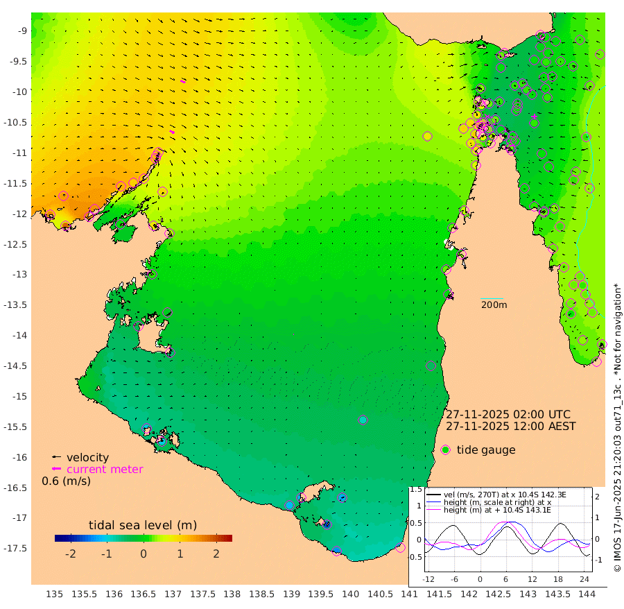 34cm/s 120T +3cm/s rms + 7cm/s -42T. ARA-GOC87 57m 4cm/s 80T +3cm/s rms + 2cm/s -2T. ARA-GOC87 60m 35cm/s 115T +2cm/s rms + 3cm/s 61T. ARA-GOC87 47m 5cm Daru 12cm Bobo Island 27cm Meer Island Barge 18cm Bramble Cay 12cm Unnamed Cay 21cm Pearce Cay 18cm Stephens Island 4cm Merrie England Shoals 0cm Mutacomal Reef 18cm Darnley Island Barge 24cm East Cay 14cm Yorke Island Barge 13cm Rennel Island 13cm Aureed Island 16cm Dungeness Reef 15cm Zagai Island 19cm Yam Island 27cm Dauan Island 17cm Saibai Island 11cm Phipi Reef 10cm Warrior Reef - West 31cm Mabuiag Island Barge 16cm Half Way Island 11cm Coconut Island 16cm Dugong Islet 15cm Poll Island 13cm Kirkcaldie Reef 16cm Suarji Island 9cm Sue Islet 88cm Hawkesbury Island 19cm Alert Patches 23cm Twin Island 80cm Badu Island 24cm St Pauls (Moa Island) 72cm Kubin (Moa Island) 35cm Ince Point 45cm Thursday Island 43cm Nardana Patches 60cm Turtle Head 69cm Round Island 89cm Goods Island 98cm Booby Island 95cm White Rocks Area 78cm Carpentaria 32cm Papou Point 107cm Bampfield Head 75cm Crab Island 87cm Red Wallis Island 68cm Packe Island 10cm Harrington Reef 83cm Herald Camp -8cm Sharp Point 50cm Red Island Point 38cm Possession Island 10cm Alpha Rock 15cm Frederick Point 8cm Wyborn Reef Light 8cm Tetley Island 22cm Triangle Reef 28cm Turtle Head Island 28cm Maclennan Cay 30cm Raine Island 11cm Mcsweeny Reef 8cm Collette Reef 17cm Shadwell Reef 10cm Hannibal Island 16cm Round Point 63cm Vrilya Point 14cm Cape Grenville 25cm Hicks Island 32cm Sir Charles Hardy Island 6cm Harvey Island 17cm Kay Reef 25cm Rocky Island 26cm Chapman Island 26cm Ham Reef 28cm Jubilee Reef 20cm Night Island 23cm Unnamed Reef No. 3 27cm Morris Island 37cm 1st 3 Mile Opening 29cm Creech Reef 14cm Fife Island 36cm Eden Reef 24cm Stanley Island 27cm Normanby River 155cm Yabooma Island 180cm Hutchison River 147cm Elcho Island 137cm North West Crocodile Island 108cm Cape Wessel 126cm Stevens Island 103cm Guluwuru Island 107cm Hopeful Bay 115cm Auster Point 121cm Two Island Bay 150cm Cadell Strait 13cm Mallison Island 83cm Melville Bay (Gove Harbour) 96cm Truant Island 53cm Cape Arnhem 18cm Cape Grey -12cm Hawk Island -41cm Milner Bay (Groote Eylandt) -54cm Cape Beatrice -100cm West Island -99cm Centre Island -121cm Mornington Island -116cm West Wellesley Islands -125cm Bountiful Island -137cm Albert River Mouth -166cm Sweers Island -149cm Karumba -90cm Nassau River Offshore -47cm Christmas Creek 1cm Archer River 26cm Boyd Point 32cm Weipa (Humbug Point) 25cm Pennefather River 52cm Cullen Point