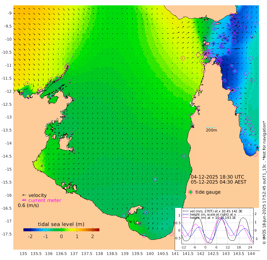 8cm/s 159T +3cm/s rms + 7cm/s -42T. ARA-GOC87 57m 20cm/s 13T +3cm/s rms + 2cm/s -2T. ARA-GOC87 60m 14cm/s 150T +2cm/s rms + 3cm/s 61T. ARA-GOC87 47m -174cm Daru -170cm Bobo Island -103cm Meer Island Barge -135cm Bramble Cay -166cm Unnamed Cay -162cm Pearce Cay -156cm Stephens Island -162cm Merrie England Shoals -176cm Mutacomal Reef -147cm Darnley Island Barge -112cm East Cay -158cm Yorke Island Barge -161cm Rennel Island -163cm Aureed Island -165cm Dungeness Reef -142cm Zagai Island -144cm Yam Island -100cm Dauan Island -92cm Saibai Island -133cm Phipi Reef -153cm Warrior Reef - West -55cm Mabuiag Island Barge -159cm Half Way Island -160cm Coconut Island -167cm Dugong Islet -149cm Poll Island -155cm Kirkcaldie Reef -143cm Suarji Island -142cm Sue Islet 12cm Hawkesbury Island -114cm Alert Patches -120cm Twin Island 0cm Badu Island -118cm St Pauls (Moa Island) -32cm Kubin (Moa Island) -80cm Ince Point -56cm Thursday Island -63cm Nardana Patches -38cm Turtle Head -21cm Round Island 12cm Goods Island 53cm Booby Island 38cm White Rocks Area 73cm Carpentaria -98cm Papou Point 31cm Bampfield Head 55cm Crab Island 45cm Red Wallis Island -18cm Packe Island -174cm Harrington Reef -3cm Herald Camp -37cm Sharp Point -26cm Red Island Point -79cm Possession Island -117cm Alpha Rock -142cm Frederick Point -166cm Wyborn Reef Light -161cm Tetley Island -96cm Triangle Reef -161cm Turtle Head Island -102cm Maclennan Cay -69cm Raine Island -150cm Mcsweeny Reef -141cm Collette Reef -100cm Shadwell Reef -155cm Hannibal Island -134cm Round Point 71cm Vrilya Point -124cm Cape Grenville -117cm Hicks Island -122cm Sir Charles Hardy Island -39cm Harvey Island -106cm Kay Reef -89cm Rocky Island -76cm Chapman Island -72cm Ham Reef -82cm Jubilee Reef -82cm Night Island -73cm Unnamed Reef No. 3 -90cm Morris Island -79cm 1st 3 Mile Opening -84cm Creech Reef -84cm Fife Island -95cm Eden Reef -91cm Stanley Island -102cm Normanby River 59cm Yabooma Island 44cm Hutchison River 60cm Elcho Island 60cm North West Crocodile Island 23cm Cape Wessel 43cm Stevens Island -31cm Guluwuru Island 41cm Hopeful Bay 32cm Auster Point 32cm Two Island Bay 21cm Cadell Strait -87cm Mallison Island -18cm Melville Bay (Gove Harbour) -15cm Truant Island -19cm Cape Arnhem -20cm Cape Grey -25cm Hawk Island -5cm Milner Bay (Groote Eylandt) -13cm Cape Beatrice -13cm West Island -13cm Centre Island -73cm Mornington Island -70cm West Wellesley Islands -95cm Bountiful Island -70cm Albert River Mouth -65cm Sweers Island -78cm Karumba -76cm Nassau River Offshore -66cm Christmas Creek -11cm Archer River 3cm Boyd Point 3cm Weipa (Humbug Point) 38cm Pennefather River 45cm Cullen Point
