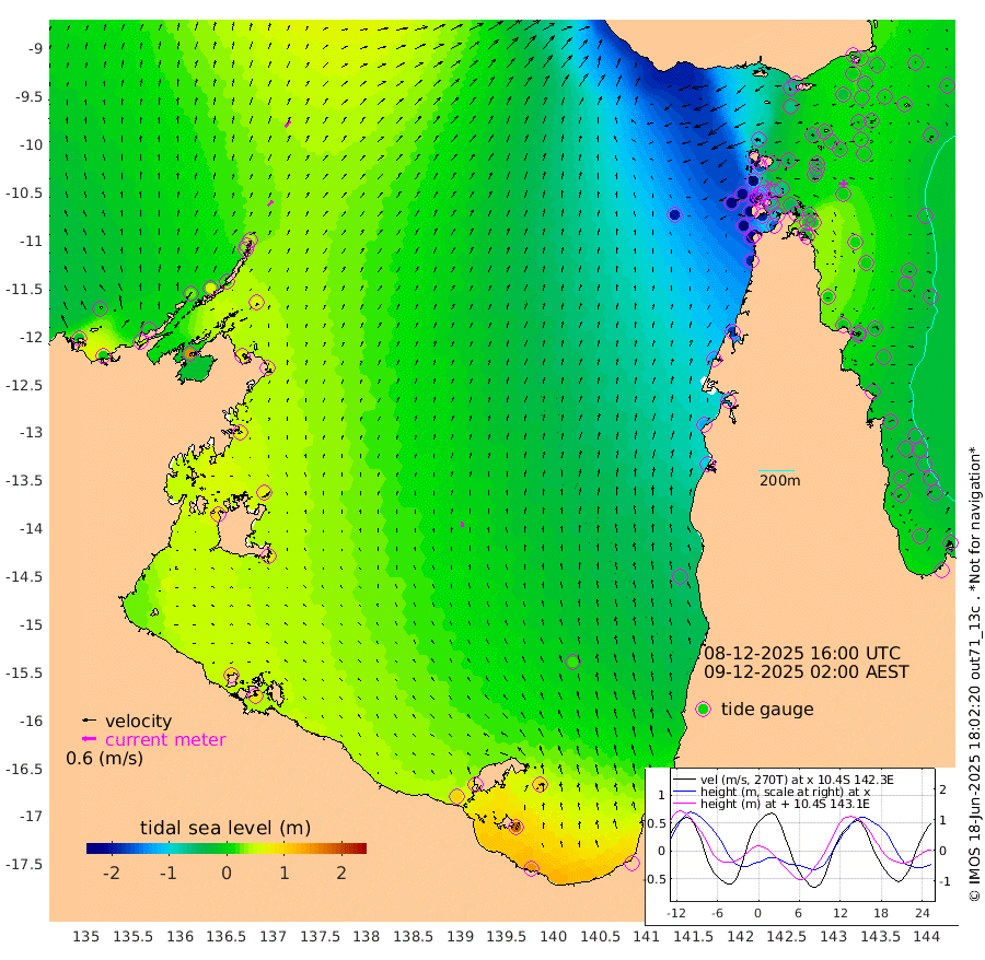 28cm/s 44T +3cm/s rms + 7cm/s -42T. ARA-GOC87 57m 22cm/s -11T +3cm/s rms + 2cm/s -2T. ARA-GOC87 60m 35cm/s 42T +2cm/s rms + 3cm/s 61T. ARA-GOC87 47m 1cm Daru 11cm Bobo Island -9cm Meer Island Barge -4cm Bramble Cay -2cm Unnamed Cay 4cm Pearce Cay 1cm Stephens Island -2cm Merrie England Shoals -4cm Mutacomal Reef 6cm Darnley Island Barge -15cm East Cay 7cm Yorke Island Barge -7cm Rennel Island 10cm Aureed Island -13cm Dungeness Reef -15cm Zagai Island -37cm Yam Island -64cm Dauan Island -55cm Saibai Island -60cm Phipi Reef -24cm Warrior Reef - West -92cm Mabuiag Island Barge -4cm Half Way Island -12cm Coconut Island -7cm Dugong Islet -21cm Poll Island -33cm Kirkcaldie Reef -39cm Suarji Island -18cm Sue Islet -221cm Hawkesbury Island -72cm Alert Patches -61cm Twin Island -192cm Badu Island -60cm St Pauls (Moa Island) -164cm Kubin (Moa Island) -98cm Ince Point -123cm Thursday Island -116cm Nardana Patches -157cm Turtle Head -179cm Round Island -210cm Goods Island -239cm Booby Island -223cm White Rocks Area -197cm Carpentaria -65cm Papou Point -243cm Bampfield Head -206cm Crab Island -225cm Red Wallis Island -188cm Packe Island -6cm Harrington Reef -226cm Herald Camp -6cm Sharp Point -151cm Red Island Point -101cm Possession Island -41cm Alpha Rock -37cm Frederick Point -6cm Wyborn Reef Light -11cm Tetley Island -17cm Triangle Reef -14cm Turtle Head Island -21cm Maclennan Cay -29cm Raine Island 1cm Mcsweeny Reef -2cm Collette Reef -14cm Shadwell Reef 3cm Hannibal Island -10cm Round Point -192cm Vrilya Point -13cm Cape Grenville -15cm Hicks Island -26cm Sir Charles Hardy Island -3cm Harvey Island -20cm Kay Reef -22cm Rocky Island -28cm Chapman Island -28cm Ham Reef -23cm Jubilee Reef -17cm Night Island -29cm Unnamed Reef No. 3 -22cm Morris Island -28cm 1st 3 Mile Opening -24cm Creech Reef -9cm Fife Island -21cm Eden Reef -22cm Stanley Island -15cm Normanby River -12cm Yabooma Island -3cm Hutchison River 1cm Elcho Island -3cm North West Crocodile Island 39cm Cape Wessel 28cm Stevens Island 67cm Guluwuru Island 21cm Hopeful Bay 30cm Auster Point 32cm Two Island Bay 44cm Cadell Strait 156cm Mallison Island 61cm Melville Bay (Gove Harbour) 61cm Truant Island 55cm Cape Arnhem 63cm Cape Grey 69cm Hawk Island 89cm Milner Bay (Groote Eylandt) 81cm Cape Beatrice 94cm West Island 90cm Centre Island 93cm Mornington Island 99cm West Wellesley Islands 102cm Bountiful Island 144cm Albert River Mouth 184cm Sweers Island 121cm Karumba 21cm Nassau River Offshore -43cm Christmas Creek -102cm Archer River -120cm Boyd Point -138cm Weipa (Humbug Point) -125cm Pennefather River -175cm Cullen Point