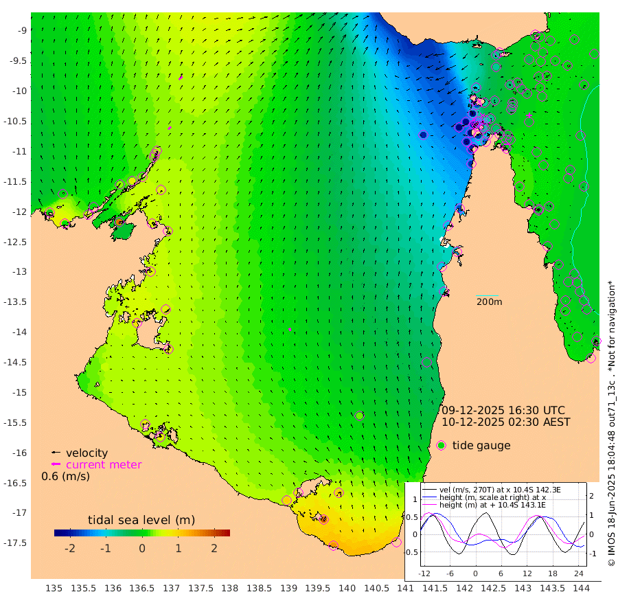 26cm/s 49T +3cm/s rms + 7cm/s -42T. ARA-GOC87 57m 20cm/s -15T +3cm/s rms + 2cm/s -2T. ARA-GOC87 60m 34cm/s 45T +2cm/s rms + 3cm/s 61T. ARA-GOC87 47m -9cm Daru 3cm Bobo Island -2cm Meer Island Barge -2cm Bramble Cay -8cm Unnamed Cay 0cm Pearce Cay -1cm Stephens Island -6cm Merrie England Shoals -16cm Mutacomal Reef 5cm Darnley Island Barge -8cm East Cay 1cm Yorke Island Barge -14cm Rennel Island 4cm Aureed Island -23cm Dungeness Reef -30cm Zagai Island -54cm Yam Island -74cm Dauan Island -66cm Saibai Island -70cm Phipi Reef -38cm Warrior Reef - West -102cm Mabuiag Island Barge -13cm Half Way Island -21cm Coconut Island -19cm Dugong Islet -35cm Poll Island -47cm Kirkcaldie Reef -54cm Suarji Island -33cm Sue Islet -218cm Hawkesbury Island -83cm Alert Patches -75cm Twin Island -187cm Badu Island -76cm St Pauls (Moa Island) -166cm Kubin (Moa Island) -108cm Ince Point -130cm Thursday Island -123cm Nardana Patches -156cm Turtle Head -180cm Round Island -201cm Goods Island -226cm Booby Island -213cm White Rocks Area -189cm Carpentaria -78cm Papou Point -233cm Bampfield Head -194cm Crab Island -215cm Red Wallis Island -184cm Packe Island -19cm Harrington Reef -224cm Herald Camp -14cm Sharp Point -151cm Red Island Point -110cm Possession Island -56cm Alpha Rock -50cm Frederick Point -18cm Wyborn Reef Light -25cm Tetley Island -13cm Triangle Reef -26cm Turtle Head Island -15cm Maclennan Cay -16cm Raine Island -3cm Mcsweeny Reef -3cm Collette Reef -8cm Shadwell Reef 1cm Hannibal Island -6cm Round Point -182cm Vrilya Point -10cm Cape Grenville -10cm Hicks Island -20cm Sir Charles Hardy Island -2cm Harvey Island -13cm Kay Reef -12cm Rocky Island -14cm Chapman Island -16cm Ham Reef -12cm Jubilee Reef -8cm Night Island -16cm Unnamed Reef No. 3 -11cm Morris Island -17cm 1st 3 Mile Opening -14cm Creech Reef 4cm Fife Island -7cm Eden Reef -12cm Stanley Island -6cm Normanby River -3cm Yabooma Island 11cm Hutchison River 13cm Elcho Island 6cm North West Crocodile Island 43cm Cape Wessel 35cm Stevens Island 72cm Guluwuru Island 29cm Hopeful Bay 35cm Auster Point 33cm Two Island Bay 54cm Cadell Strait 165cm Mallison Island 66cm Melville Bay (Gove Harbour) 66cm Truant Island 59cm Cape Arnhem 63cm Cape Grey 67cm Hawk Island 83cm Milner Bay (Groote Eylandt) 76cm Cape Beatrice 83cm West Island 79cm Centre Island 92cm Mornington Island 98cm West Wellesley Islands 102cm Bountiful Island 146cm Albert River Mouth 183cm Sweers Island 123cm Karumba 27cm Nassau River Offshore -34cm Christmas Creek -88cm Archer River -108cm Boyd Point -122cm Weipa (Humbug Point) -115cm Pennefather River -165cm Cullen Point