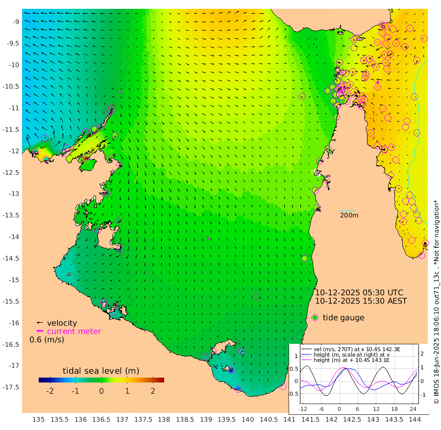 13cm/s 109T +3cm/s rms + 7cm/s -42T. ARA-GOC87 57m 36cm/s 163T +3cm/s rms + 2cm/s -2T. ARA-GOC87 60m 1cm/s 119T +2cm/s rms + 3cm/s 61T. ARA-GOC87 47m 115cm Daru 114cm Bobo Island 85cm Meer Island Barge 96cm Bramble Cay 107cm Unnamed Cay 113cm Pearce Cay 111cm Stephens Island 104cm Merrie England Shoals 110cm Mutacomal Reef 109cm Darnley Island Barge 93cm East Cay 113cm Yorke Island Barge 110cm Rennel Island 112cm Aureed Island 106cm Dungeness Reef 94cm Zagai Island 99cm Yam Island 87cm Dauan Island 87cm Saibai Island 73cm Phipi Reef 106cm Warrior Reef - West 61cm Mabuiag Island Barge 109cm Half Way Island 104cm Coconut Island 115cm Dugong Islet 99cm Poll Island 105cm Kirkcaldie Reef 83cm Suarji Island 103cm Sue Islet 60cm Hawkesbury Island 82cm Alert Patches 90cm Twin Island 47cm Badu Island 88cm St Pauls (Moa Island) 66cm Kubin (Moa Island) 74cm Ince Point 67cm Thursday Island 68cm Nardana Patches 61cm Turtle Head 50cm Round Island 46cm Goods Island 35cm Booby Island 32cm White Rocks Area 35cm Carpentaria 78cm Papou Point 45cm Bampfield Head 29cm Crab Island 43cm Red Wallis Island 63cm Packe Island 116cm Harrington Reef 67cm Herald Camp 22cm Sharp Point 57cm Red Island Point 65cm Possession Island 86cm Alpha Rock 102cm Frederick Point 109cm Wyborn Reef Light 108cm Tetley Island 82cm Triangle Reef 115cm Turtle Head Island 87cm Maclennan Cay 67cm Raine Island 107cm Mcsweeny Reef 99cm Collette Reef 81cm Shadwell Reef 104cm Hannibal Island 99cm Round Point 28cm Vrilya Point 91cm Cape Grenville 92cm Hicks Island 104cm Sir Charles Hardy Island 30cm Harvey Island 85cm Kay Reef 78cm Rocky Island 76cm Chapman Island 76cm Ham Reef 78cm Jubilee Reef 72cm Night Island 76cm Unnamed Reef No. 3 78cm Morris Island 71cm 1st 3 Mile Opening 79cm Creech Reef 89cm Fife Island 84cm Eden Reef 80cm Stanley Island 88cm Normanby River -66cm Yabooma Island -75cm Hutchison River -83cm Elcho Island -84cm North West Crocodile Island 0cm Cape Wessel -50cm Stevens Island 36cm Guluwuru Island -50cm Hopeful Bay -24cm Auster Point -14cm Two Island Bay -7cm Cadell Strait 174cm Mallison Island 16cm Melville Bay (Gove Harbour) 24cm Truant Island 17cm Cape Arnhem -11cm Cape Grey -26cm Hawk Island -64cm Milner Bay (Groote Eylandt) -61cm Cape Beatrice -77cm West Island -83cm Centre Island -61cm Mornington Island -57cm West Wellesley Islands -81cm Bountiful Island -147cm Albert River Mouth -165cm Sweers Island -128cm Karumba -12cm Nassau River Offshore 30cm Christmas Creek 31cm Archer River 44cm Boyd Point 36cm Weipa (Humbug Point) 21cm Pennefather River 36cm Cullen Point