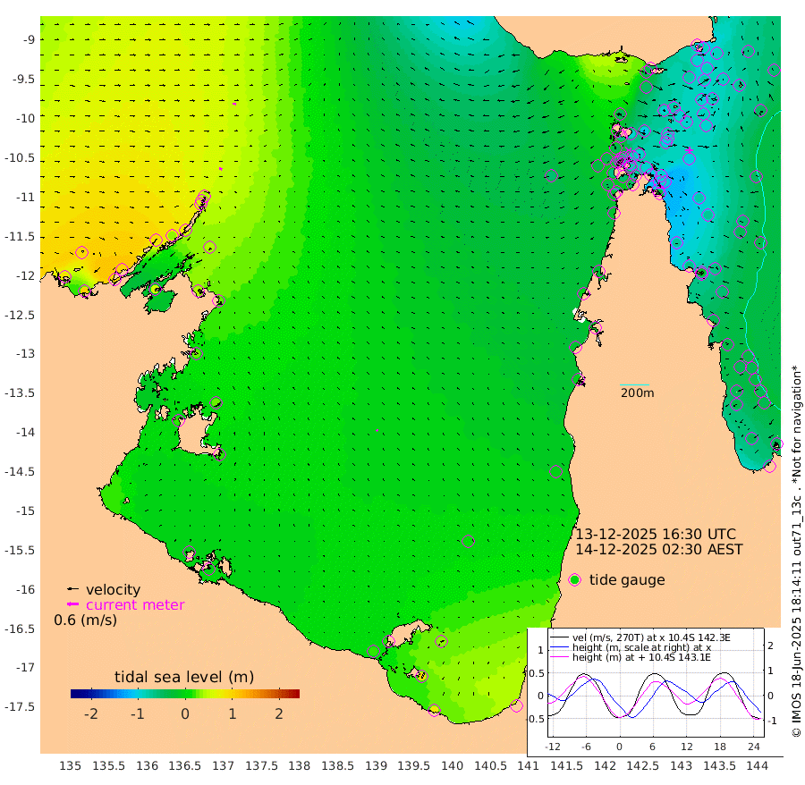 16cm/s 106T +3cm/s rms + 7cm/s -42T. ARA-GOC87 57m 10cm/s -45T +3cm/s rms + 2cm/s -2T. ARA-GOC87 60m 18cm/s 90T +2cm/s rms + 3cm/s 61T. ARA-GOC87 47m -91cm Daru -89cm Bobo Island -48cm Meer Island Barge -63cm Bramble Cay -87cm Unnamed Cay -80cm Pearce Cay -83cm Stephens Island -84cm Merrie England Shoals -97cm Mutacomal Reef -74cm Darnley Island Barge -56cm East Cay -83cm Yorke Island Barge -91cm Rennel Island -88cm Aureed Island -91cm Dungeness Reef -82cm Zagai Island -95cm Yam Island -44cm Dauan Island -49cm Saibai Island -48cm Phipi Reef -80cm Warrior Reef - West -50cm Mabuiag Island Barge -94cm Half Way Island -94cm Coconut Island -102cm Dugong Islet -93cm Poll Island -101cm Kirkcaldie Reef -98cm Suarji Island -88cm Sue Islet -43cm Hawkesbury Island -85cm Alert Patches -93cm Twin Island -30cm Badu Island -90cm St Pauls (Moa Island) -61cm Kubin (Moa Island) -76cm Ince Point -70cm Thursday Island -71cm Nardana Patches -56cm Turtle Head -60cm Round Island -40cm Goods Island -36cm Booby Island -43cm White Rocks Area -55cm Carpentaria -84cm Papou Point -64cm Bampfield Head -23cm Crab Island -43cm Red Wallis Island -60cm Packe Island -112cm Harrington Reef -70cm Herald Camp -27cm Sharp Point -49cm Red Island Point -78cm Possession Island -91cm Alpha Rock -98cm Frederick Point -96cm Wyborn Reef Light -97cm Tetley Island -48cm Triangle Reef -97cm Turtle Head Island -58cm Maclennan Cay -30cm Raine Island -79cm Mcsweeny Reef -69cm Collette Reef -44cm Shadwell Reef -75cm Hannibal Island -64cm Round Point -20cm Vrilya Point -67cm Cape Grenville -60cm Hicks Island -67cm Sir Charles Hardy Island -22cm Harvey Island -54cm Kay Reef -41cm Rocky Island -30cm Chapman Island -35cm Ham Reef -38cm Jubilee Reef -40cm Night Island -36cm Unnamed Reef No. 3 -42cm Morris Island -38cm 1st 3 Mile Opening -42cm Creech Reef -36cm Fife Island -39cm Eden Reef -44cm Stanley Island -50cm Normanby River 90cm Yabooma Island 100cm Hutchison River 95cm Elcho Island 91cm North West Crocodile Island 41cm Cape Wessel 87cm Stevens Island 36cm Guluwuru Island 82cm Hopeful Bay 60cm Auster Point 55cm Two Island Bay 96cm Cadell Strait 57cm Mallison Island 43cm Melville Bay (Gove Harbour) 40cm Truant Island 27cm Cape Arnhem 24cm Cape Grey 24cm Hawk Island 21cm Milner Bay (Groote Eylandt) 17cm Cape Beatrice 0cm West Island -2cm Centre Island 21cm Mornington Island 19cm West Wellesley Islands 36cm Bountiful Island 77cm Albert River Mouth 94cm Sweers Island 69cm Karumba 13cm Nassau River Offshore -6cm Christmas Creek -1cm Archer River -19cm Boyd Point -11cm Weipa (Humbug Point) -1cm Pennefather River -28cm Cullen Point