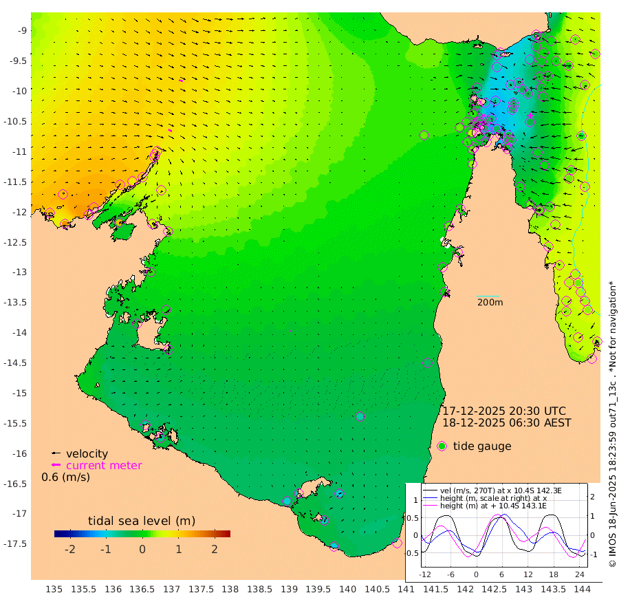 27cm/s 117T +3cm/s rms + 7cm/s -42T. ARA-GOC87 57m 5cm/s 35T +3cm/s rms + 2cm/s -2T. ARA-GOC87 60m 27cm/s 112T +2cm/s rms + 3cm/s 61T. ARA-GOC87 47m -25cm Daru -19cm Bobo Island 30cm Meer Island Barge 24cm Bramble Cay 1cm Unnamed Cay -9cm Pearce Cay 5cm Stephens Island 11cm Merrie England Shoals -21cm Mutacomal Reef 8cm Darnley Island Barge 30cm East Cay -12cm Yorke Island Barge -14cm Rennel Island -26cm Aureed Island -39cm Dungeness Reef -66cm Zagai Island -70cm Yam Island -83cm Dauan Island -79cm Saibai Island -78cm Phipi Reef -78cm Warrior Reef - West -53cm Mabuiag Island Barge -17cm Half Way Island -30cm Coconut Island -33cm Dugong Islet -53cm Poll Island -47cm Kirkcaldie Reef -76cm Suarji Island -50cm Sue Islet 16cm Hawkesbury Island -49cm Alert Patches -56cm Twin Island -1cm Badu Island -69cm St Pauls (Moa Island) -13cm Kubin (Moa Island) -46cm Ince Point -36cm Thursday Island -39cm Nardana Patches -18cm Turtle Head 6cm Round Island 14cm Goods Island 29cm Booby Island 18cm White Rocks Area 28cm Carpentaria -51cm Papou Point 50cm Bampfield Head 30cm Crab Island 15cm Red Wallis Island -7cm Packe Island -35cm Harrington Reef 9cm Herald Camp -31cm Sharp Point -15cm Red Island Point -26cm Possession Island -49cm Alpha Rock -45cm Frederick Point -18cm Wyborn Reef Light -26cm Tetley Island 15cm Triangle Reef -4cm Turtle Head Island 19cm Maclennan Cay 41cm Raine Island -1cm Mcsweeny Reef 9cm Collette Reef 28cm Shadwell Reef 15cm Hannibal Island 27cm Round Point 35cm Vrilya Point 25cm Cape Grenville 26cm Hicks Island 20cm Sir Charles Hardy Island 6cm Harvey Island 39cm Kay Reef 36cm Rocky Island 40cm Chapman Island 39cm Ham Reef 38cm Jubilee Reef 30cm Night Island 39cm Unnamed Reef No. 3 41cm Morris Island 41cm 1st 3 Mile Opening 37cm Creech Reef 35cm Fife Island 53cm Eden Reef 44cm Stanley Island 42cm Normanby River 122cm Yabooma Island 146cm Hutchison River 129cm Elcho Island 114cm North West Crocodile Island 84cm Cape Wessel 121cm Stevens Island 82cm Guluwuru Island 115cm Hopeful Bay 100cm Auster Point 99cm Two Island Bay 121cm Cadell Strait 114cm Mallison Island 74cm Melville Bay (Gove Harbour) 81cm Truant Island 46cm Cape Arnhem 21cm Cape Grey 8cm Hawk Island -22cm Milner Bay (Groote Eylandt) -34cm Cape Beatrice -75cm West Island -72cm Centre Island -85cm Mornington Island -93cm West Wellesley Islands -105cm Bountiful Island -103cm Albert River Mouth -93cm Sweers Island -100cm Karumba -76cm Nassau River Offshore -50cm Christmas Creek 0cm Archer River 6cm Boyd Point 8cm Weipa (Humbug Point) 30cm Pennefather River 18cm Cullen Point